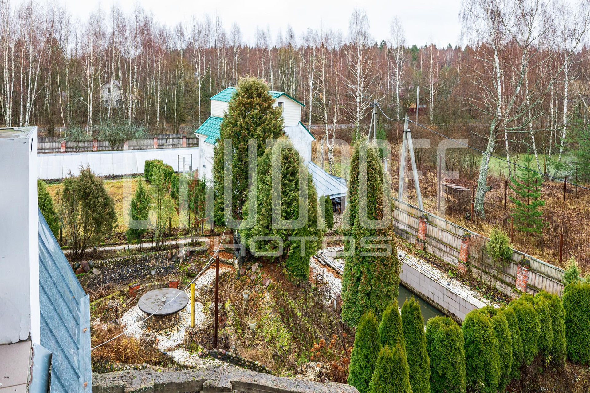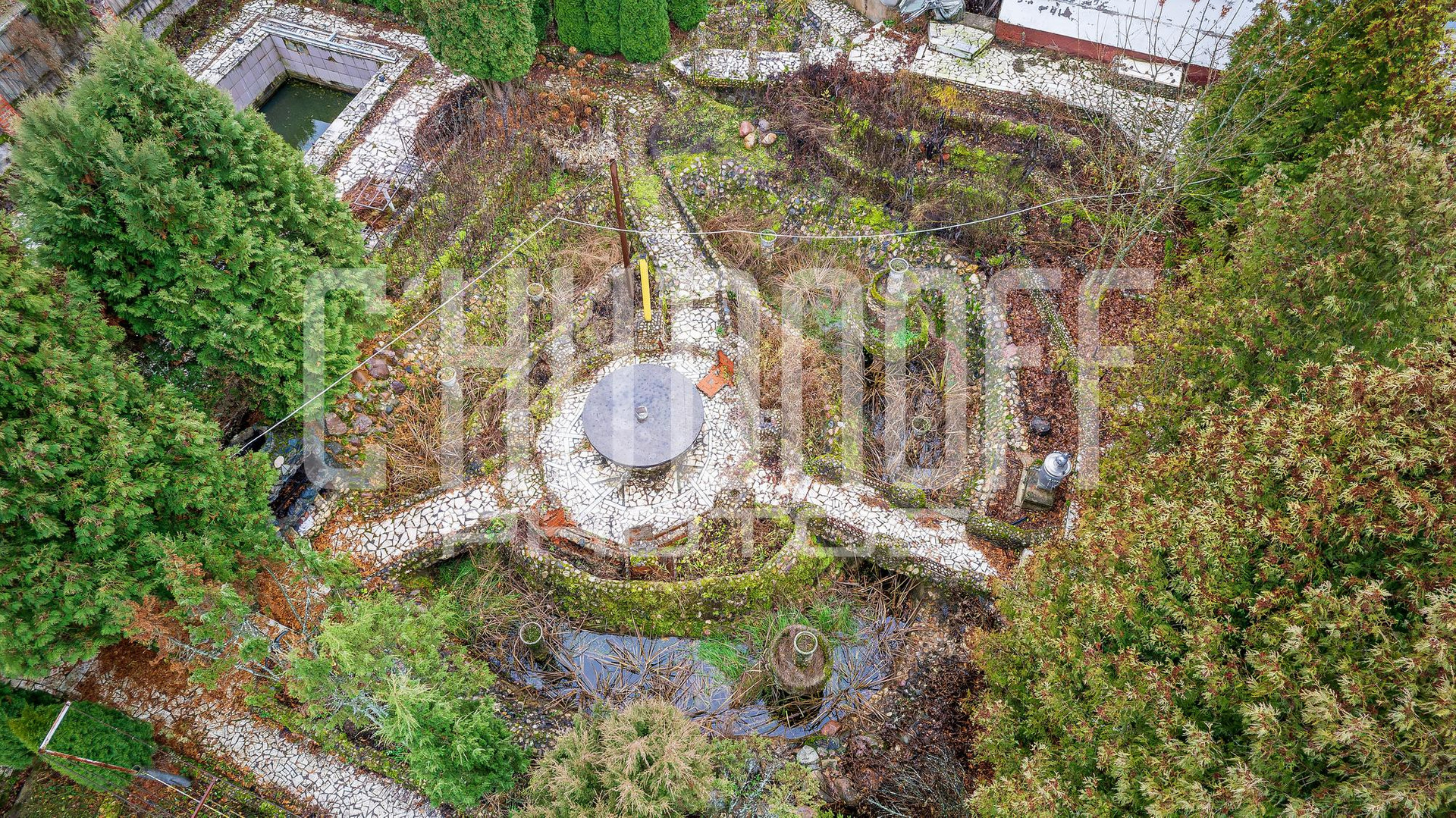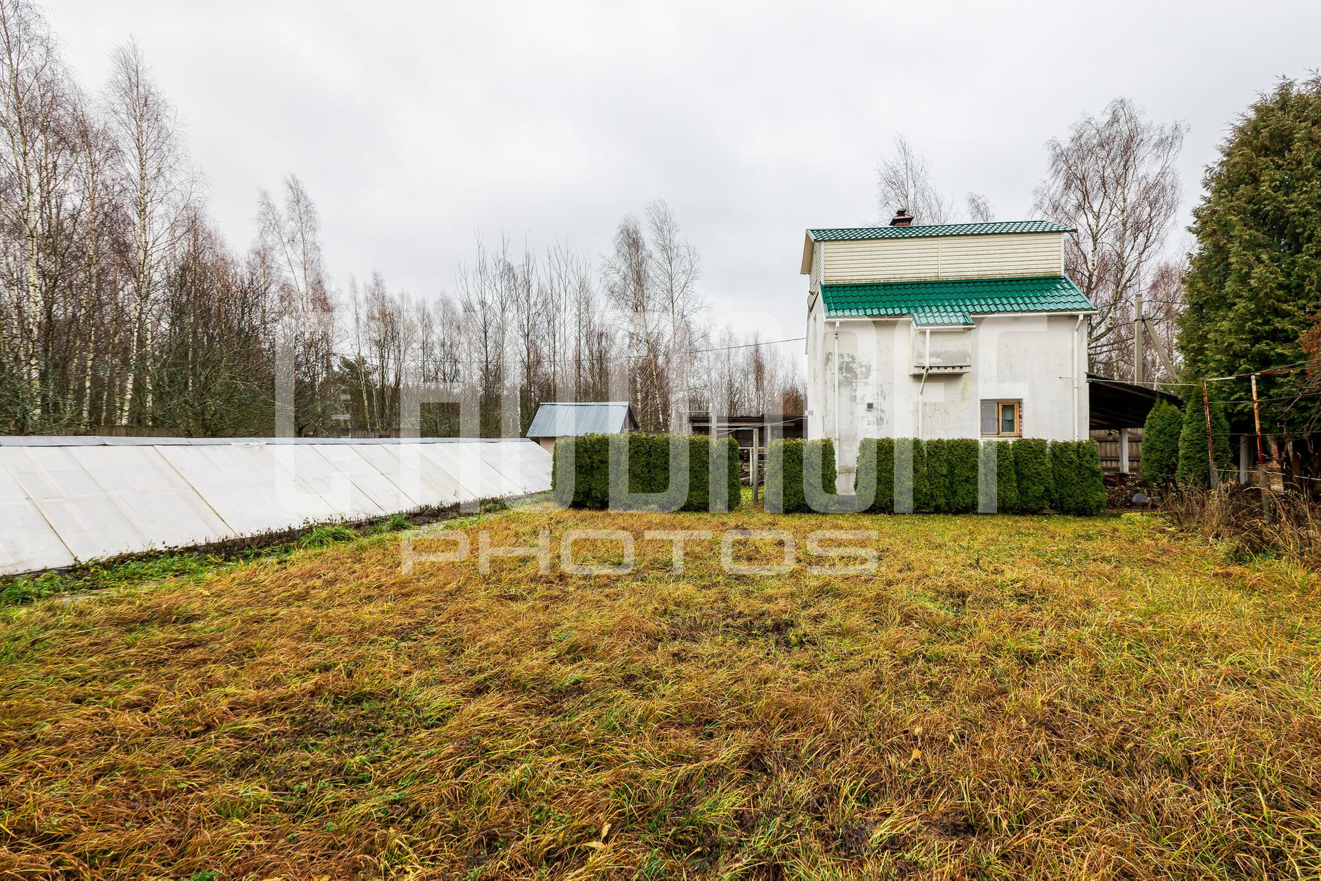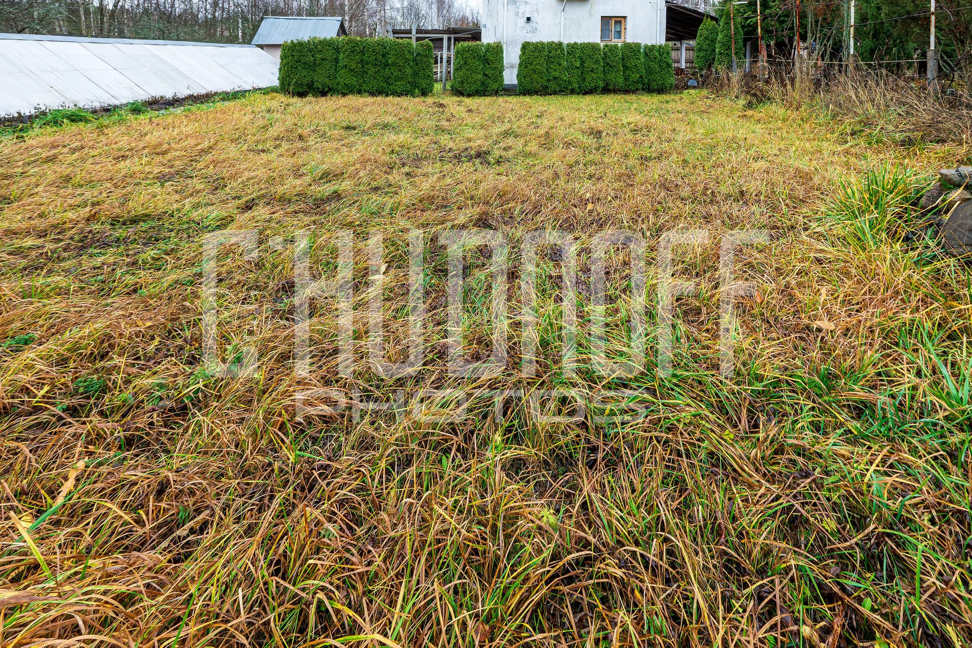 Земельный участок с малыми архитектурными формами, взрослыми туями, теплицей.