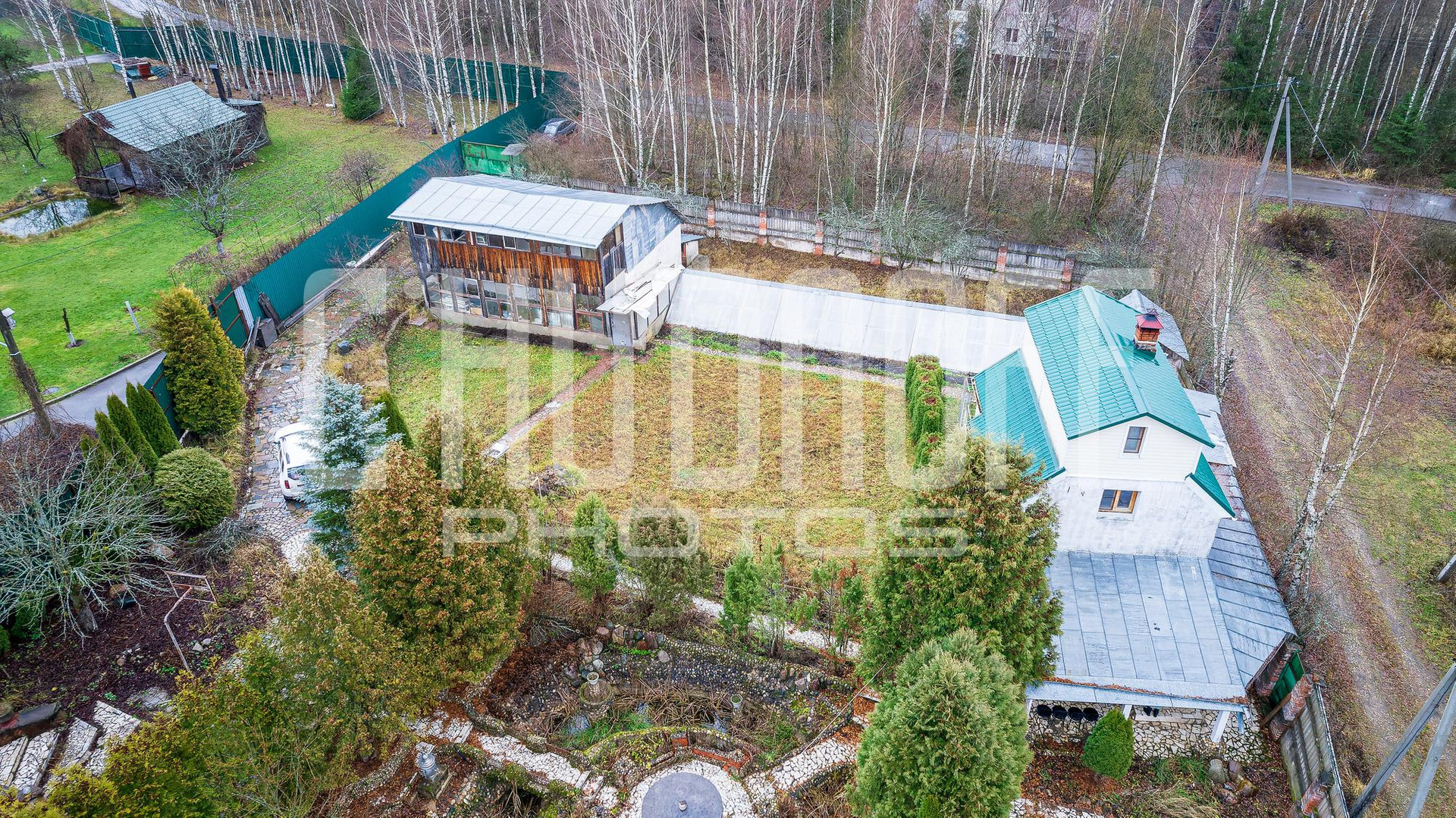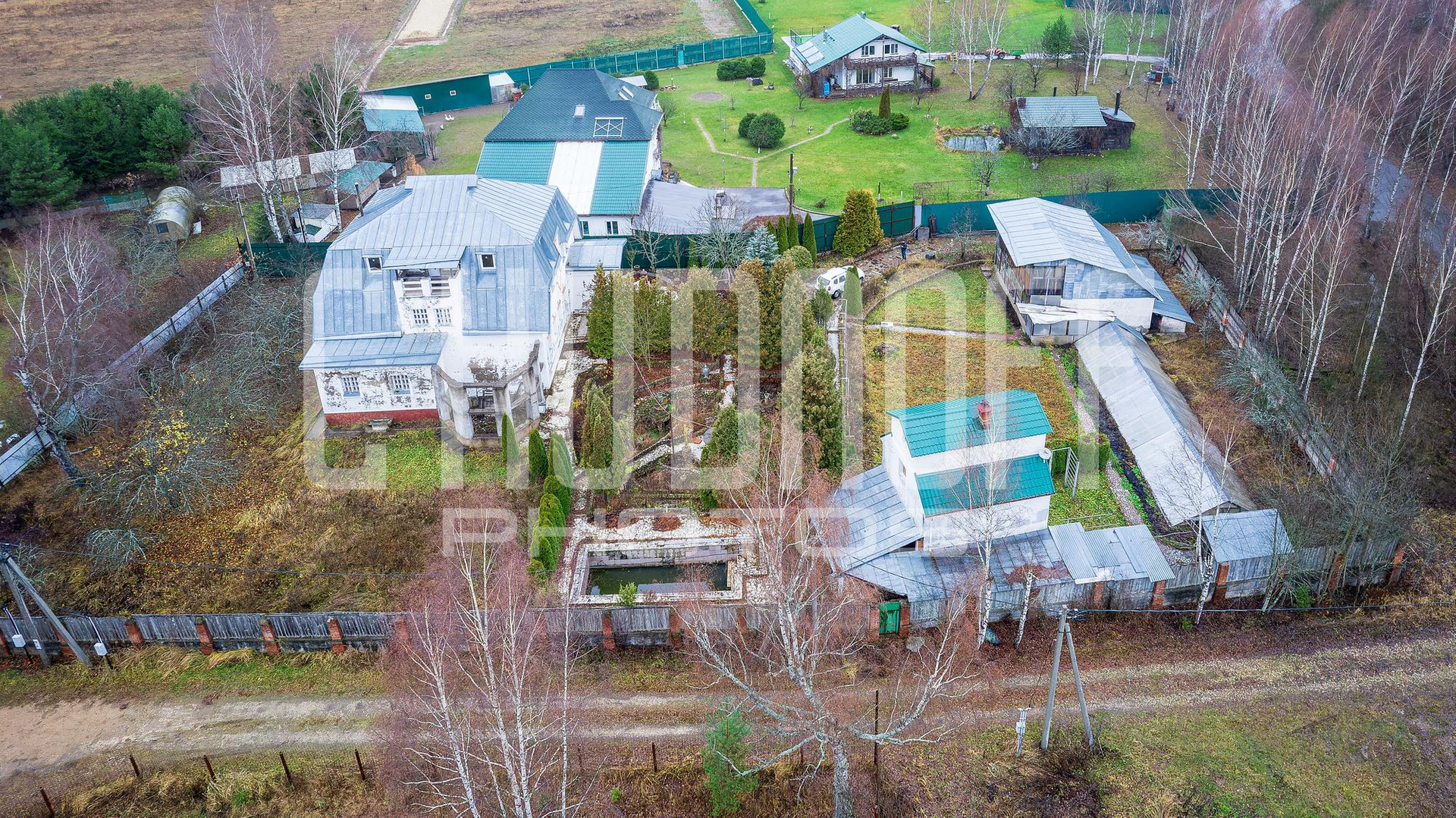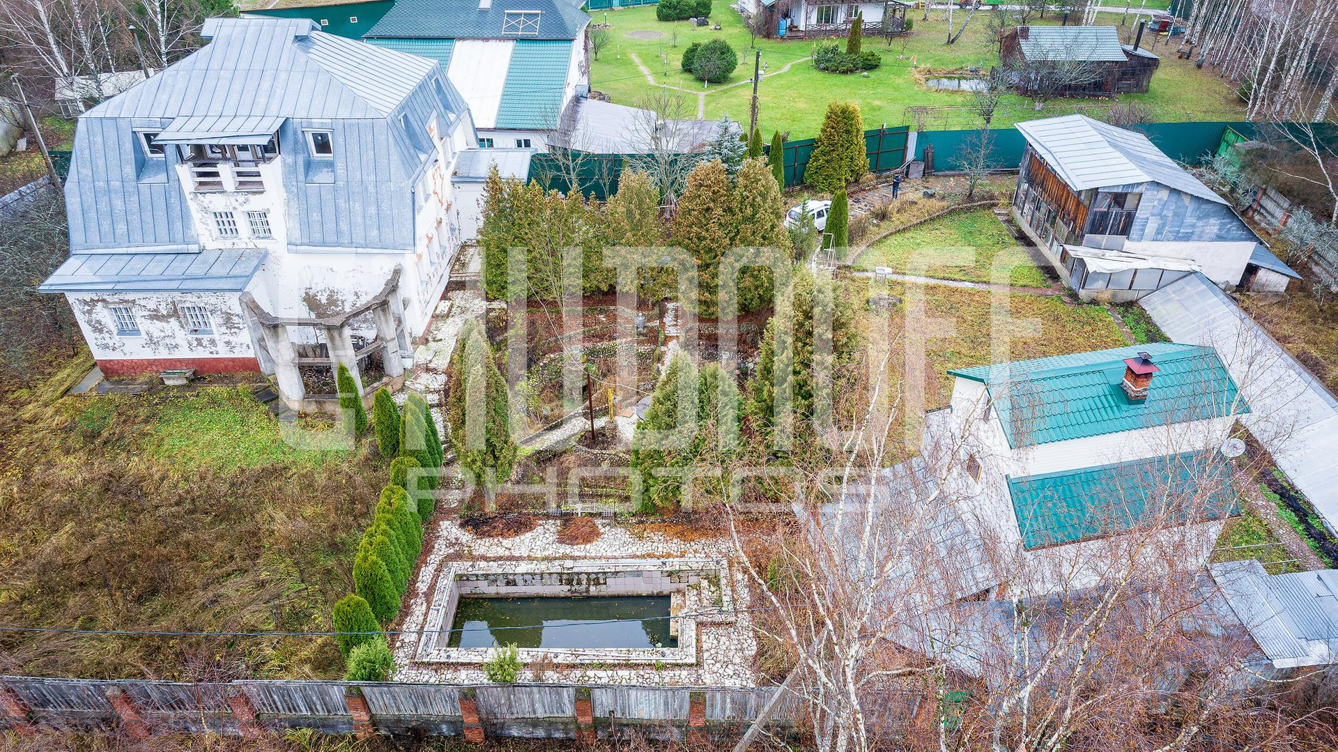 На участке сделан ландшафтный дизайн, есть бассейн. Есть хозяйственная постройка типа сарай с оборудованной капитальной теплицей 200 кв.м. Отдельное строение - баня 85 кв.м, 3 этажа.