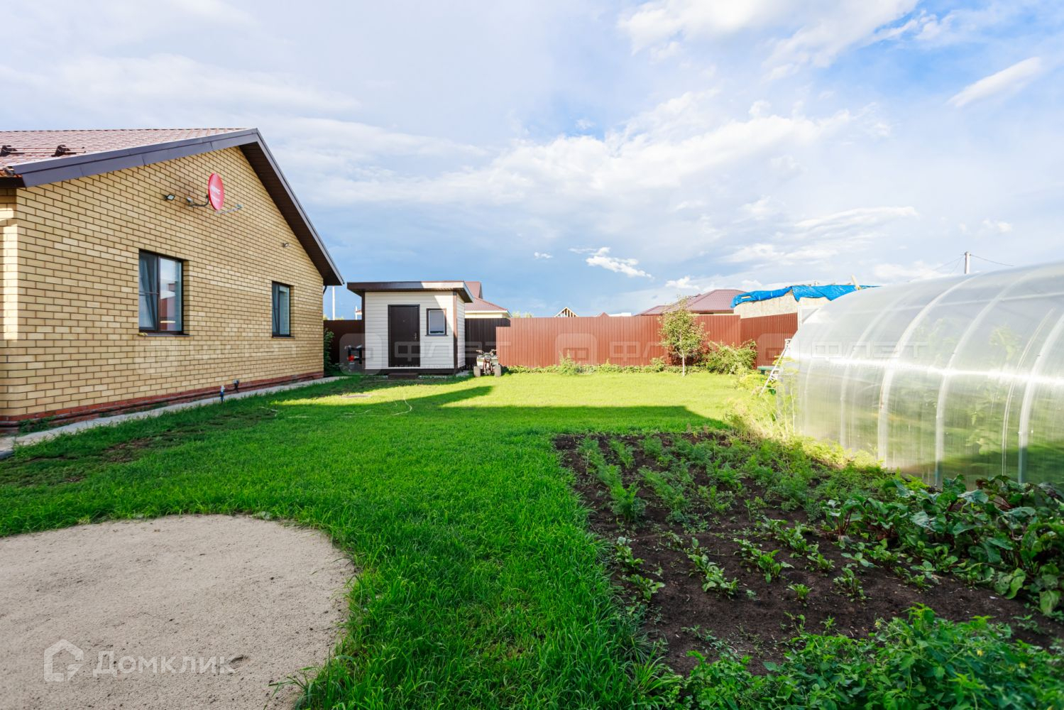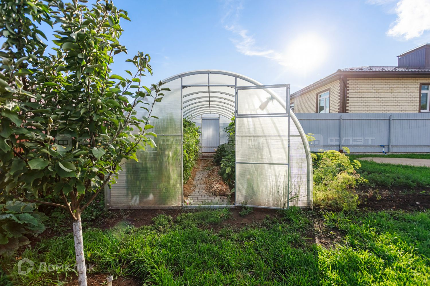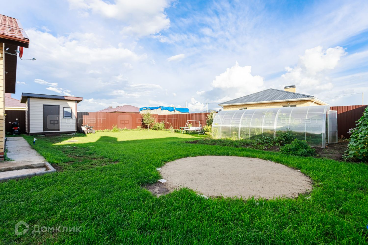 Участок выровнен, завезен чернозем, посажены газоны, плодовые деревья, декоративные хвойные и кустарники, цветы. На участке есть теплица 6х3 метра, каркасный хозблок для хранения инвентаря. Электричество проведено на участок и в хозблок, выведена вода для летнего полива.
