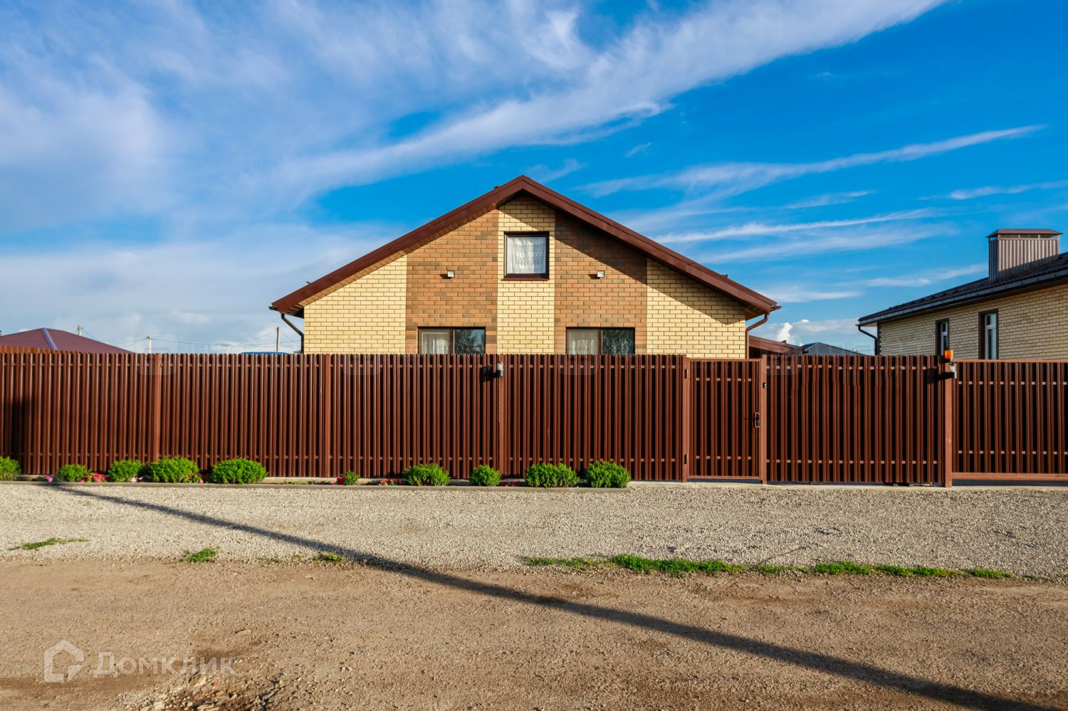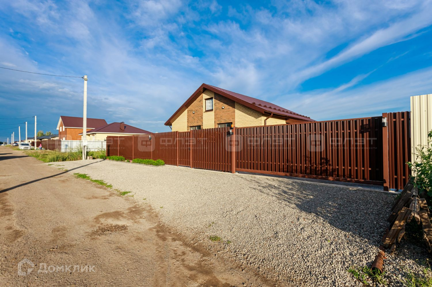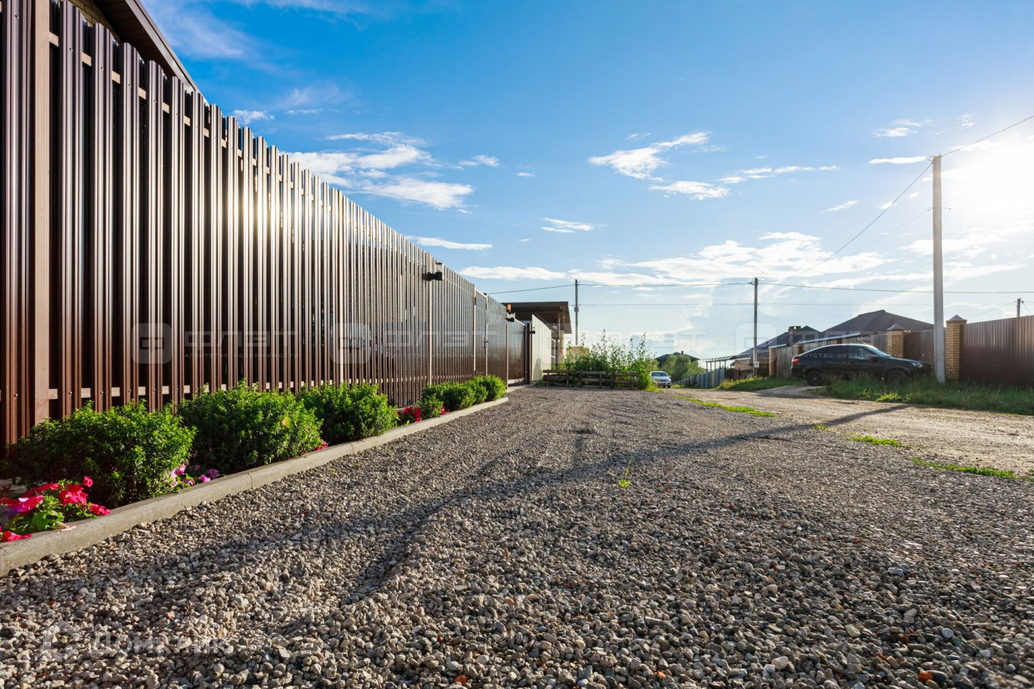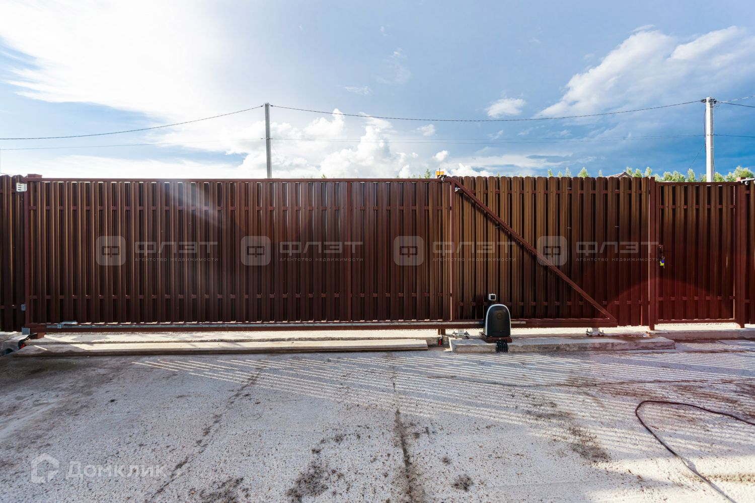 Участок полностью огорожен забором: профнастил, лицевая часть из металлического штакетника с двух сторон, с откатными автоматическими воротами и подсветкой.