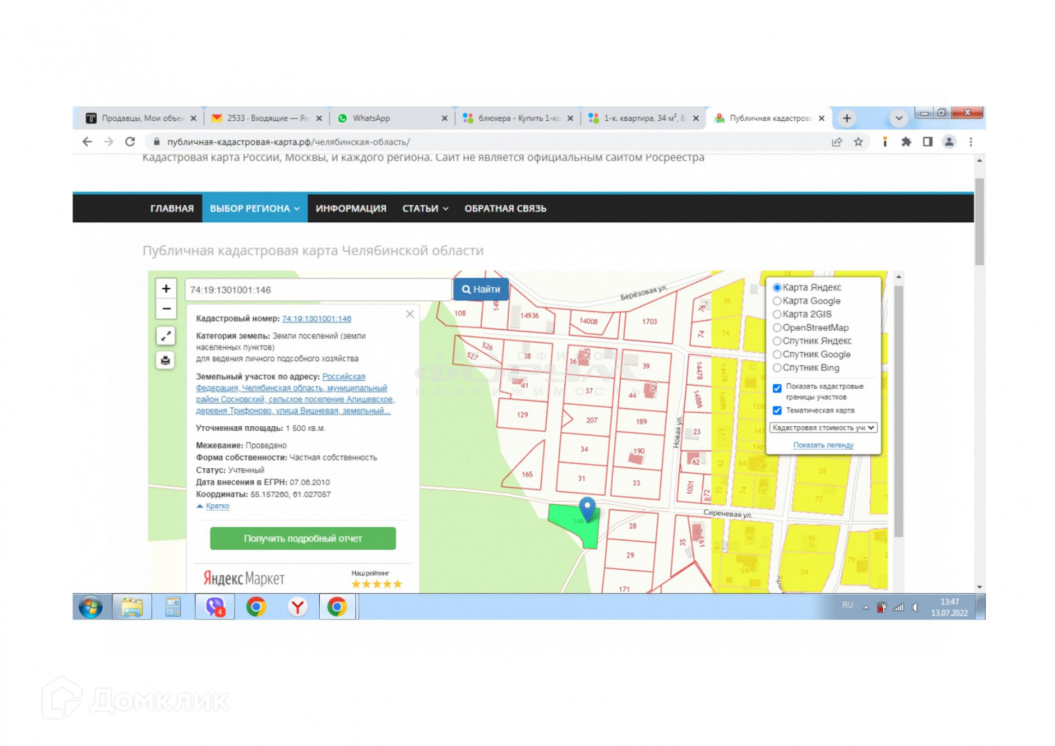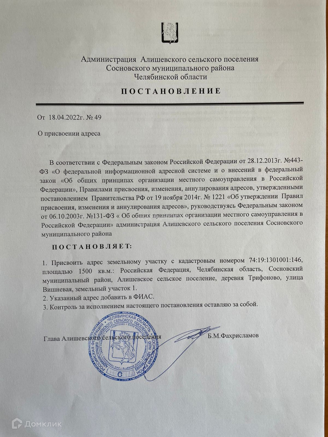 Арт. 38583981 Предлагаем купить земельный участок рядом  с Харлушевским государственным природным заказником.  Кадастровый номер: 74:19:1301001:146. Категория земель: земли населенных пунктов. Вид разрешенного использования: Для объектов жилой застройки. Площадью 1500 (одна тысяча пятьсот) кв. м, точный адрес: Россия, Челябинская область, Сосновский муниципальный район,  Алишевское сельское поселение,   деревня Трифоново, улица Вишневая, д. 1. Участок находится на возвышенности.