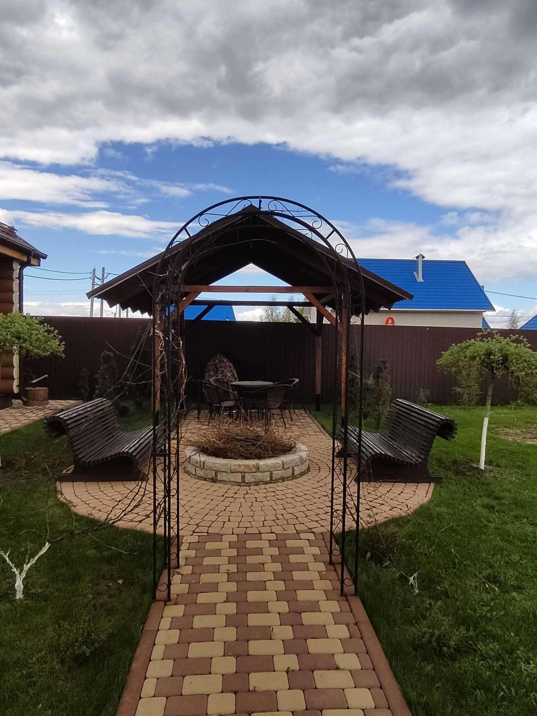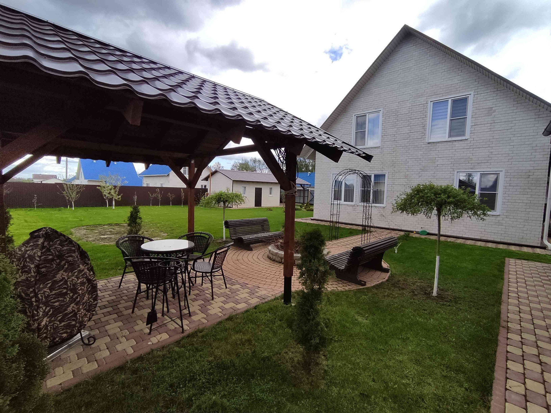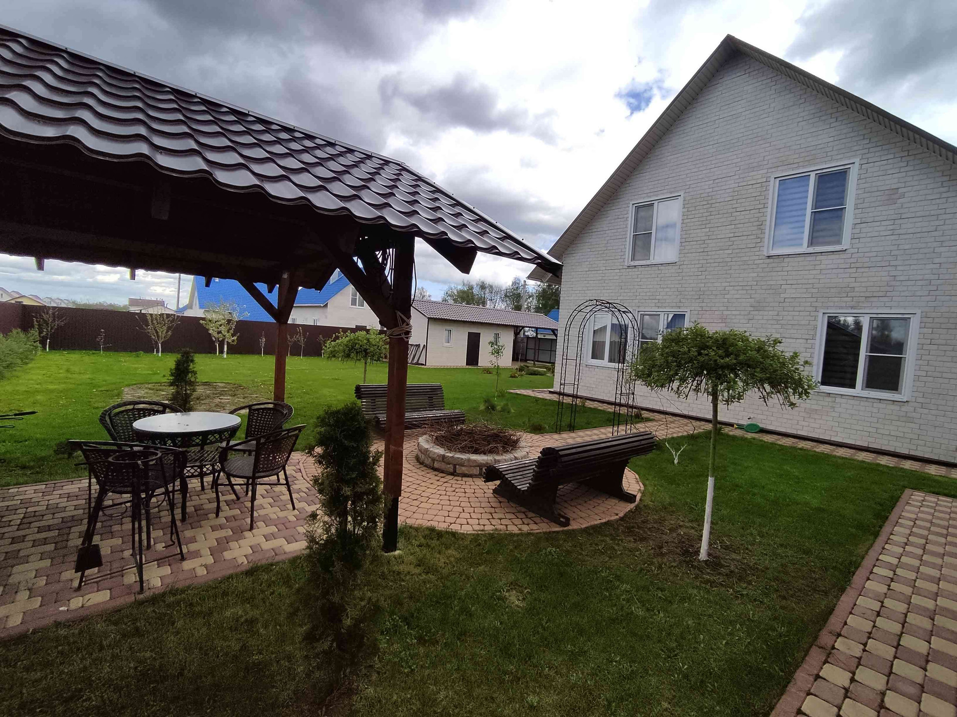 На участке расположена русская баня из рубленного бревна с комнатой отдыха и гостевой комнатой на втором этаже. Рядом с баней имеется мангальная зона с навесом и костеровой. Участок правильной формы, покрытый газонной травой, имеются плодово-ягодные деревья, по периметру растут красивые кусты роз. Тропинки выложены брусчаткой.