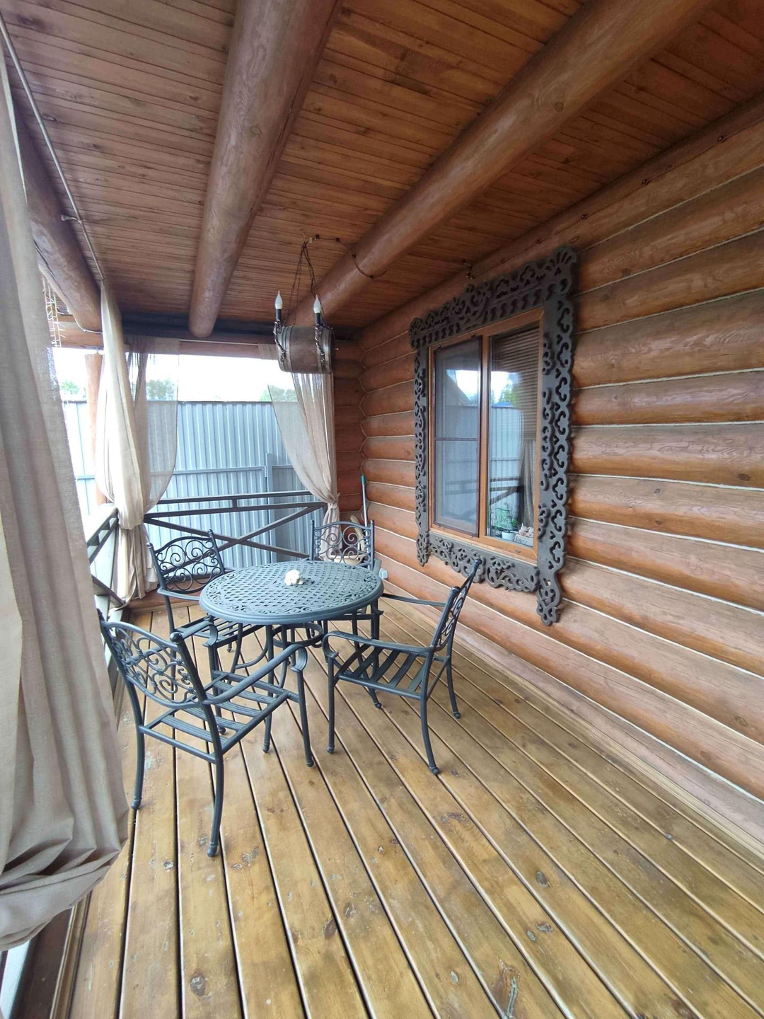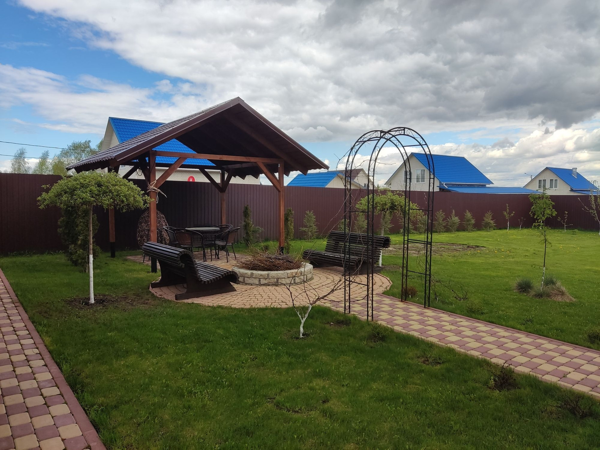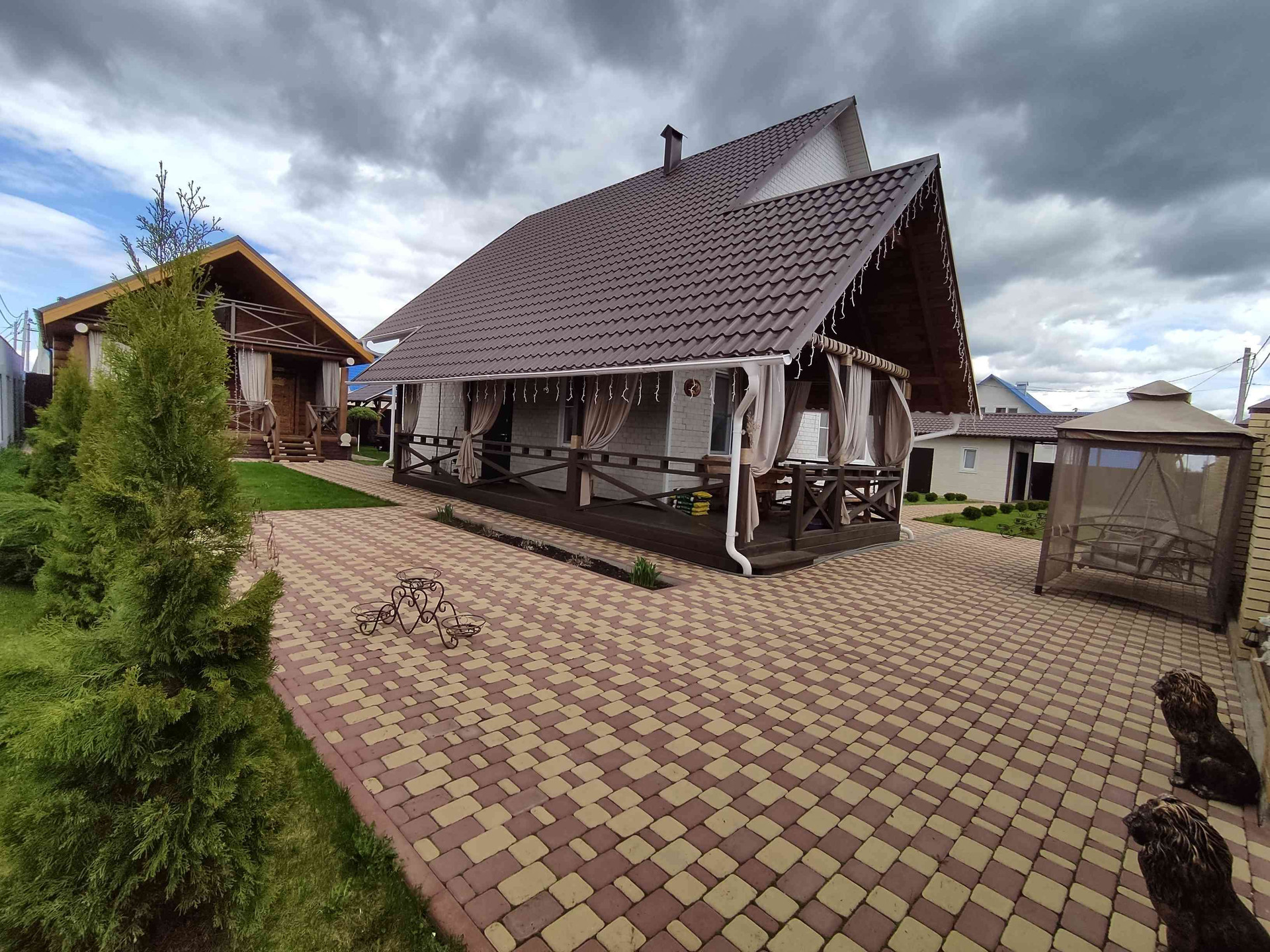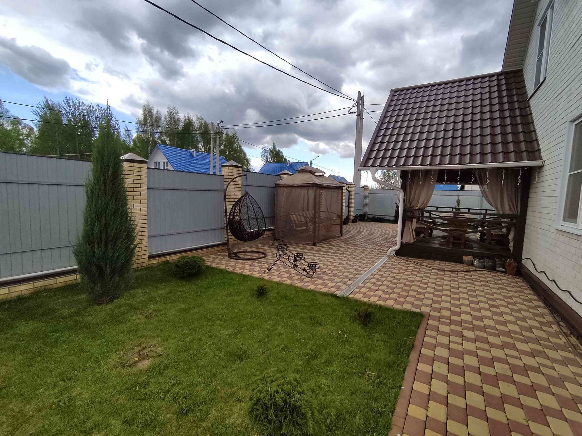 На участке расположена русская баня из рубленного бревна с комнатой отдыха и гостевой комнатой на втором этаже. Рядом с баней имеется мангальная зона с навесом и костеровой. Участок правильной формы, покрытый газонной травой, имеются плодово-ягодные деревья, по периметру растут красивые кусты роз. Тропинки выложены брусчаткой.