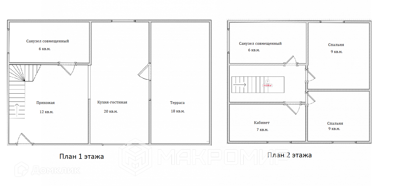 В доме 2 этажа. На первом расположились: кухня-гостиная с выходом на террасу, совмещенный санузел. На втором этаже: две спальни, отдельный кабинет и еще один санузел.