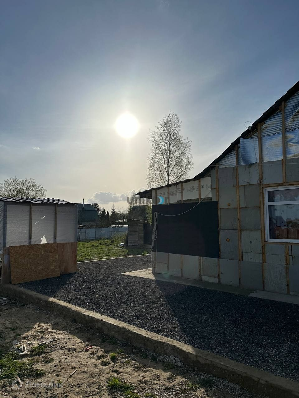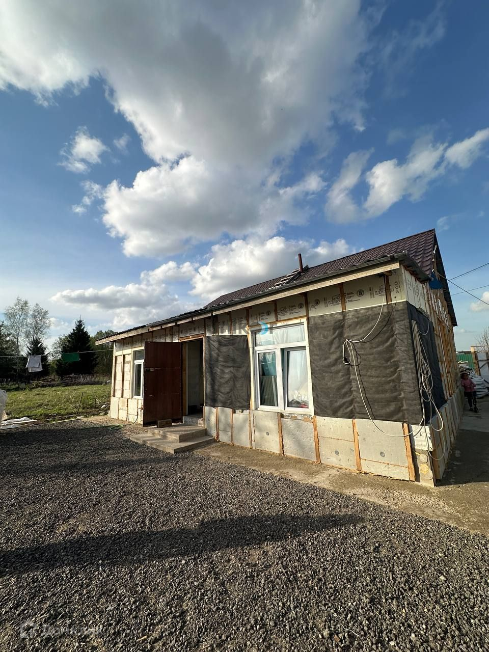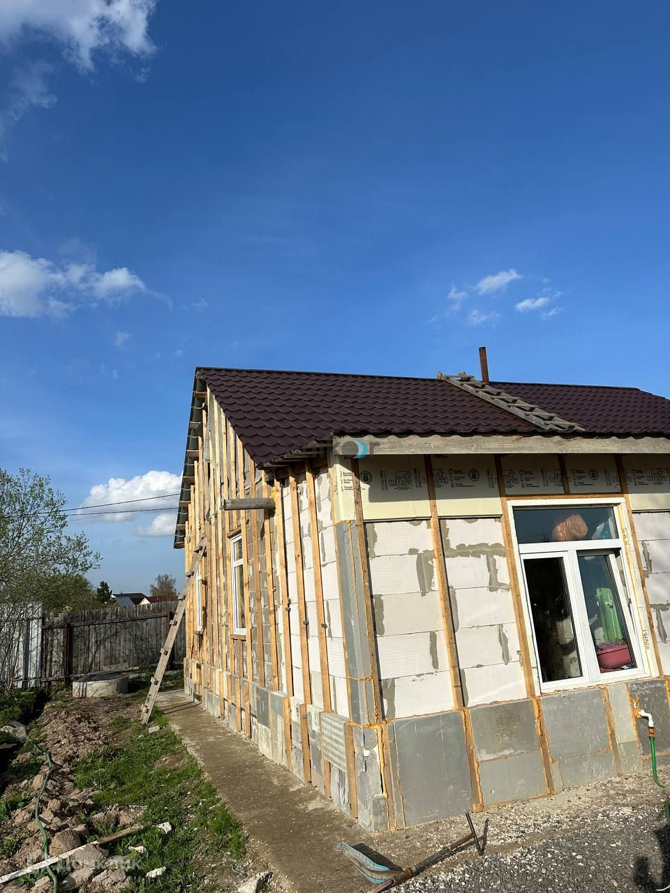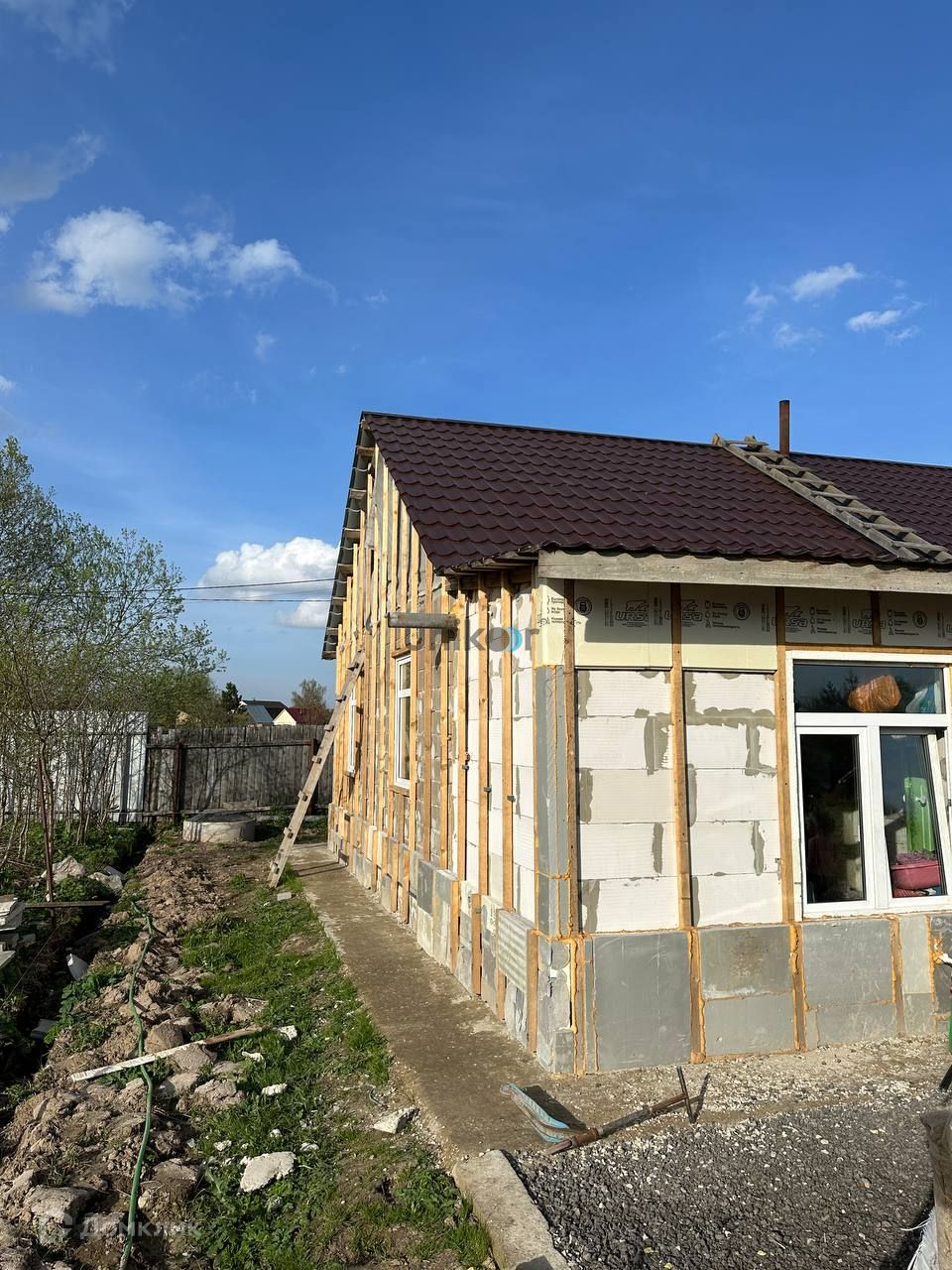 Фундамент ленточный на сваях. Стены выполнены из пеноблока. Частичная чистовая отделка. В доме 3 комнаты, кухня, санузел. Дом подготовлен к обшивке фасада.
