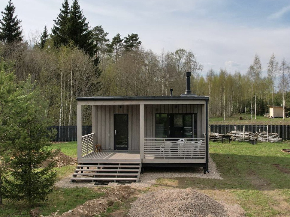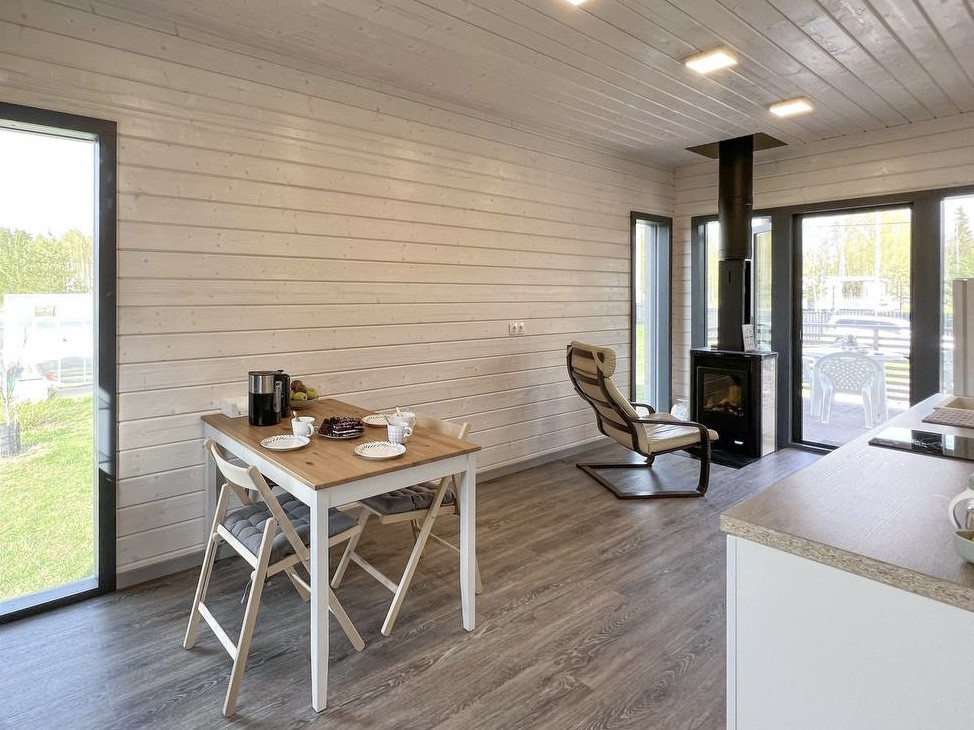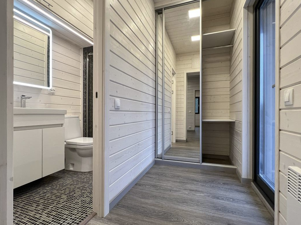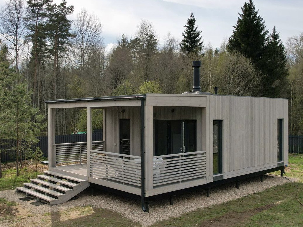 В продаже имеется готовый модульный дом с отделкой под ключ. Стильный и очень теплый дом с жилой площадью 33 м.кв. и 19 м.кв террасы. Плоская кровля и сдержанные контрасты во внешней отделке. Такой дом точно выделится среди соседей своим минималистичным современным стилем.