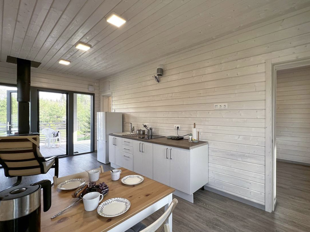 - внутренняя отделка имитацией бруса, лессирующая белая краска