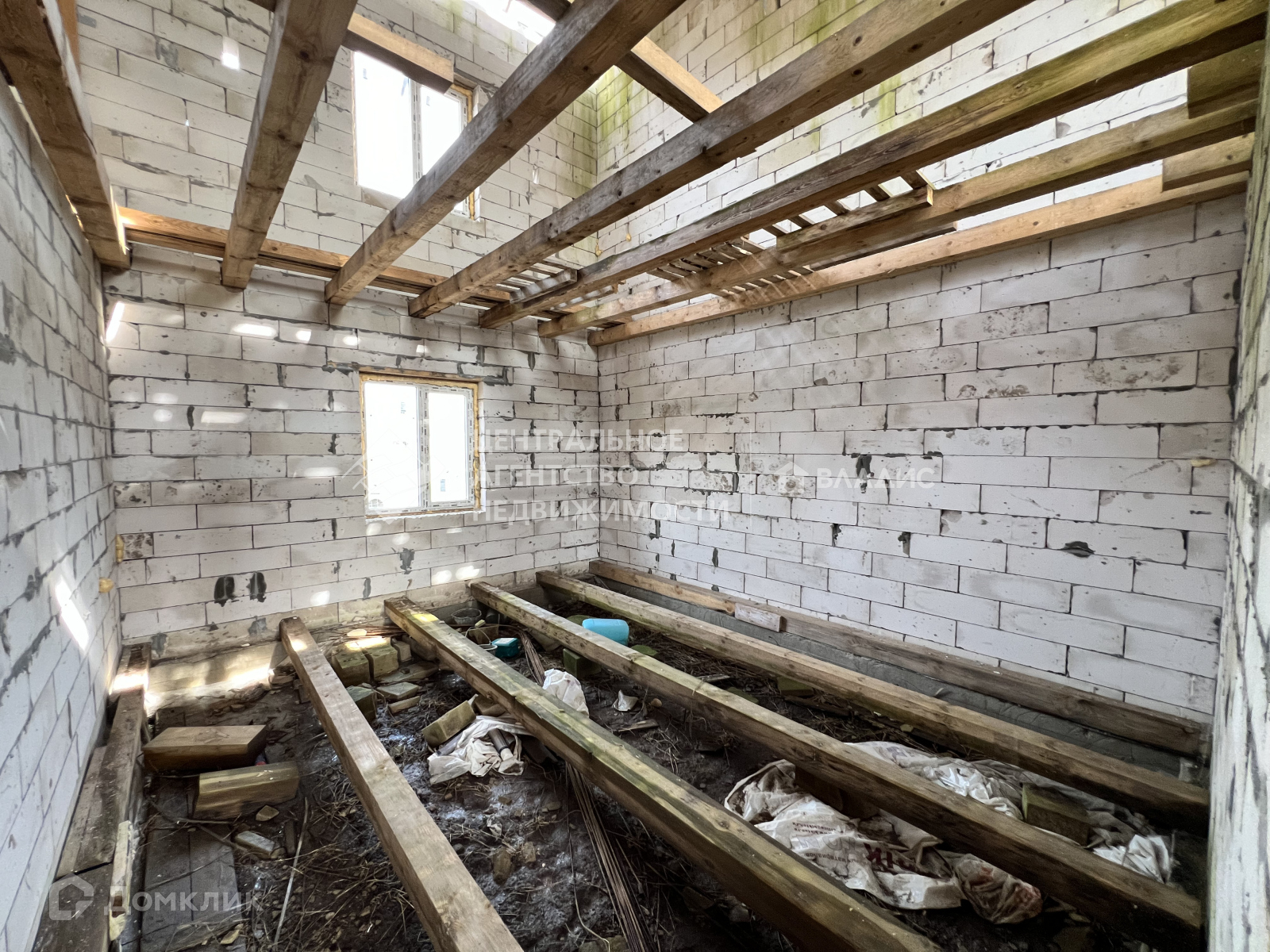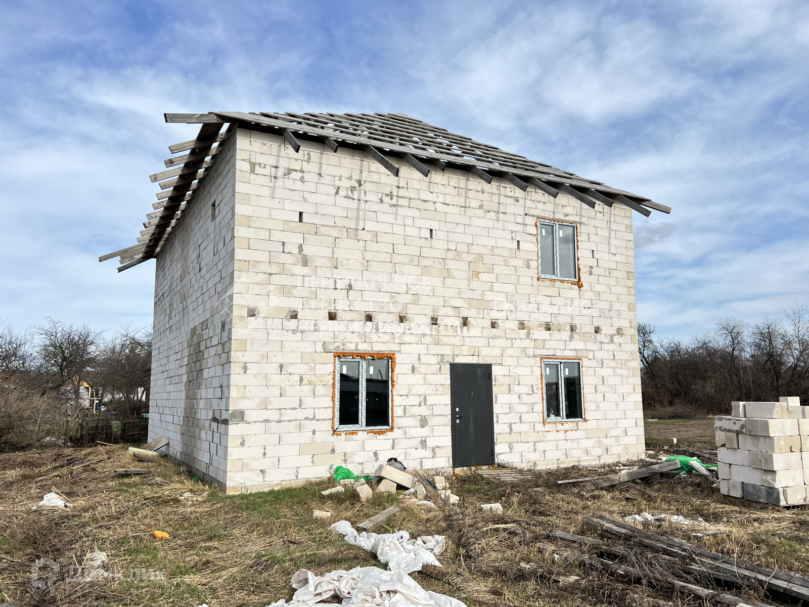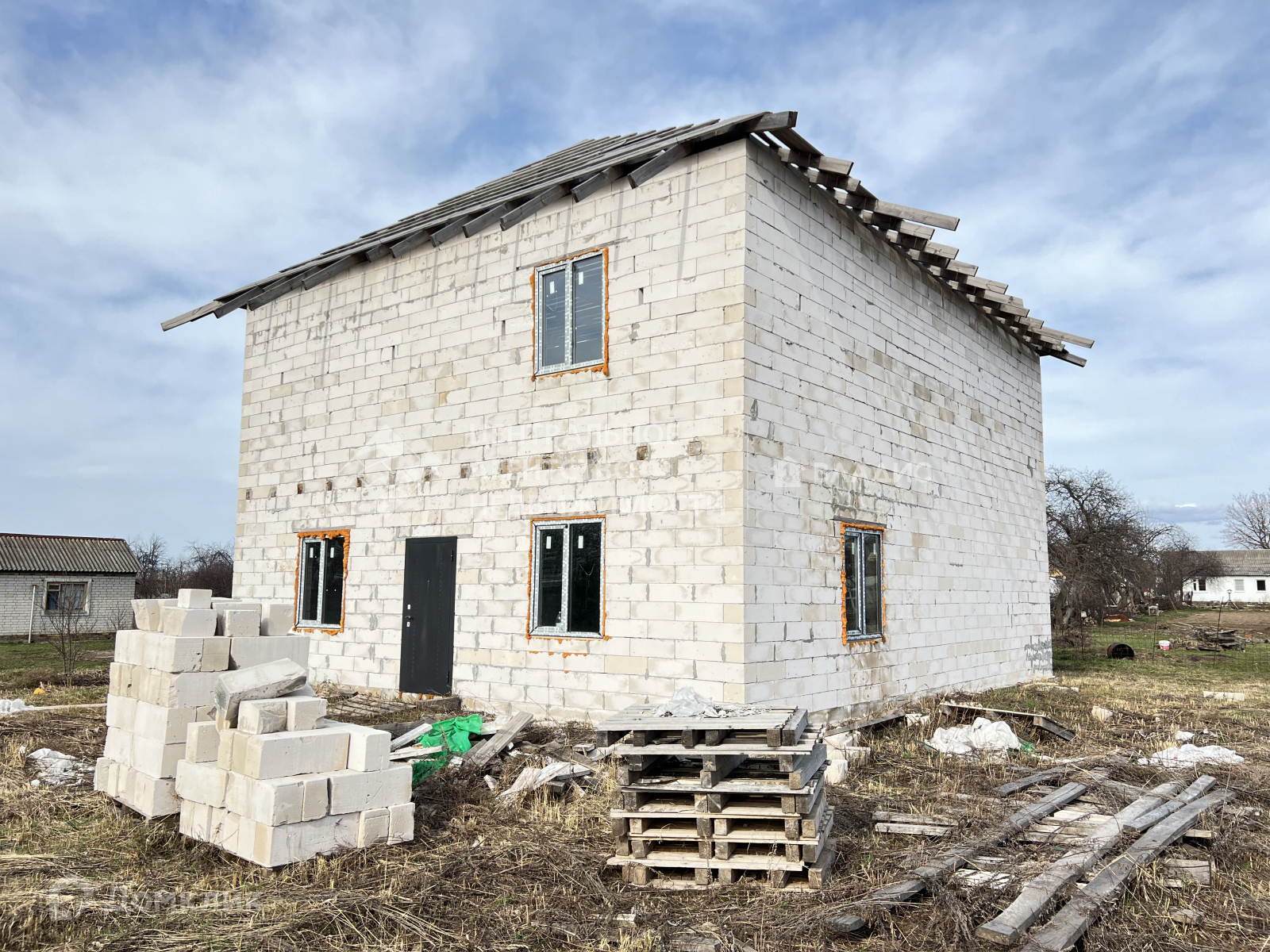 10 на 12 м, ленточный фундамент,  два этажа свободной планировки, перекрытия - брус+доска на каждом этаже,  стены - газосиликатный блок D500-625x250-200 пластиковые окна * REHAU* с двойным стеклопакетом.