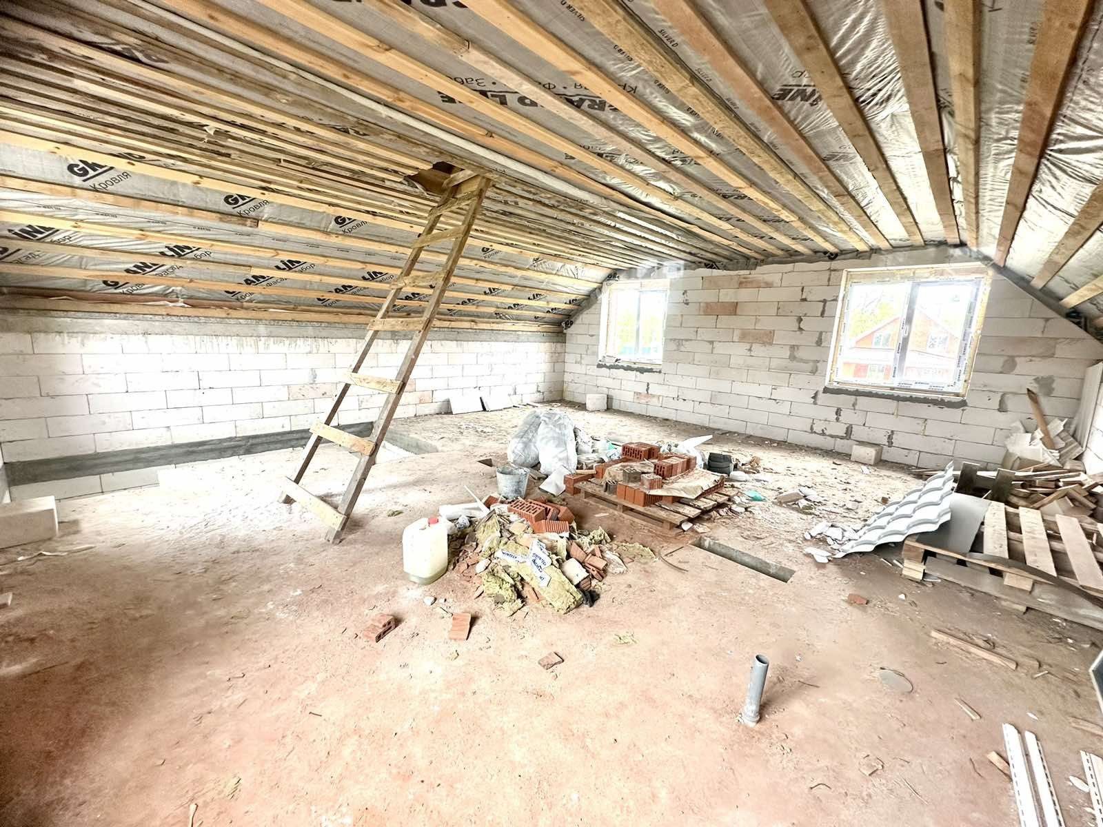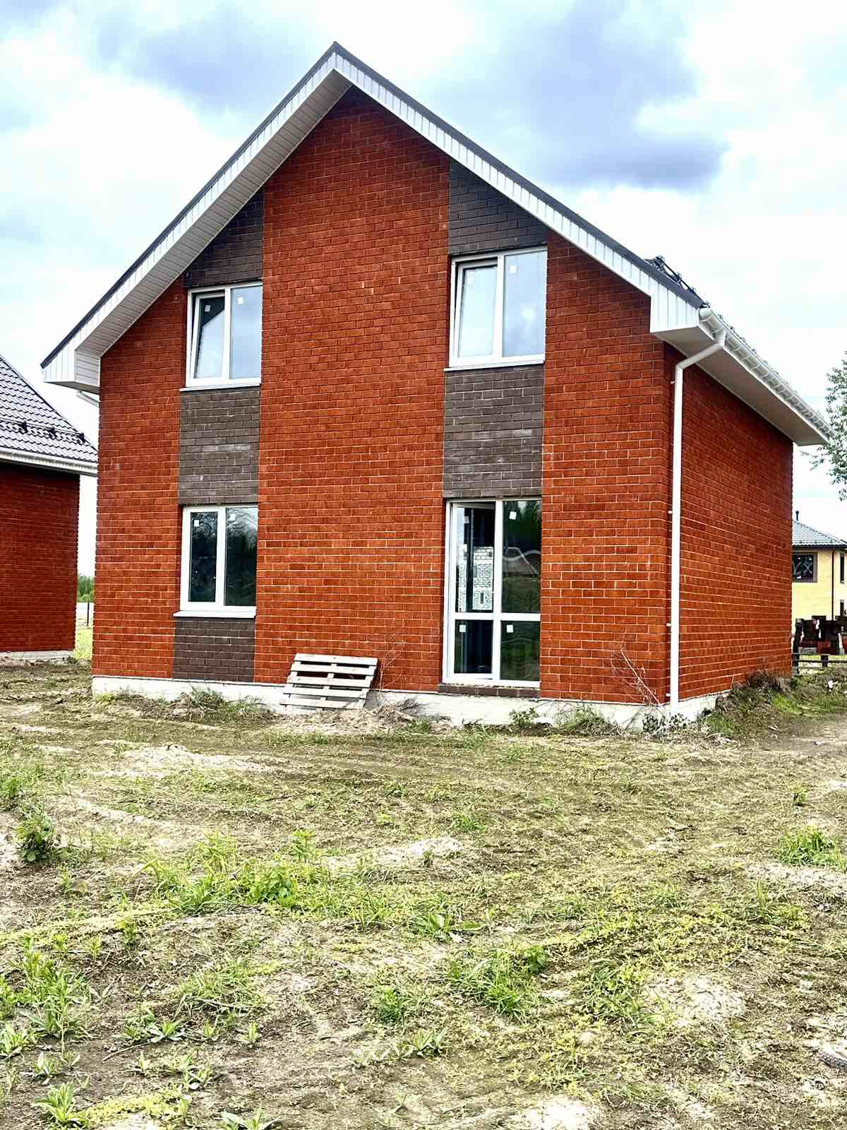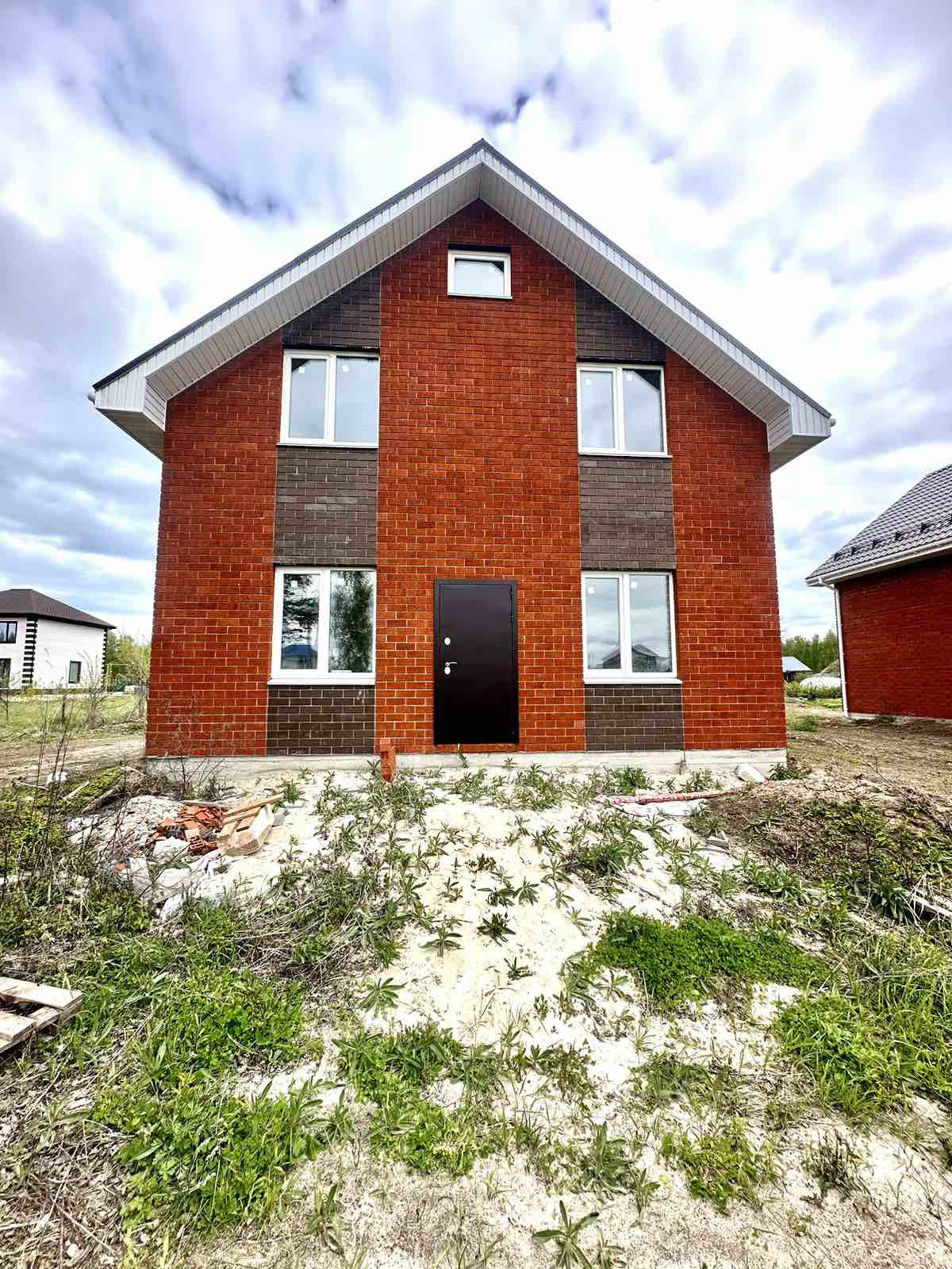 Дом построен из газосиликатного блока, облицовка керамический кирпич, крыша- двухскатная метал черепица.