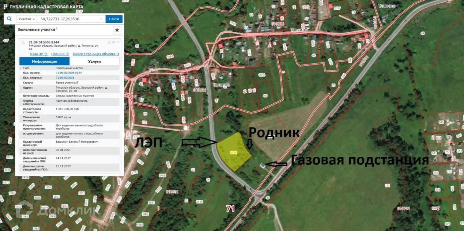 Продается участок 50 сот. Категория земель Земли поселений (земли населенных пунктов) для ведения ЛПХ. Расположен в деревне Тяпкино, проходит по границе с федеральной трассой 3-ей категории. Газ (подключение возможно) и природный родник - по границе участка. Водопровод (врезка возможна), - своя скважина в д Тяпкино. Электричество подведено по федеральной программе 15 кВт/участок. Чистый воздух, уникальная природа, здоровая экология. Идеальное место для личной усадьбы или туристического бизнеса (туристический поток составляет примерно 500 тысяч туристов в год). Вся основная инфраструктура рядом в Заокске (8 км): школы, детские сады, торговые центры, кинотеатр, больница, травмпункт, мфц, магазины (верный, пятерочка, фикспрайс и тд.). Там же ж/д станция Тарусская Курского направления. Автобусная остановка рядом с участком. Расстояние до МКАД 107 км по Симферопольскому шоссе, до г. Серпухова 37 км, до г. Тулы 80 км. Поблизости есть места, где можно провести досуговое время: Приокско-террасный заповедник, музеи Поленова, Болотова, Руднева, несколько пляжей, склоны зимнего отдыха. Все документы в порядке, готовы к сделке. Просмотры возможны с воскресенья по пятницу с 9:00 до 20:00 по предварительной договоренности. Звоните, пожалуйста, по всем вопросам с воскресенья по пятницу с 10:00 до 21:00. Суббота выходной.