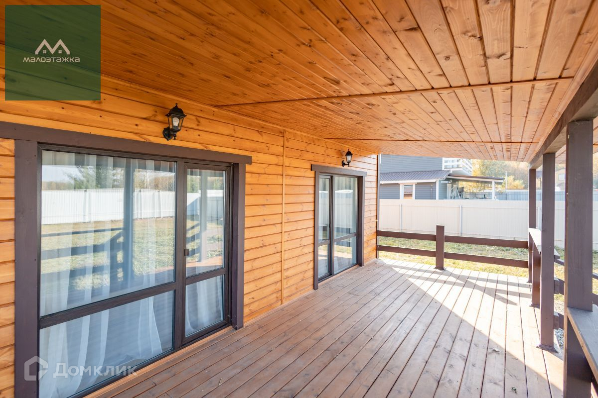 Возведён на монолитной плите-основание. Наружная и внутренняя отделка выполнена из имитации бруса.