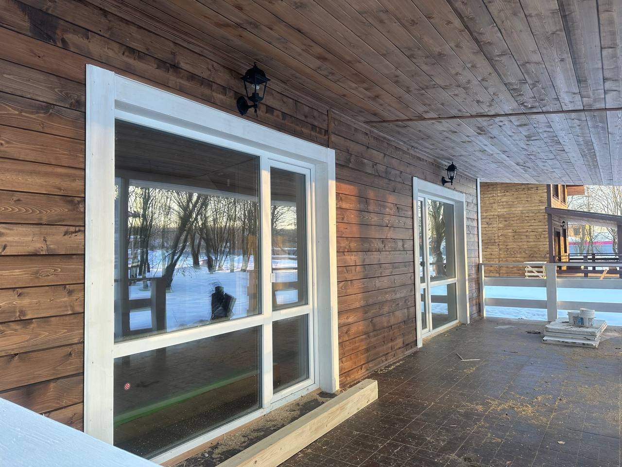 — Смонтирован натяжные потолки на первом этаже;
