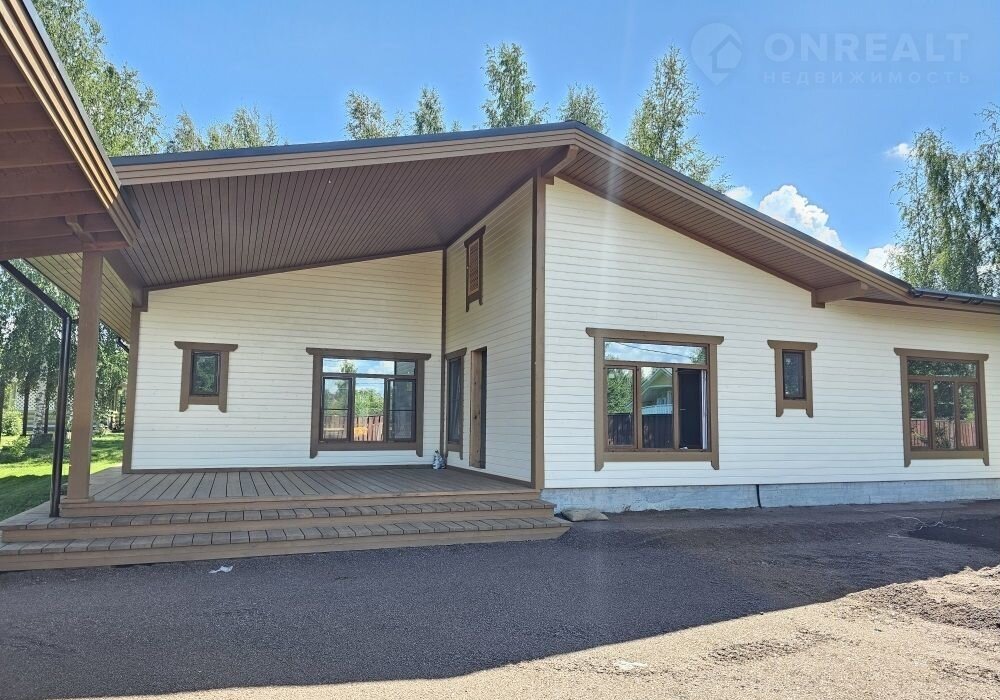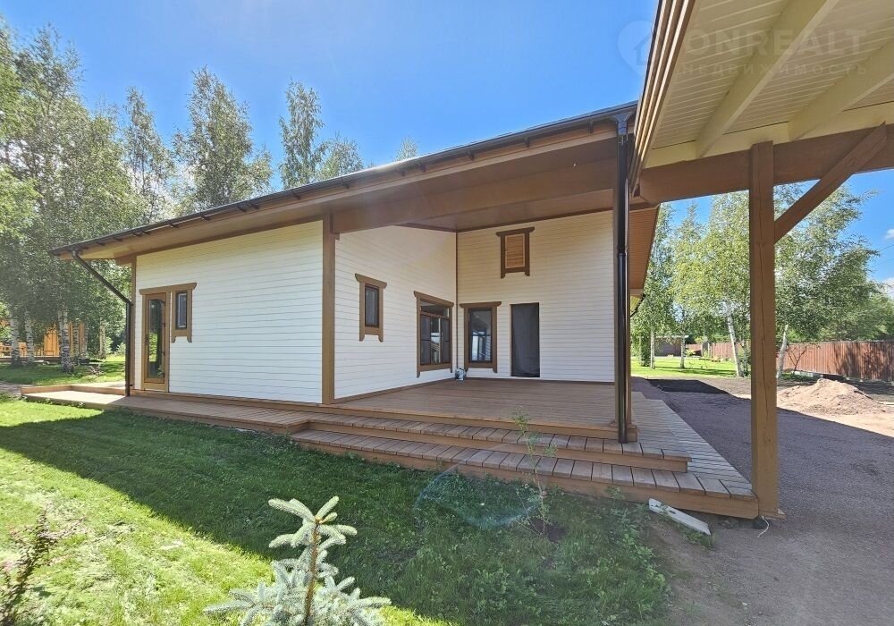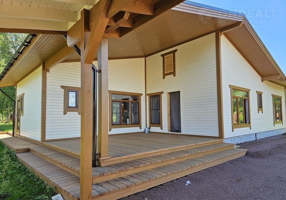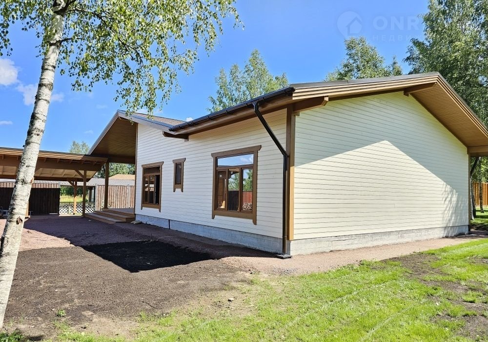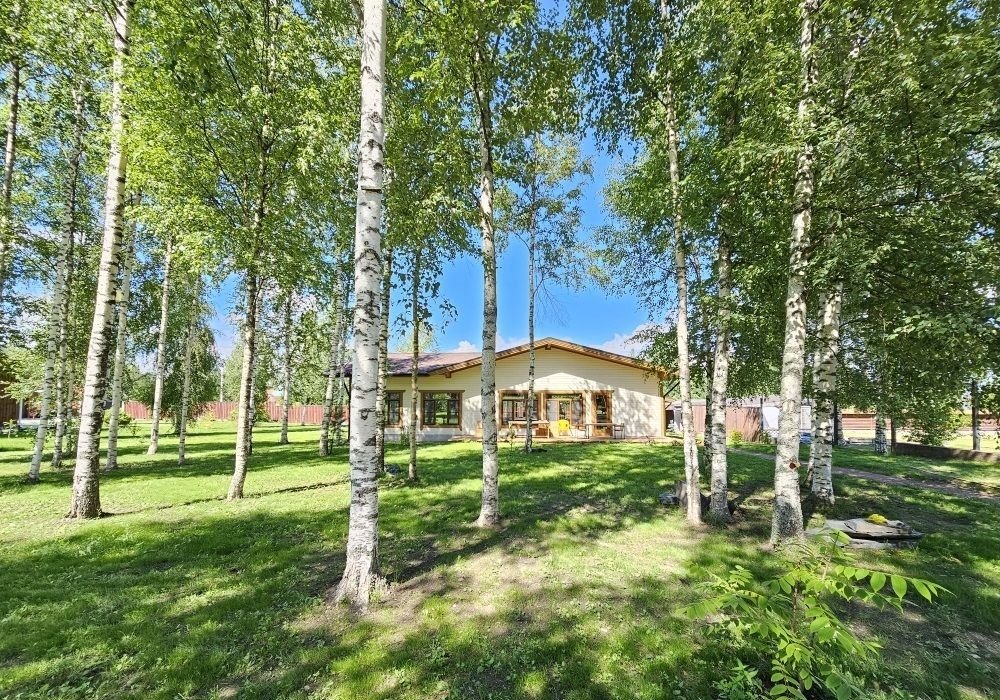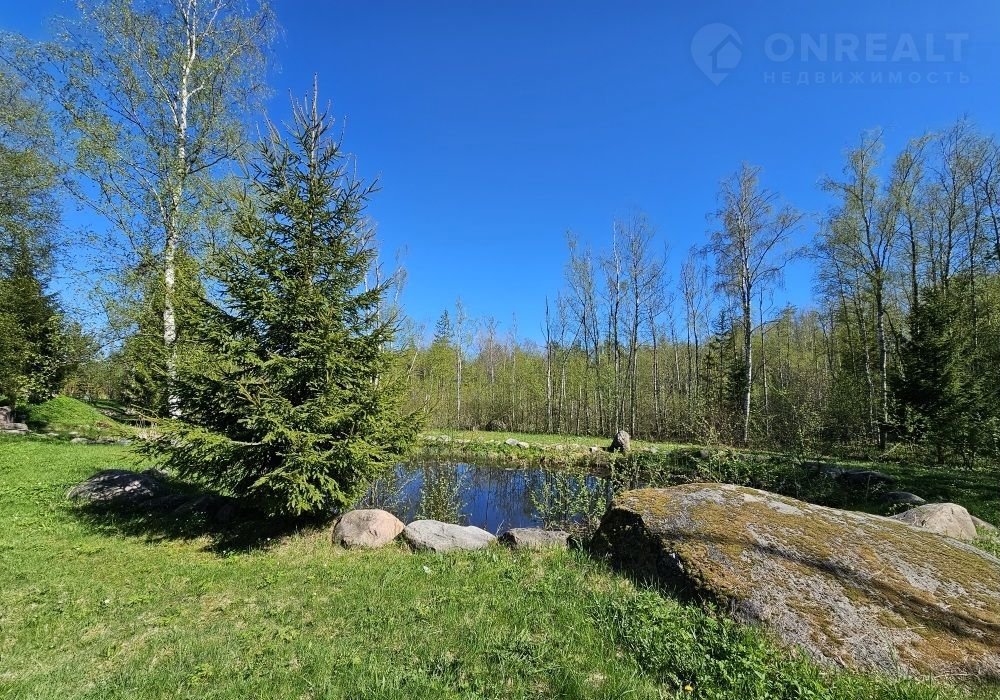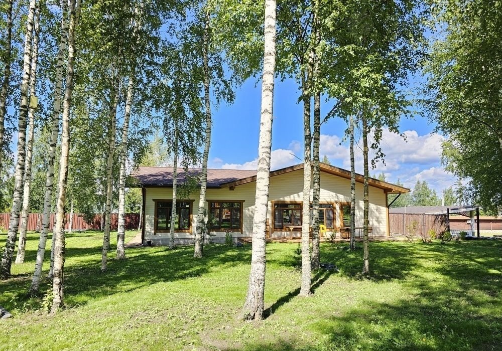 Кроме дома, на территории участка: подсобное строение для садовой утвари, навес для двух машин и большая беседка с видом на пруд и бескрайний лес. Участок украшают молодые березы и декоративные каменные «эпизоды» из шунгита.