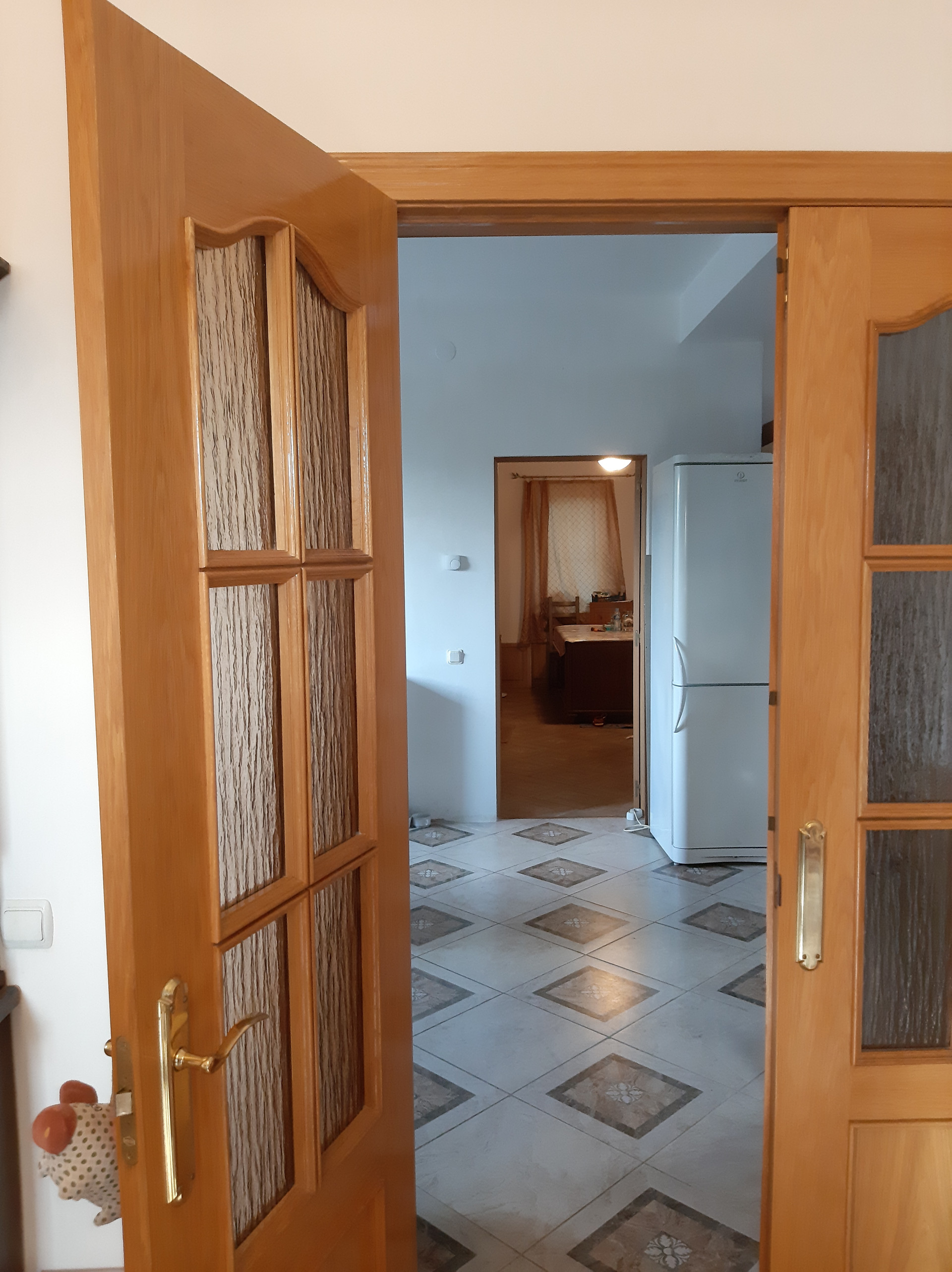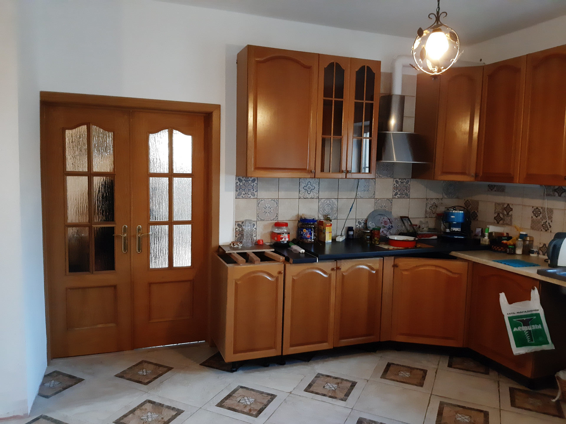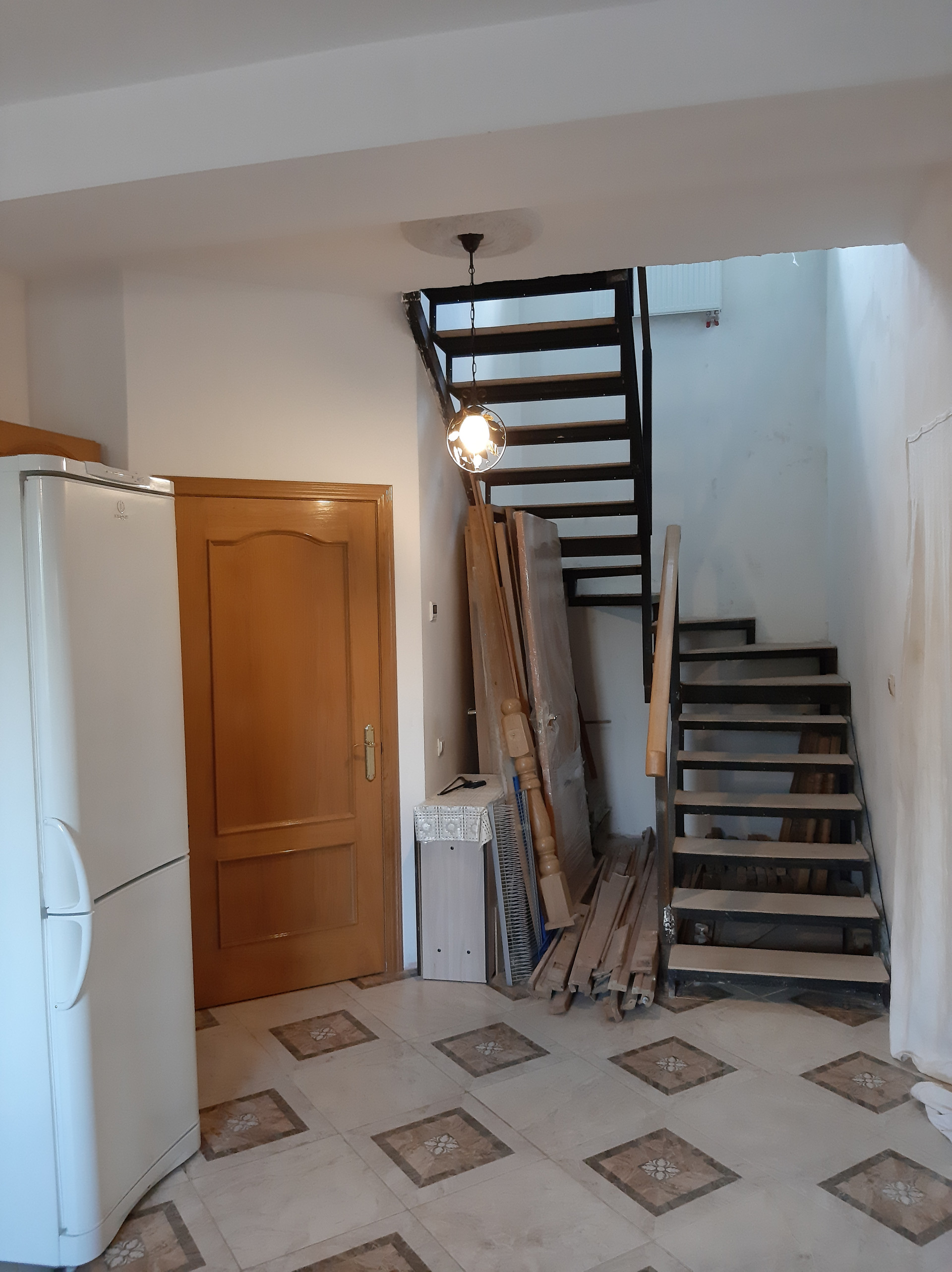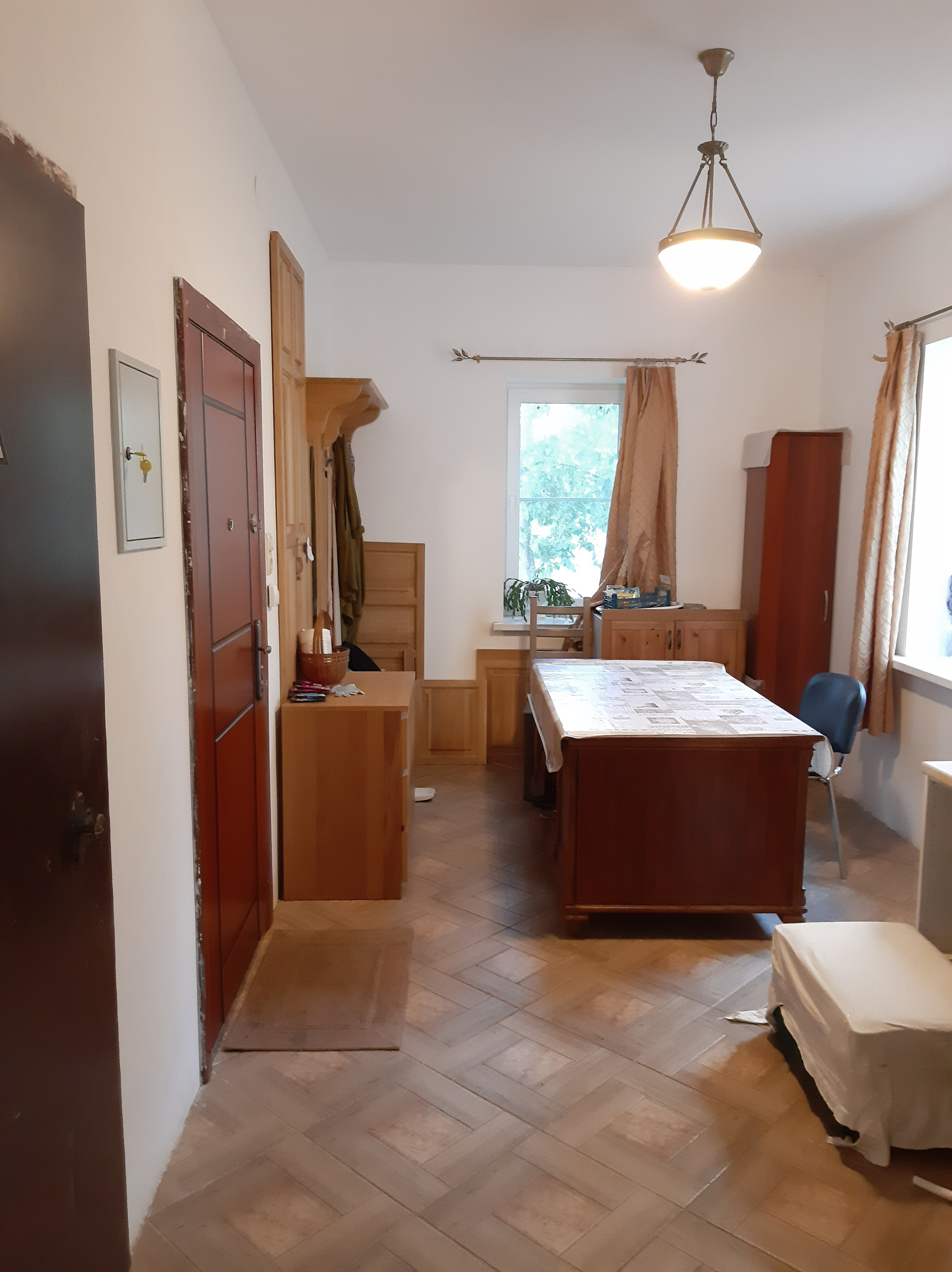 На 1-м этаже расположена гостиная 18,6 кв.м., кухня-столовая с газовой плитой 25 кв.м, спальня 19 кв.м, веранда 22 кв.м, прихожая 15,2 кв.м., совмещенный санузел 7 кв.м с душевой кабиной, два входа в дом с крыльцом: через веранду (остеклена - панорамные окна) и отдельный вход через прихожую. Высота потолков 2,9 м., теплый пол – плитка. Все помещения этажа отделаны, кроме спальни – она подготовлена под чистовую отделку