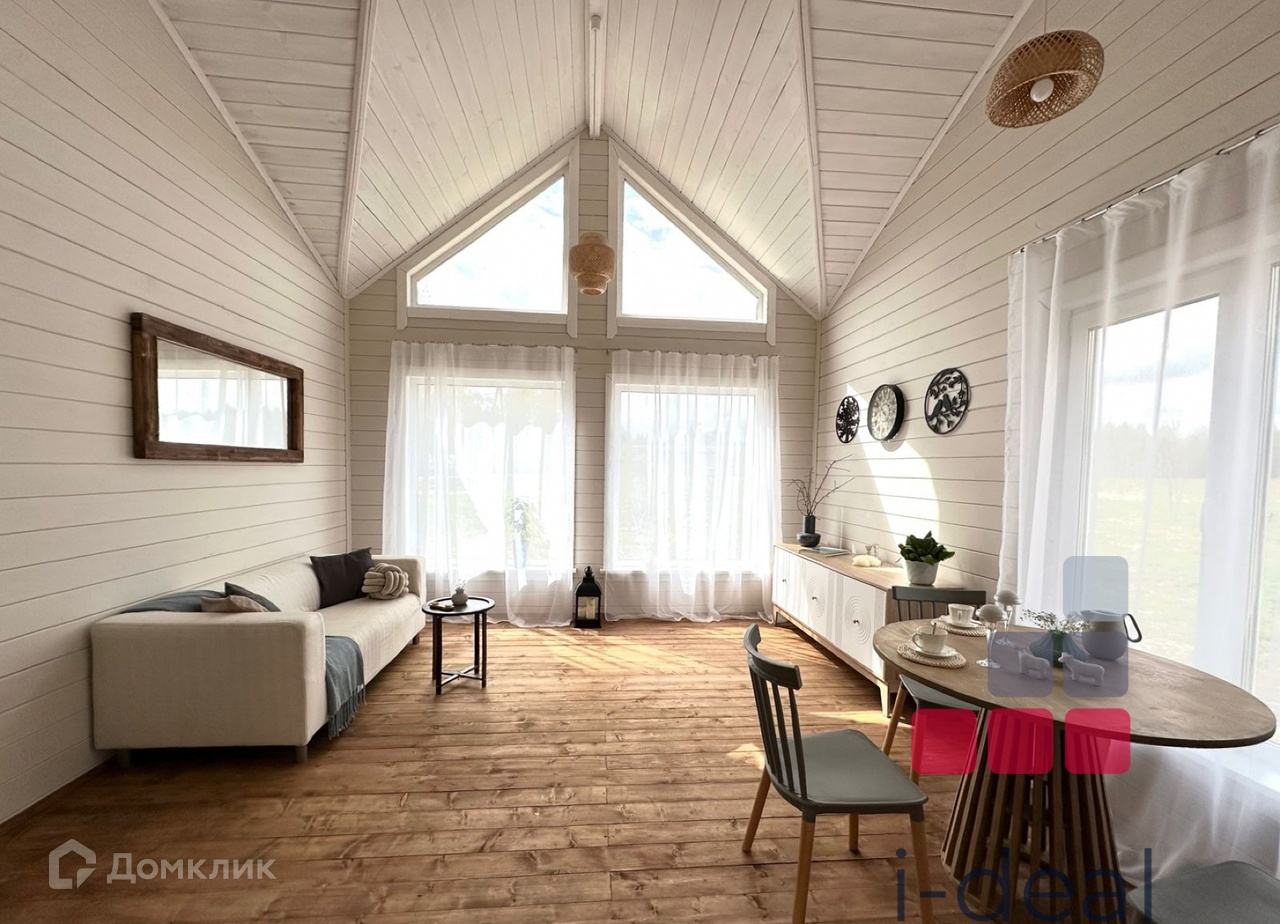 Построен по каркасной технологии из строганного пиломатериала, фундамент -железобетонные сваи 4 метра, утепление стен -150 мм, пол и потолок -200 мм, крыша - металлочерепица, большая летняя терраса. Высота потолка в самой высокой точке 4,6 метра. Окна ПВХ стеклопакеты, железная дверь.