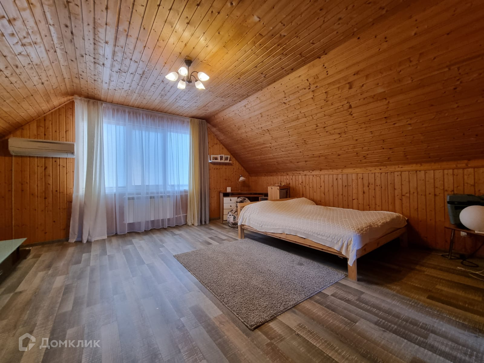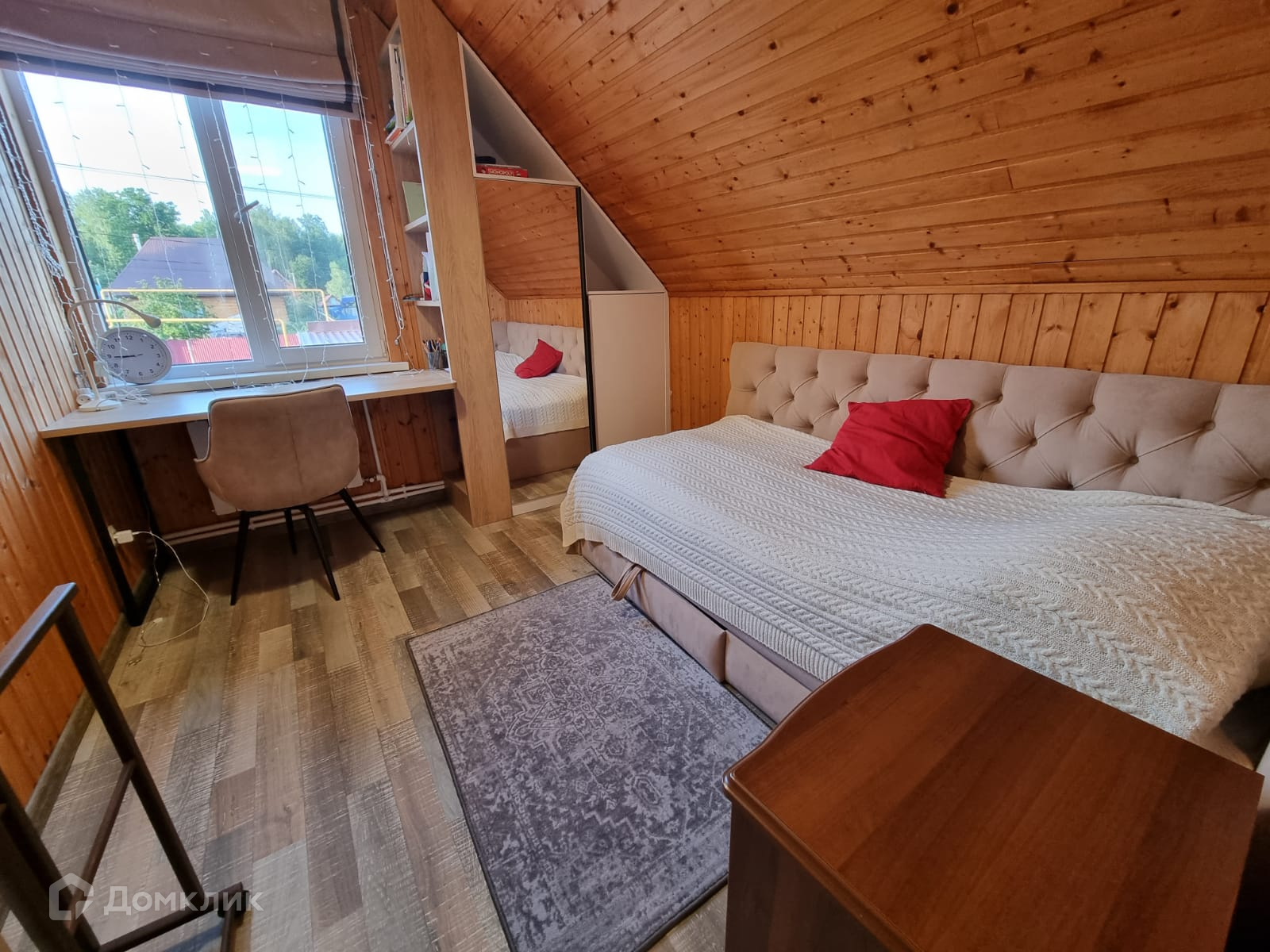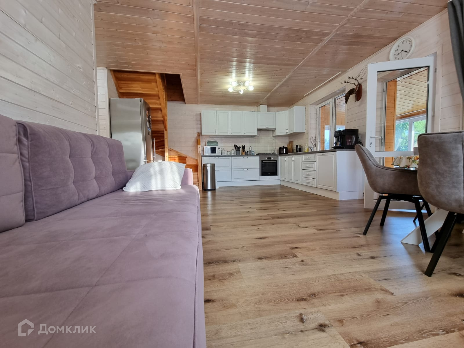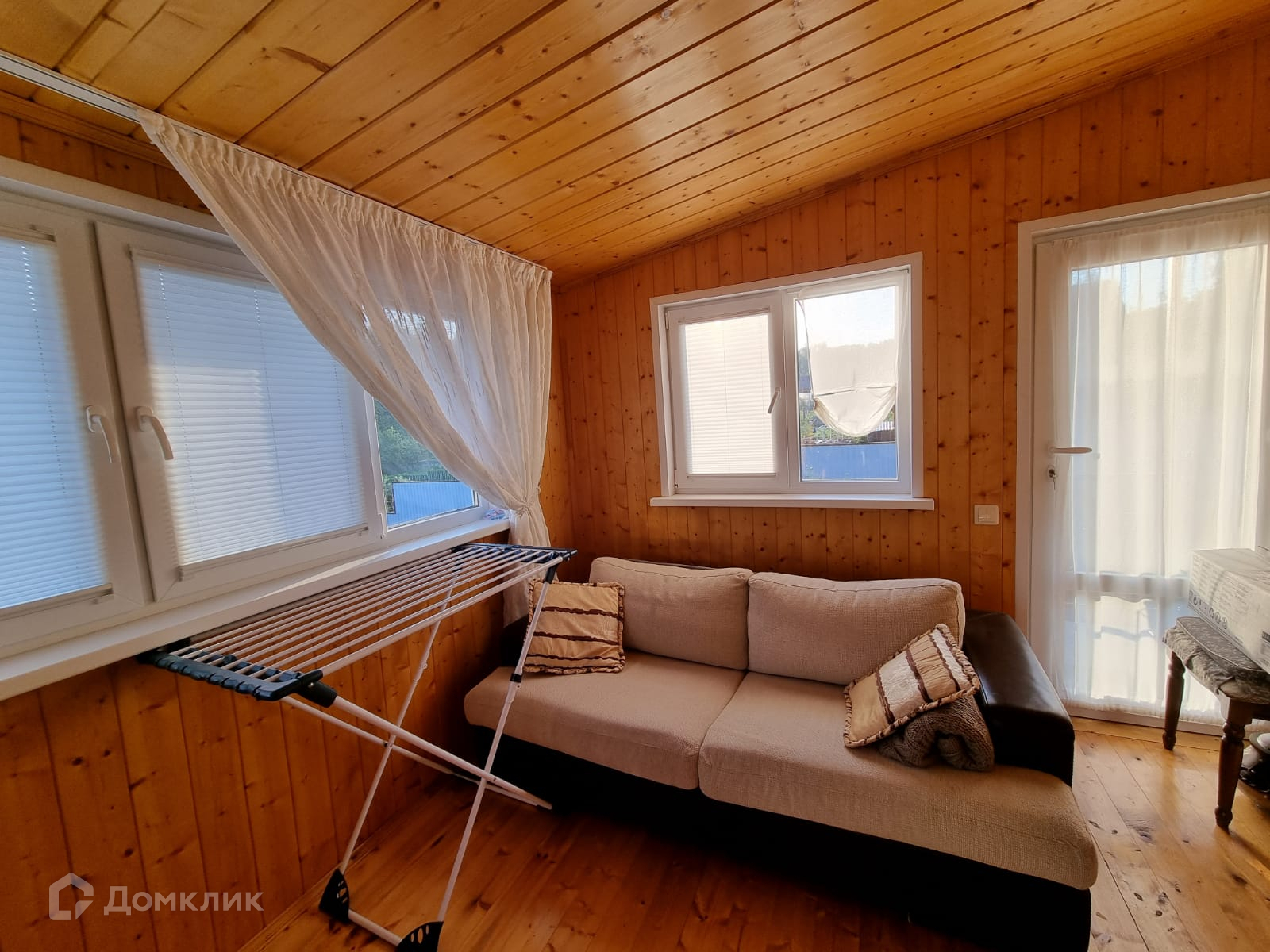 Дом внутри обшит деревом, полностью меблирован.