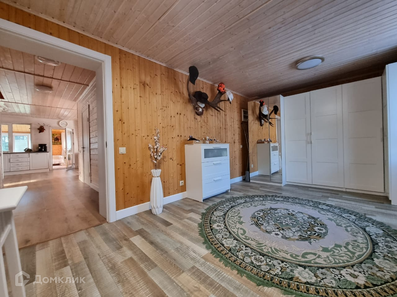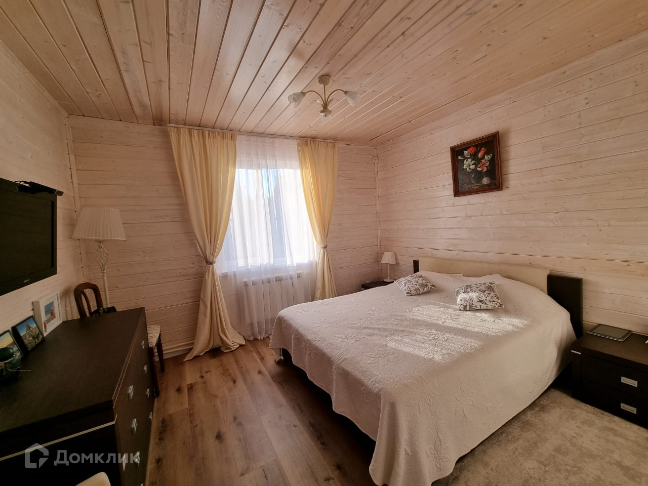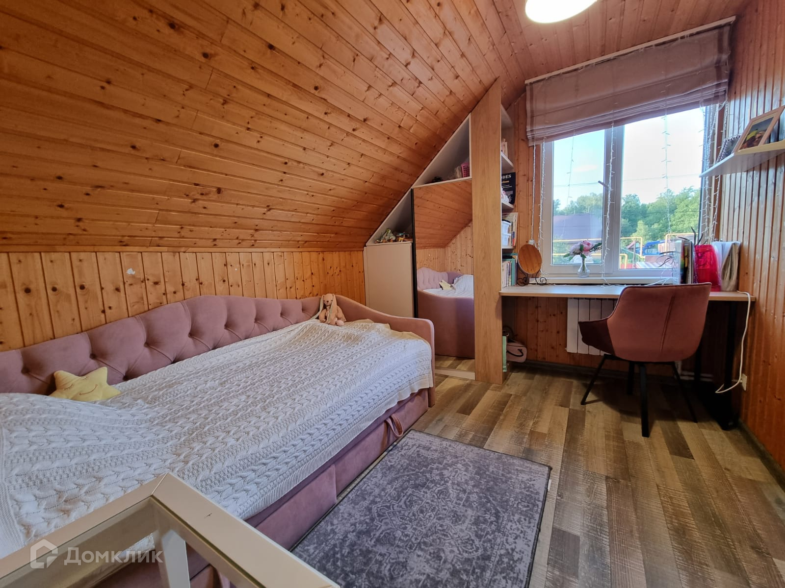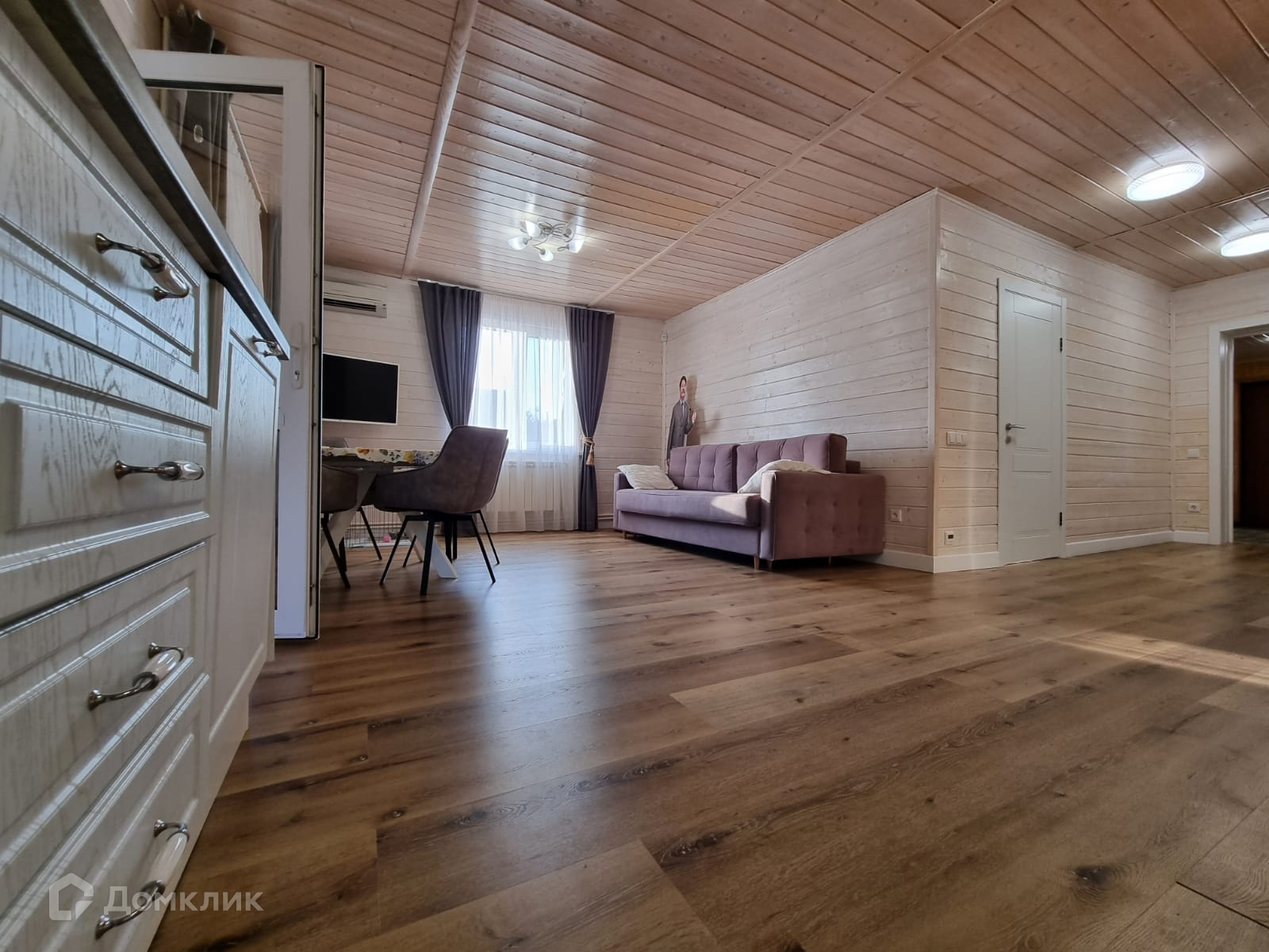 Дом внутри обшит деревом, полностью меблирован.