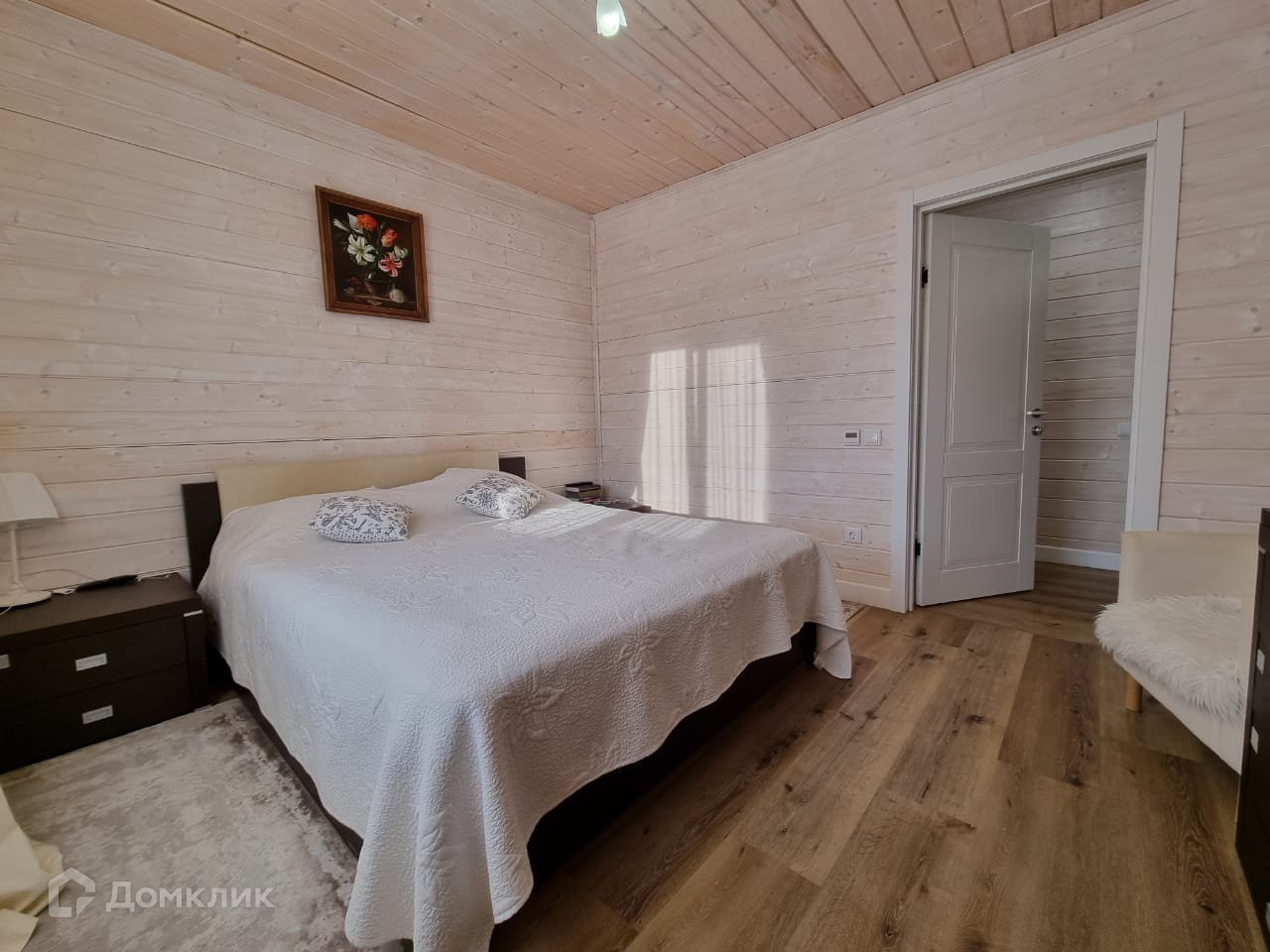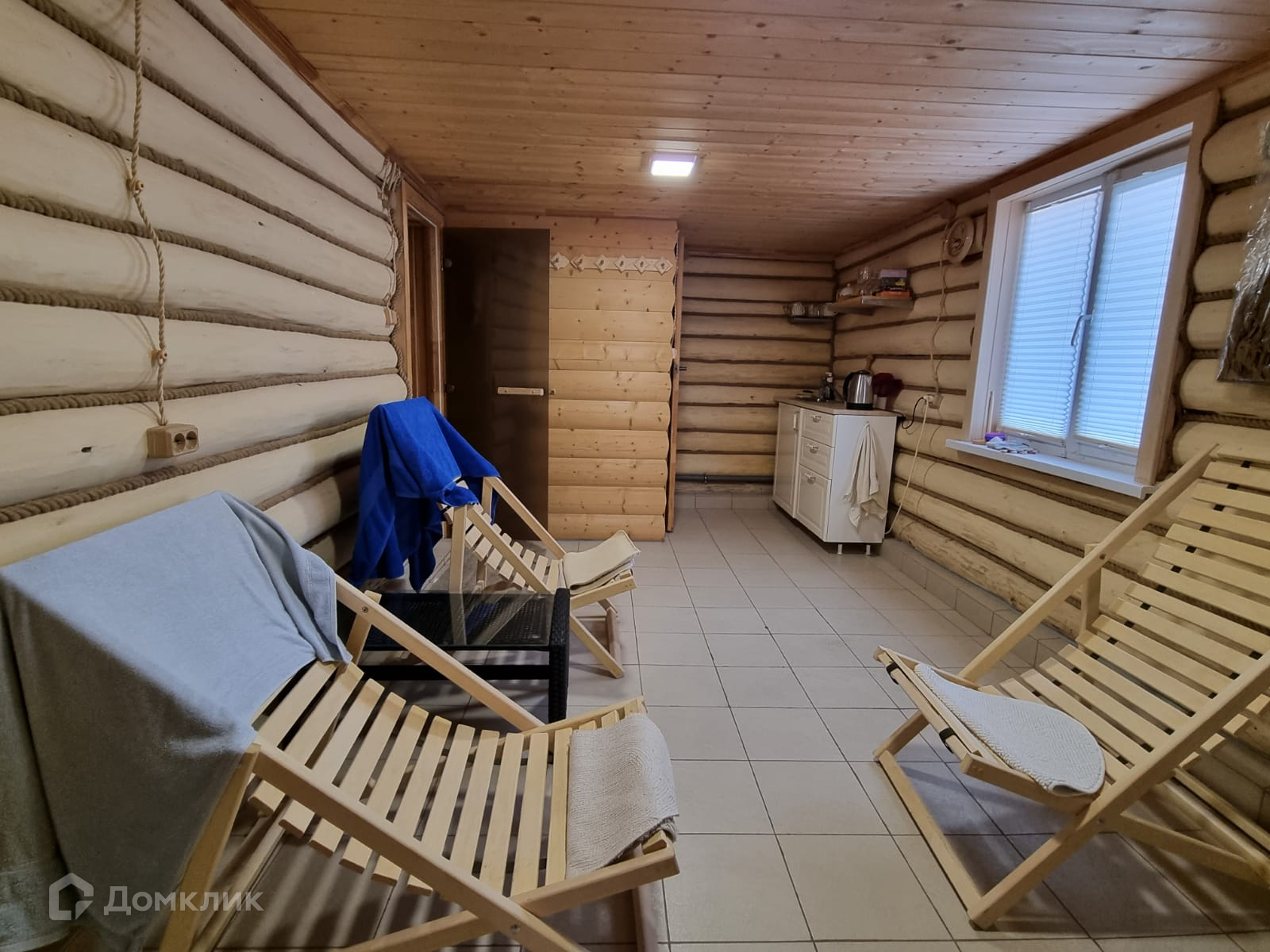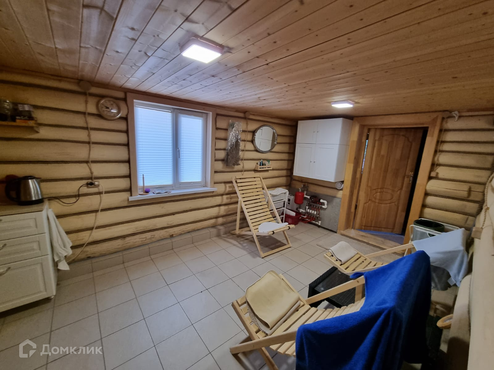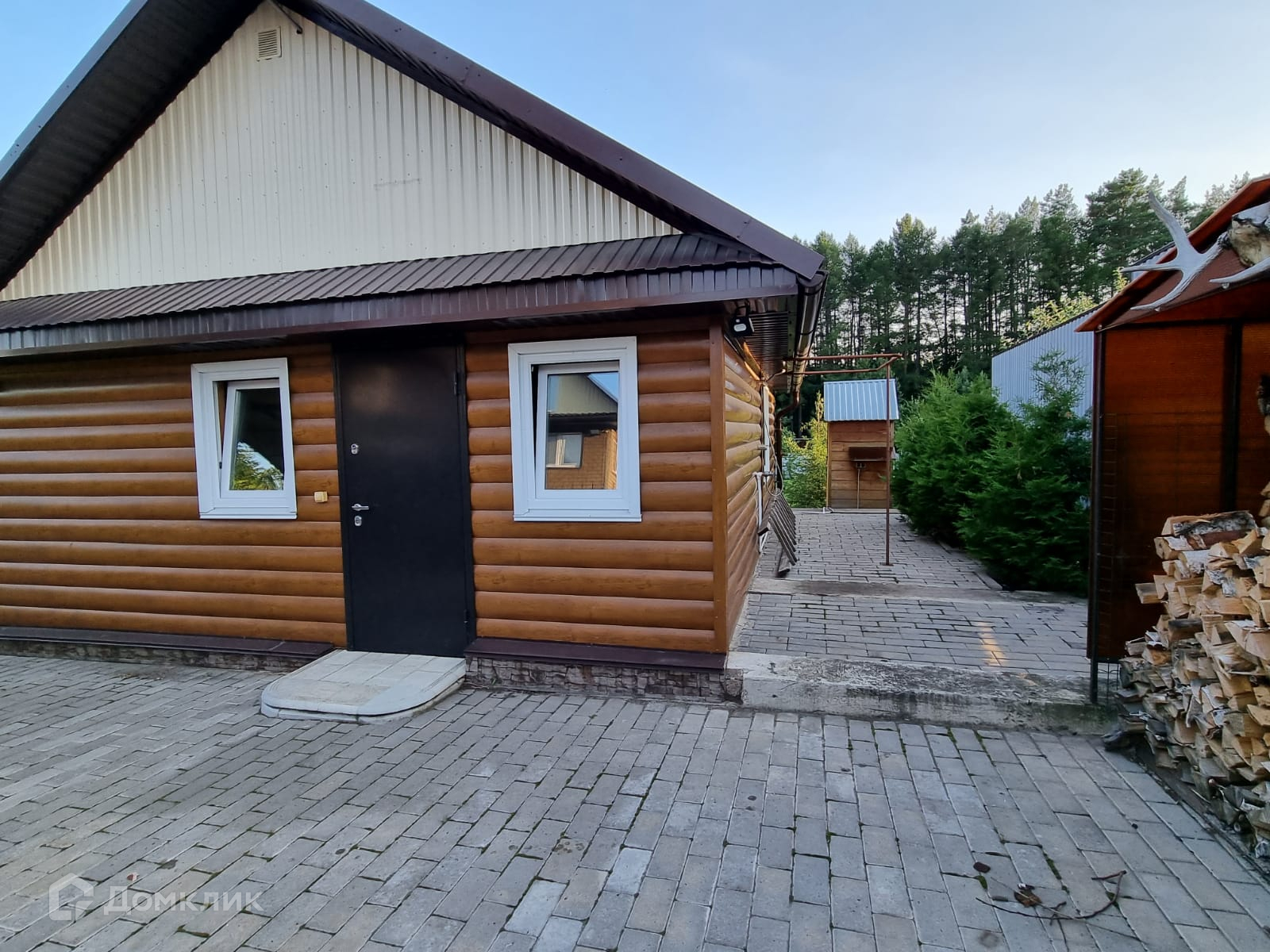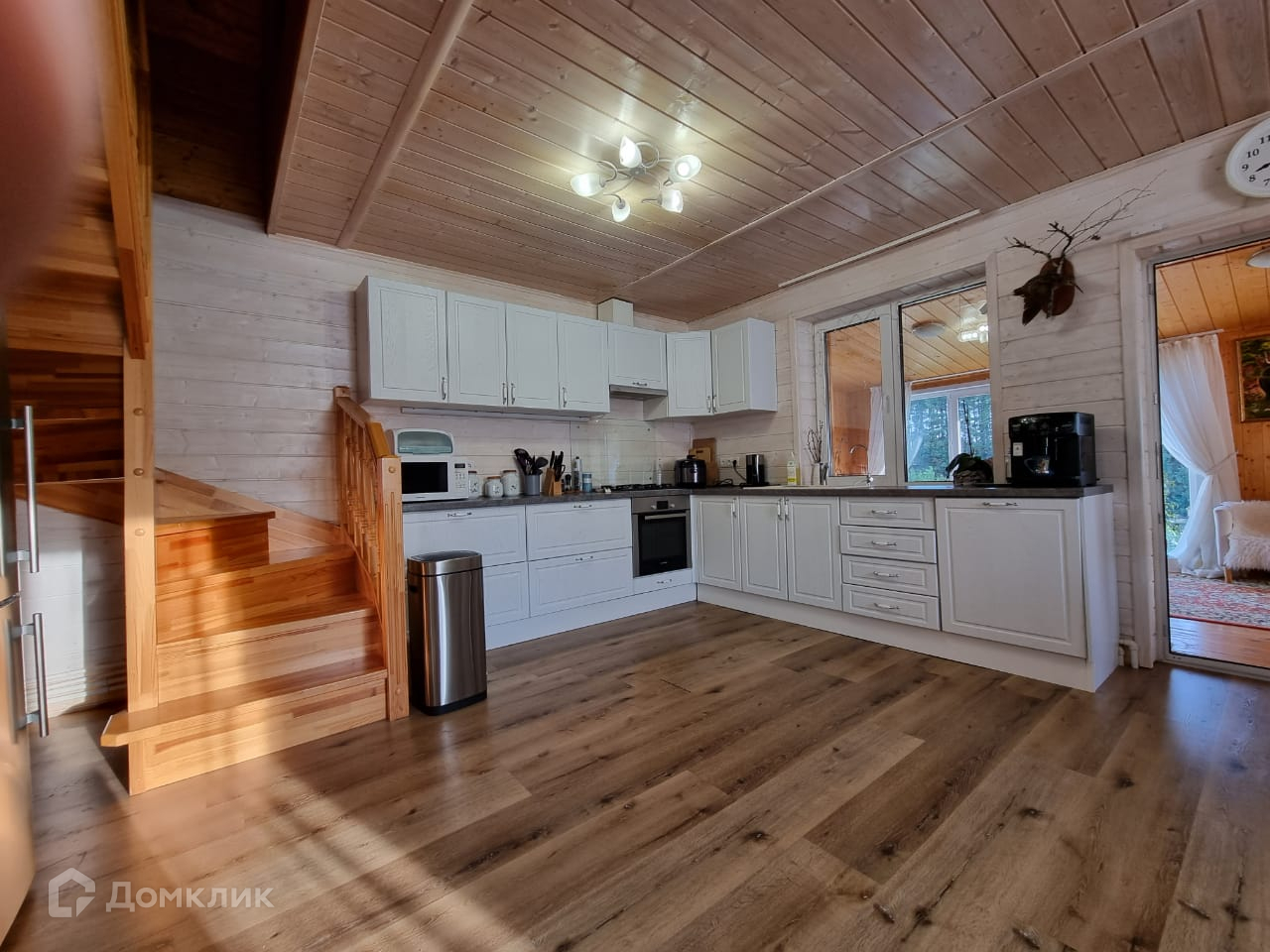 Дом внутри обшит деревом, полностью меблирован.