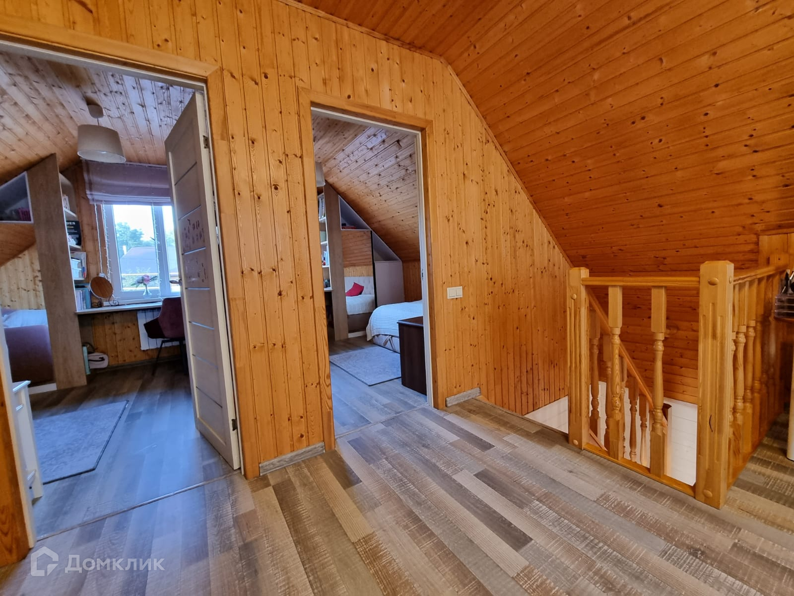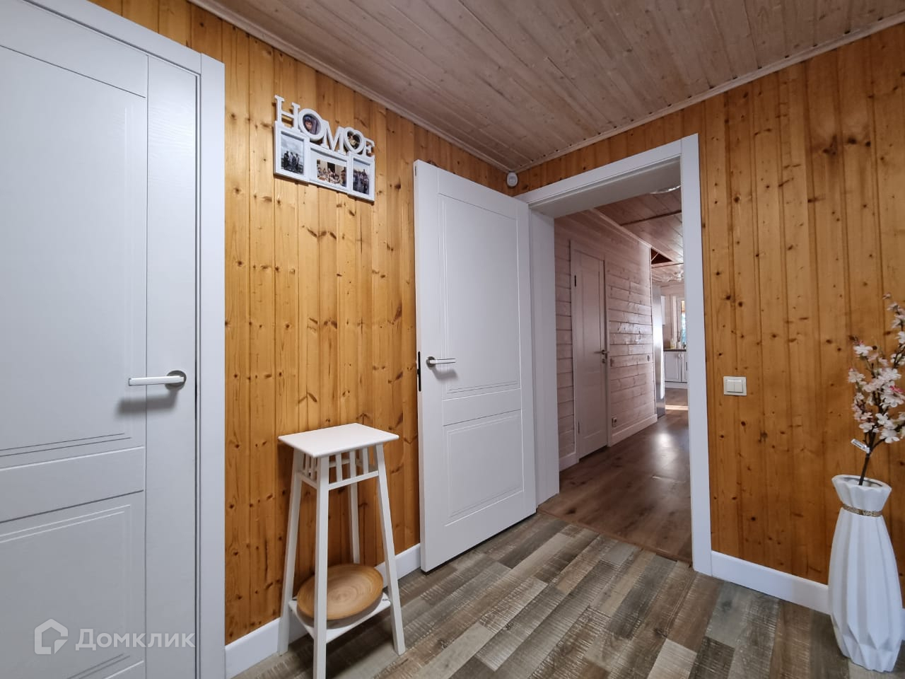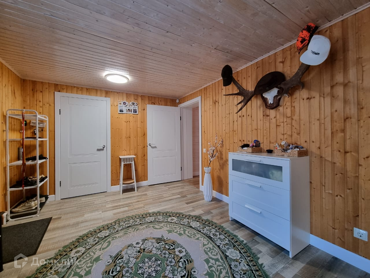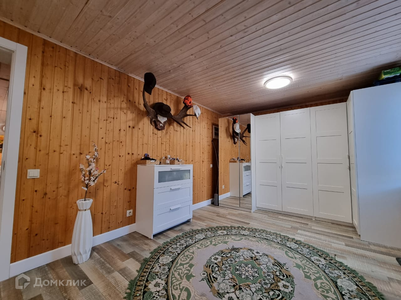 Дом внутри обшит деревом, полностью меблирован.