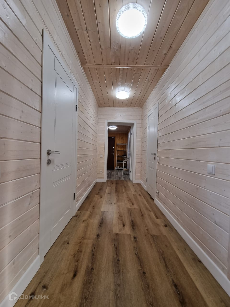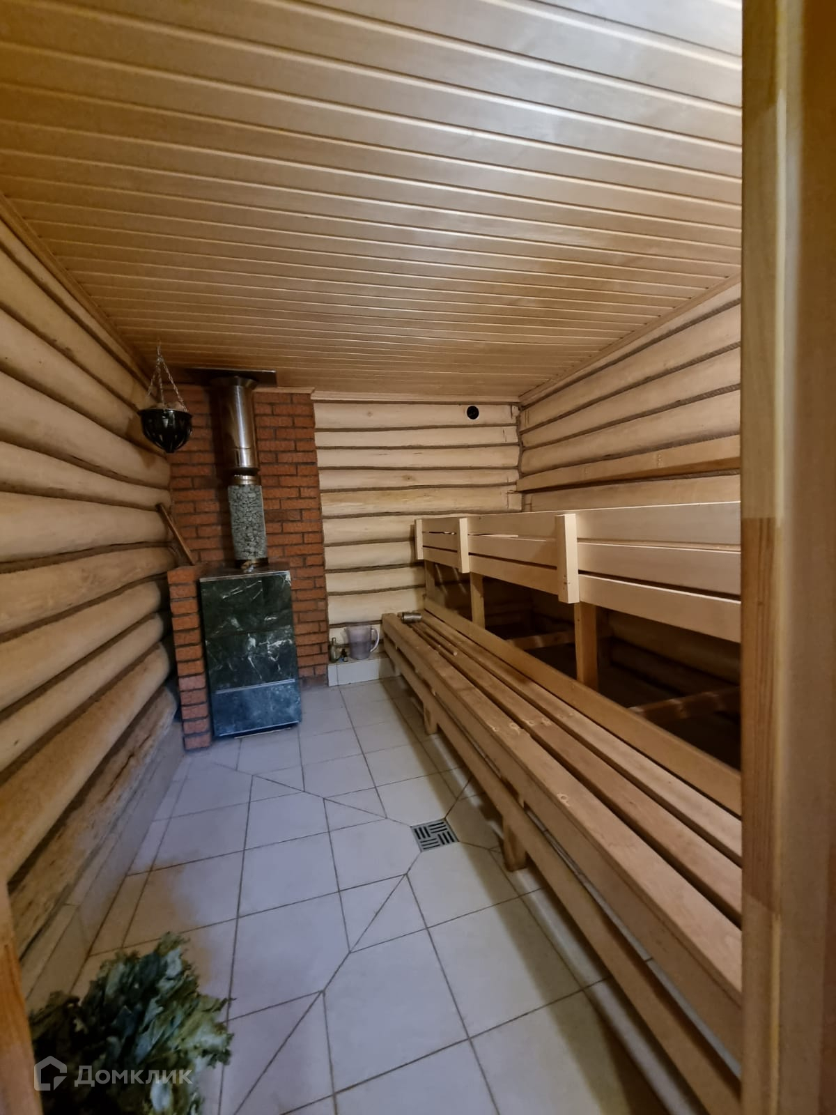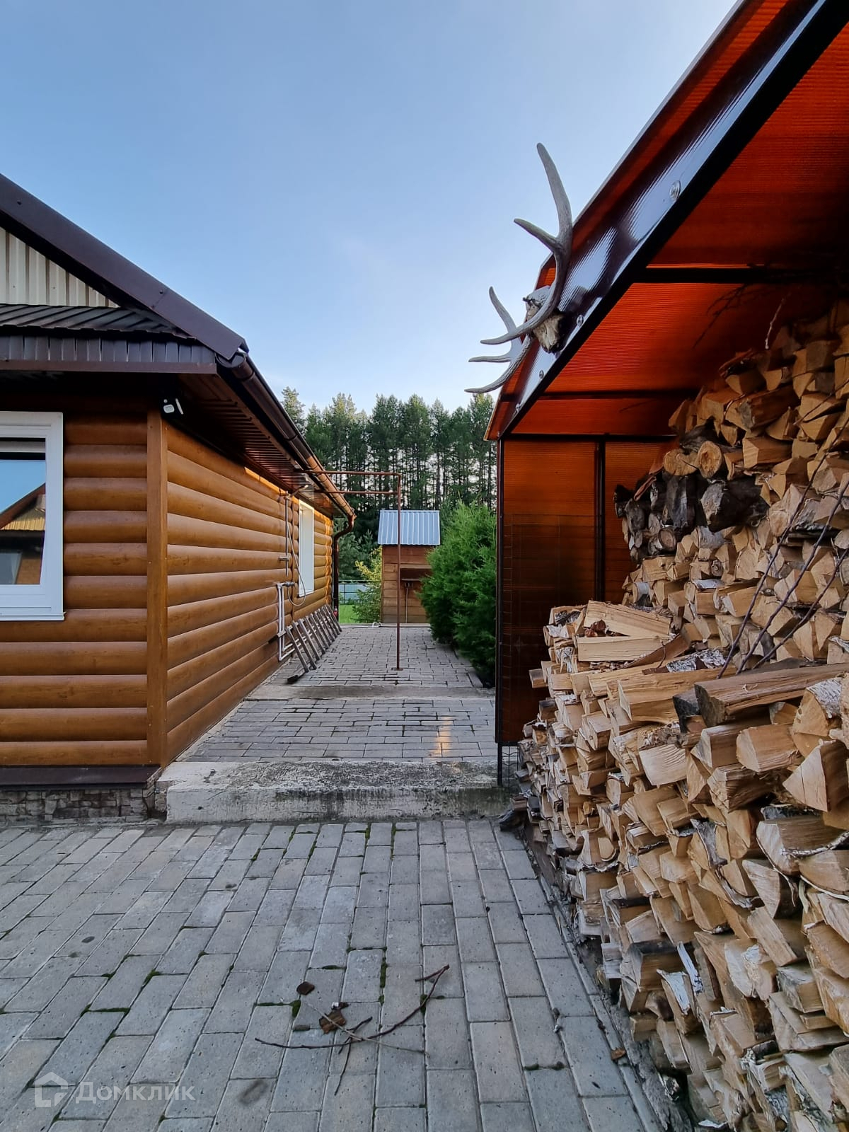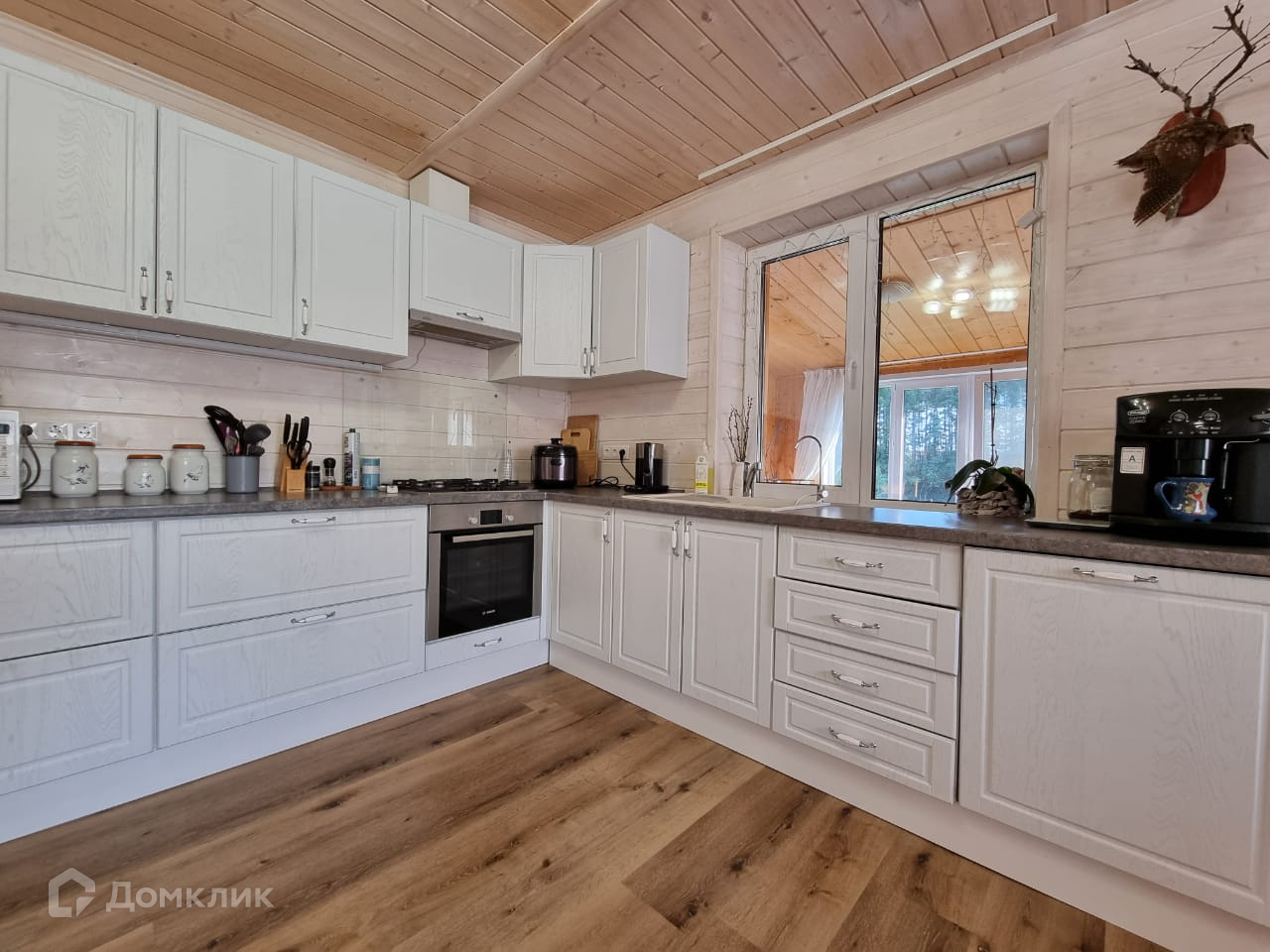 Дом внутри обшит деревом, полностью меблирован.