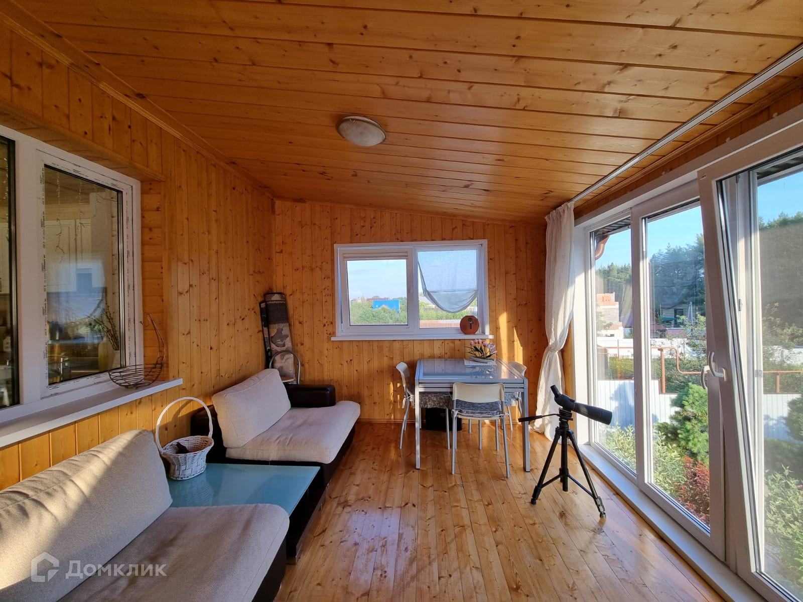 Веранда с панорамными окнами в пол и прекрасным видом на лес, окрестности.