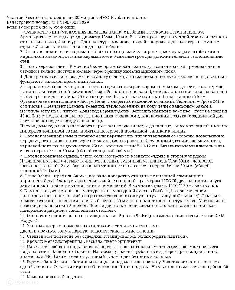 Капитальная баня из керамзитоблока, облицованная кирпичом, на постоянном отоплении - тёплый пол. Окна в северном исполнении 80й профиль - Рихау. Печь о компании технолит - чугунная в облицовке змеевик Гроза 24П с теплообменником на боку, бак для горячей воды на 85 литров. вынесен в мойку Основная дверь в баню с терморазрывом. Материал отделки парной Липа необрезная (стиль леший), в моечную зону на стены в данный момент закуплена плитка. Комната отдыха стены оштукатуренны, потолок - натяжной. Полы во всех помещениях керамогранит. Для отопления тёплых полов используется котёл 9кВт Протерм с возможностью установки gps модуля. Электричество подключено, установлен двухтарифный счётчик. Участок 9 соток. Имеется уличный туалет. Колодец. Также на участке остаётся 20 тонн щебня и 3 поддона кирпича. В коттеджном посёлке работает магазин, ходит школьный автобус для развозки детей в школу, в пешей доступности река с пирсом, и лесной массив.