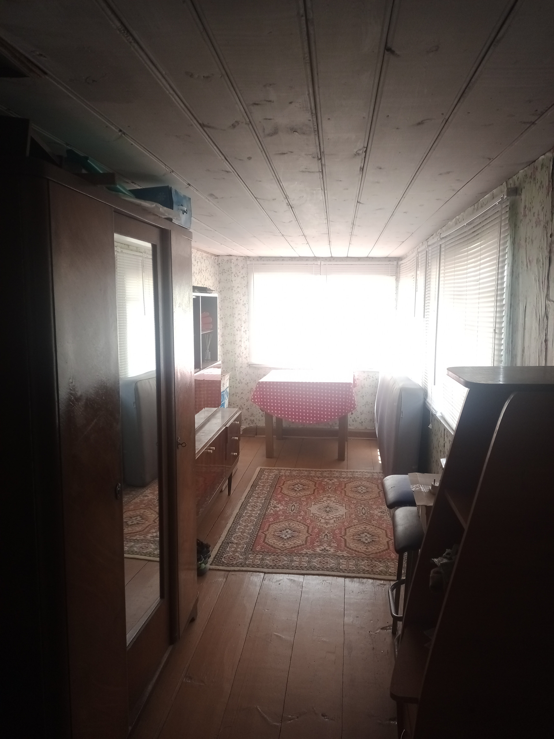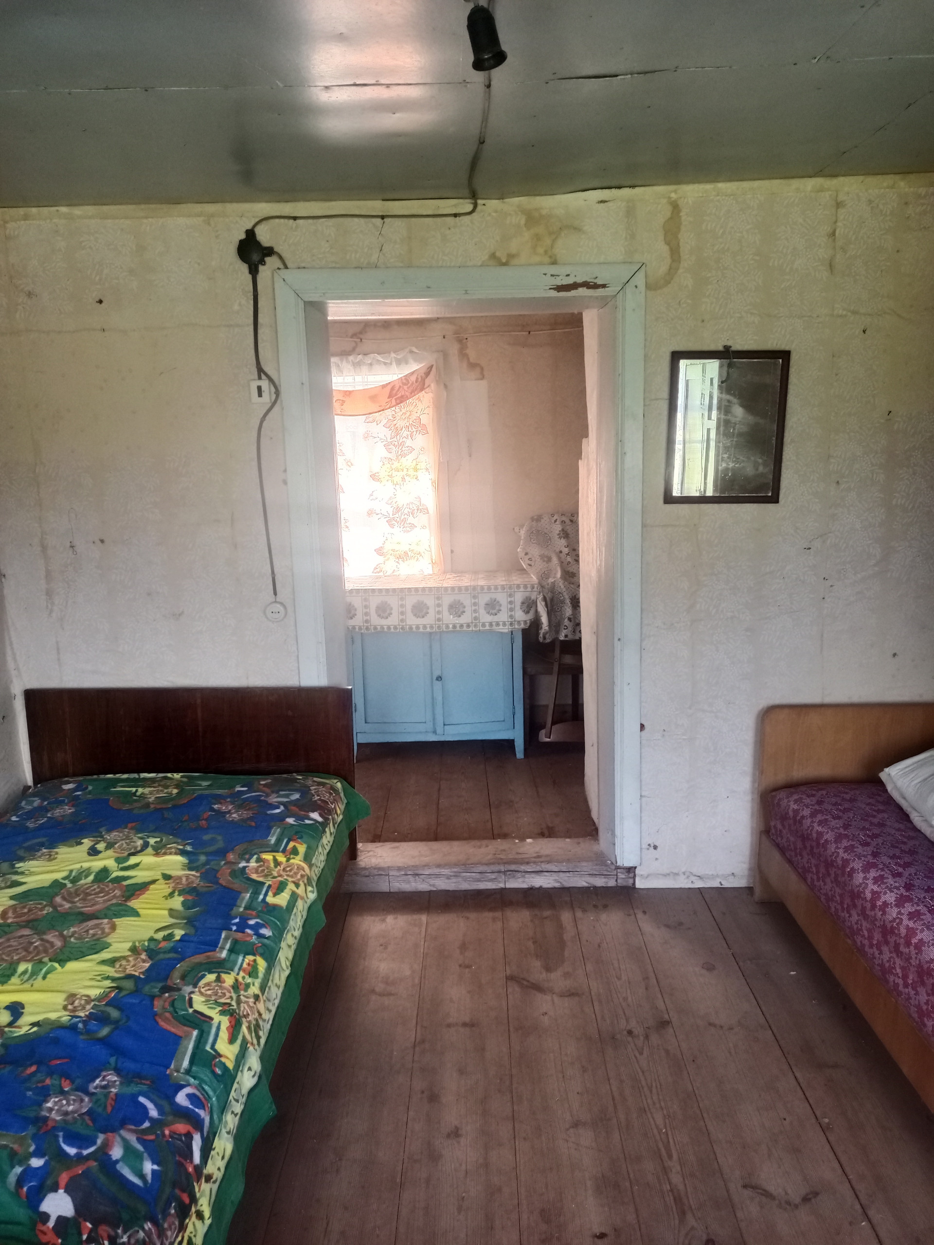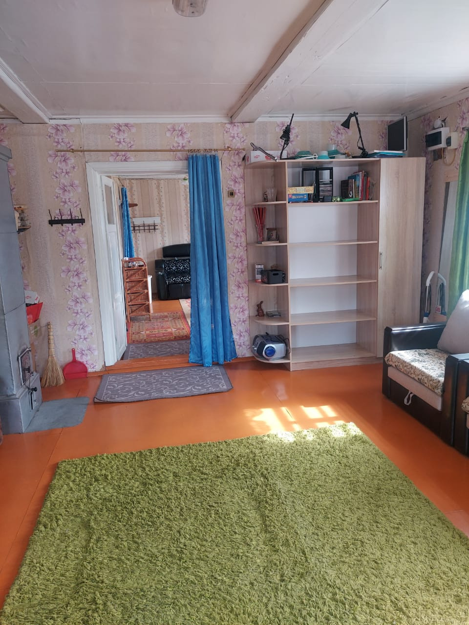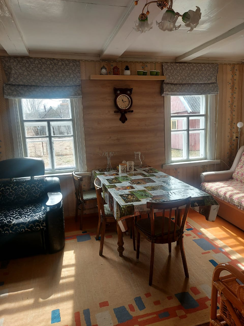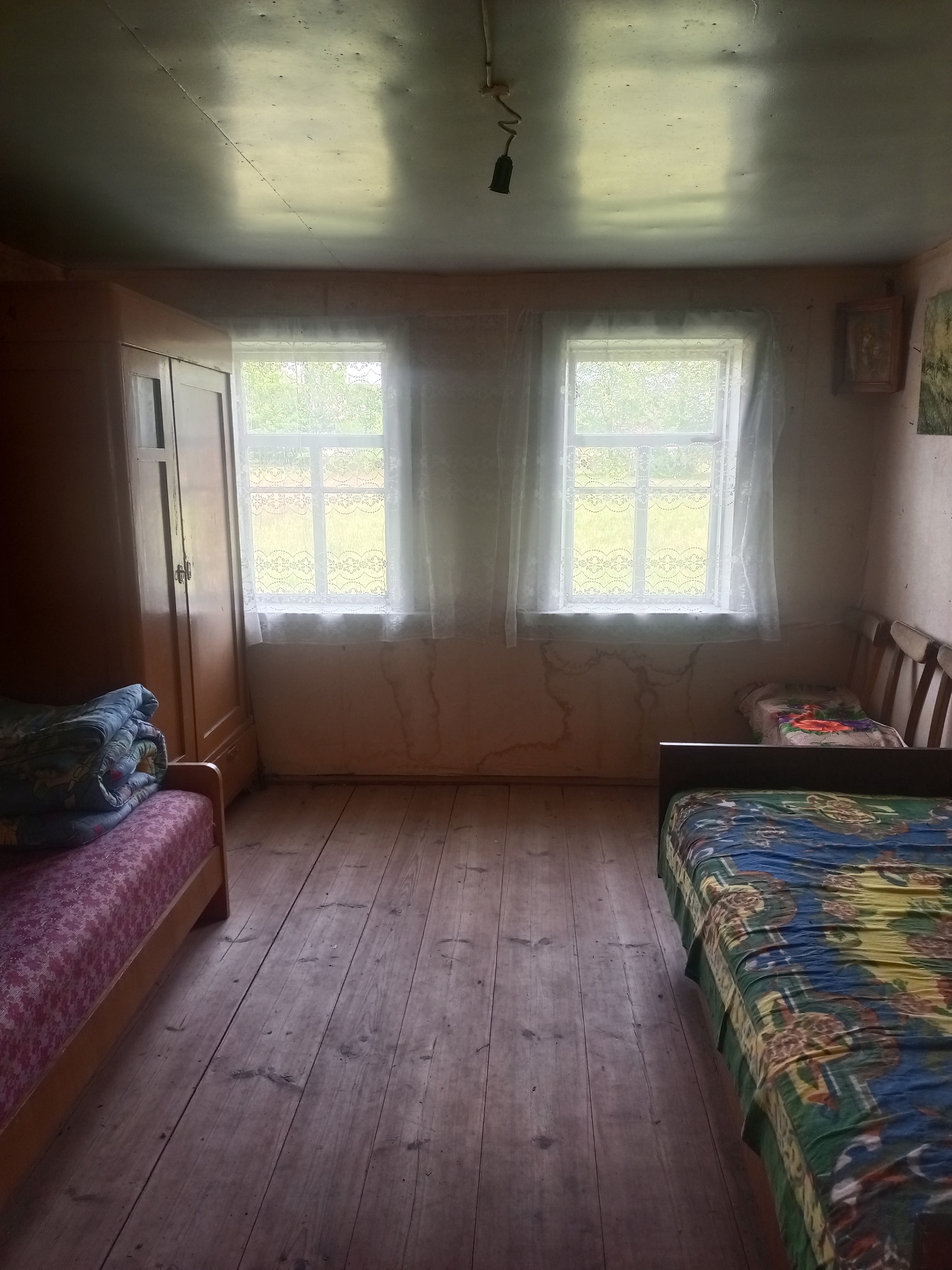 Далее: столовая - гостиная и большая общая спальня, дополнительная печь для отопления, (2 комнаты). Окна - добротные двойные деревянные рамы.