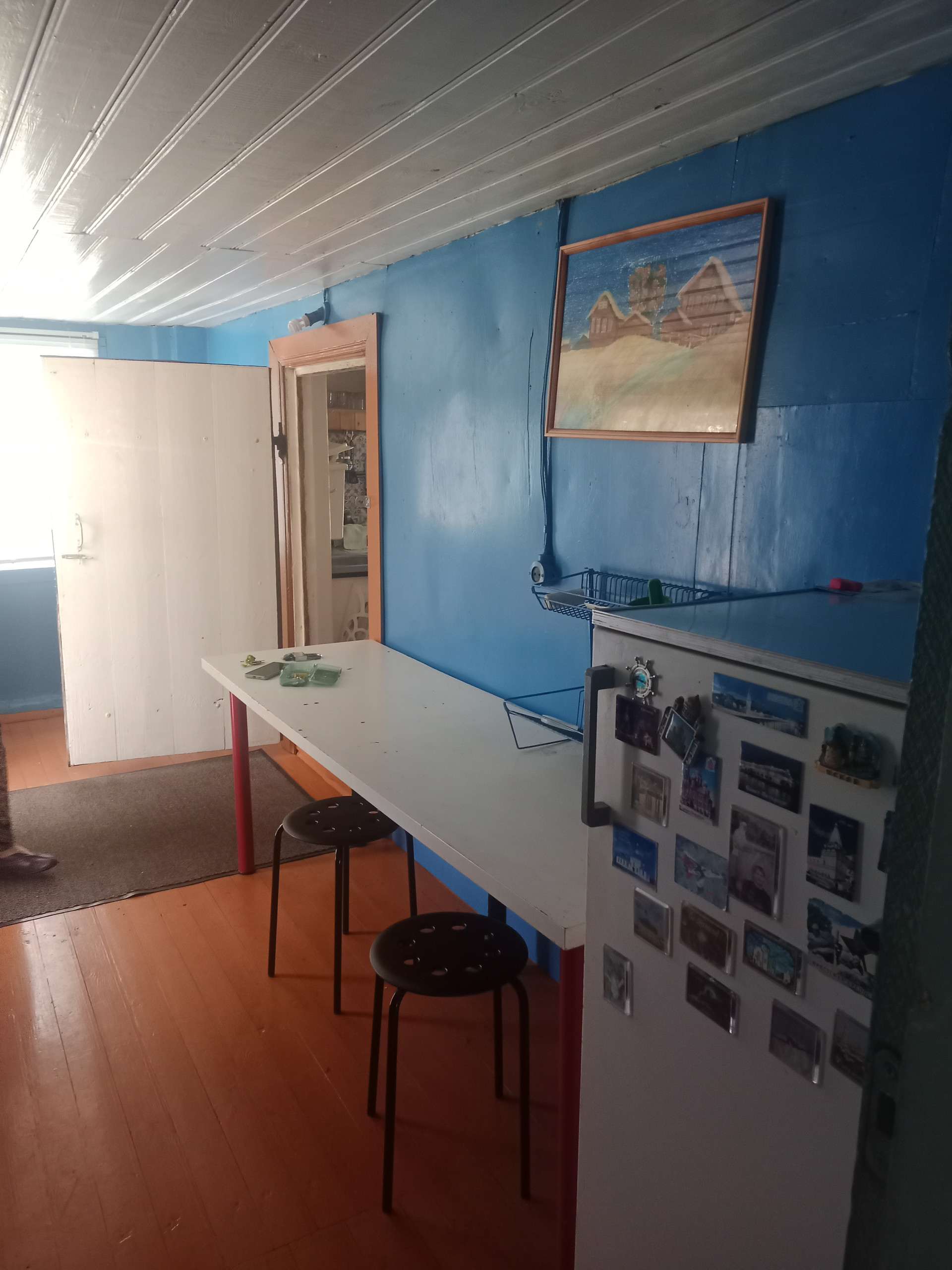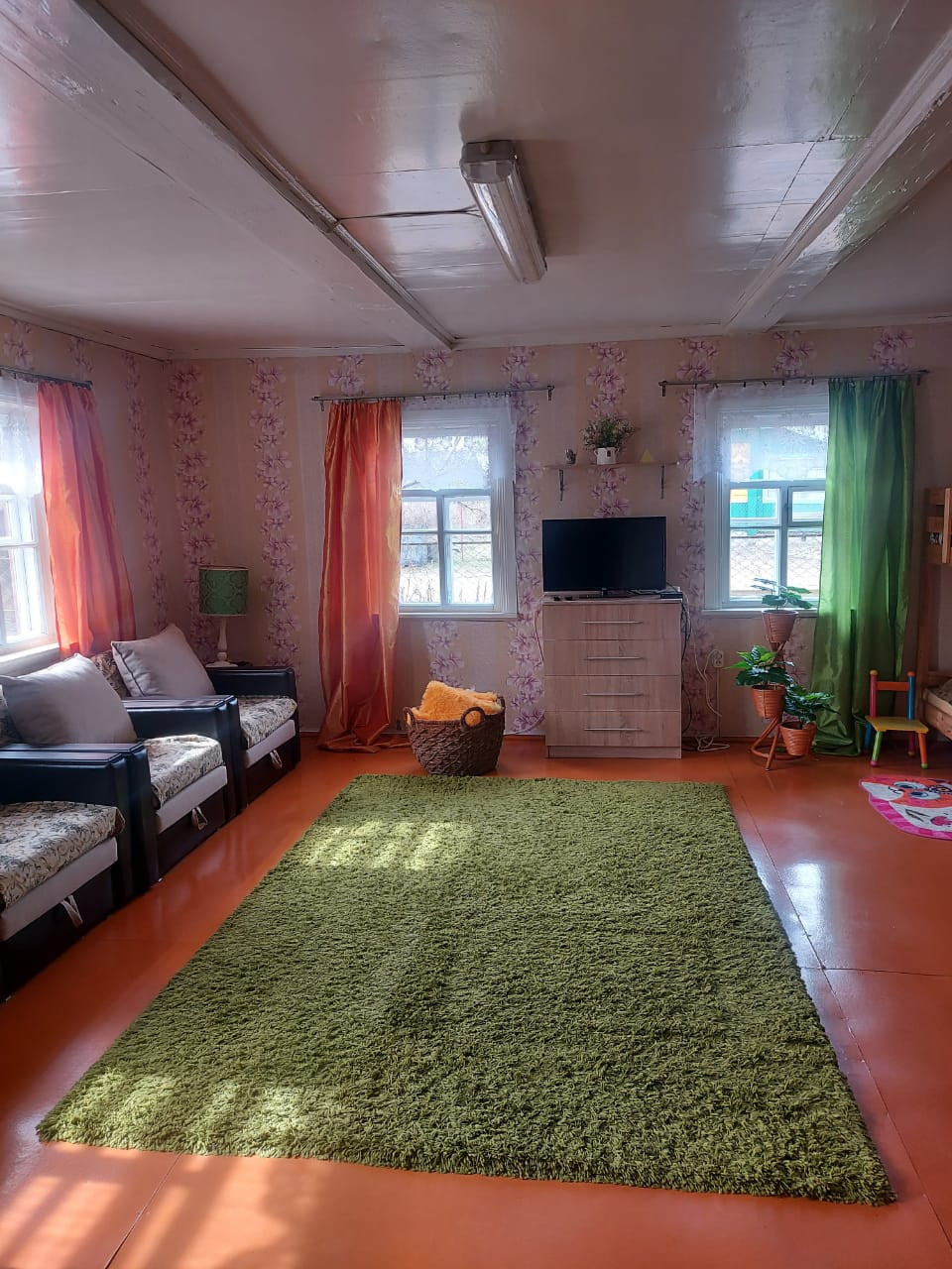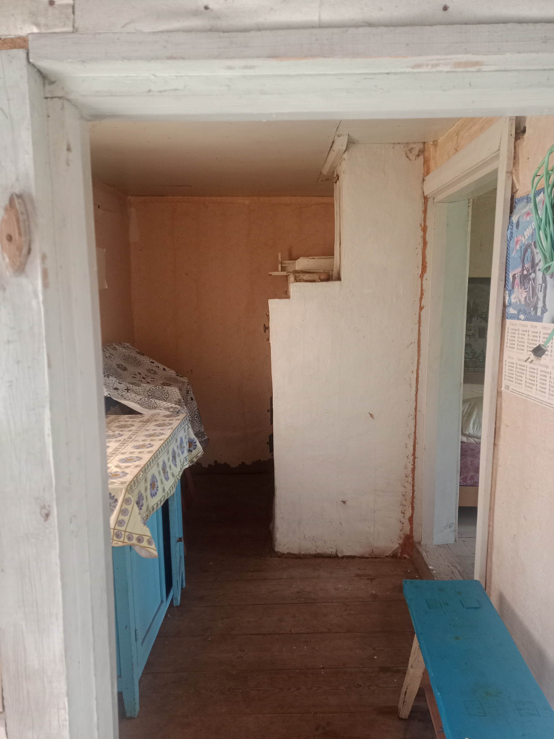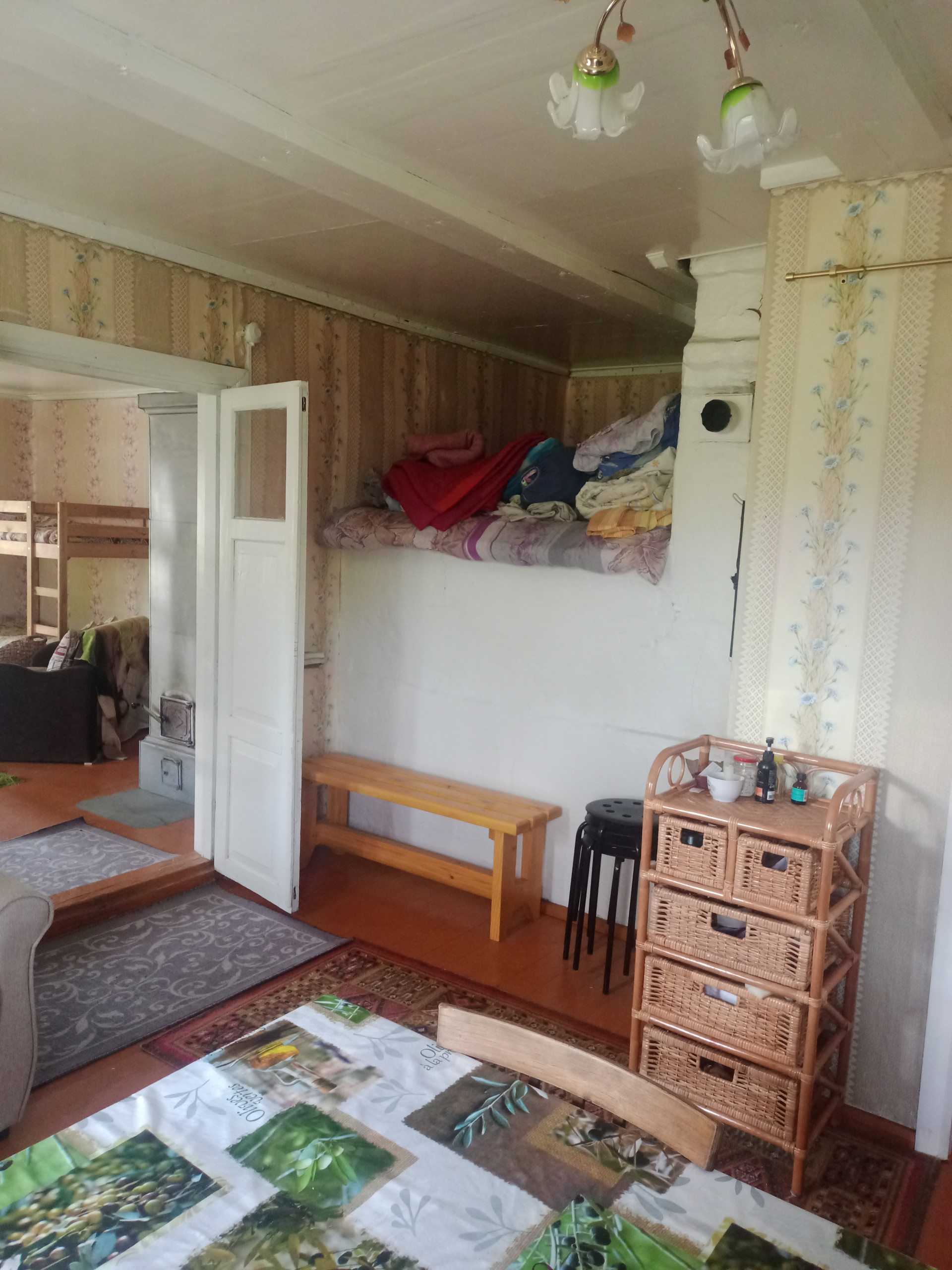 Далее: столовая - гостиная и большая общая спальня, дополнительная печь для отопления, (2 комнаты). Окна - добротные двойные деревянные рамы.
