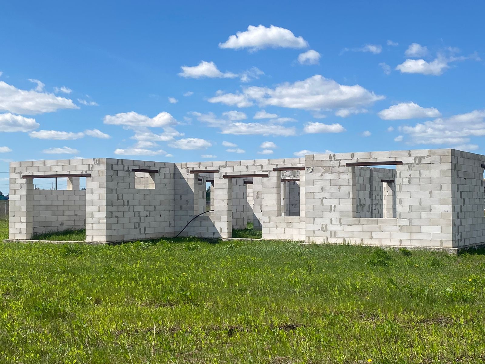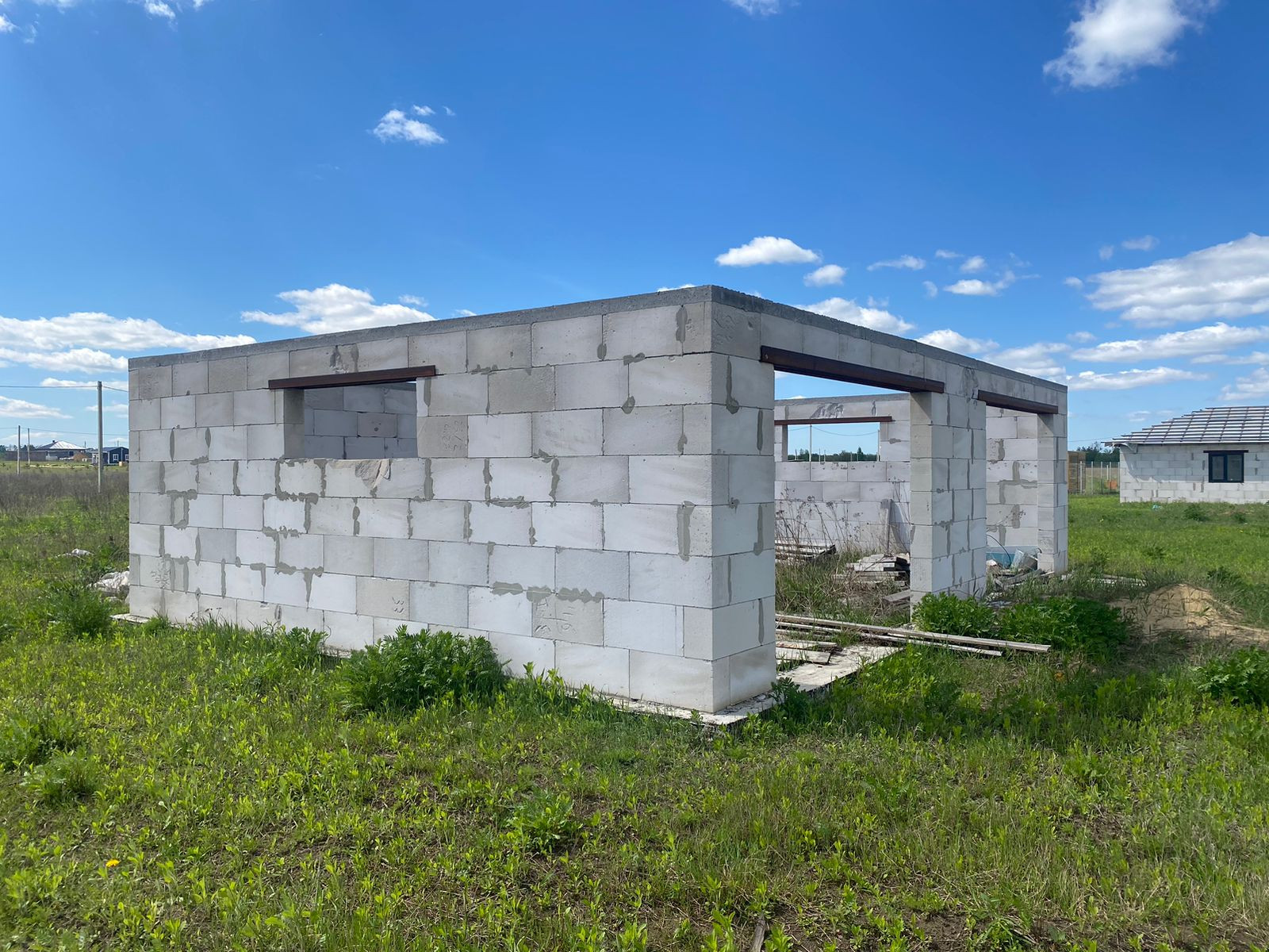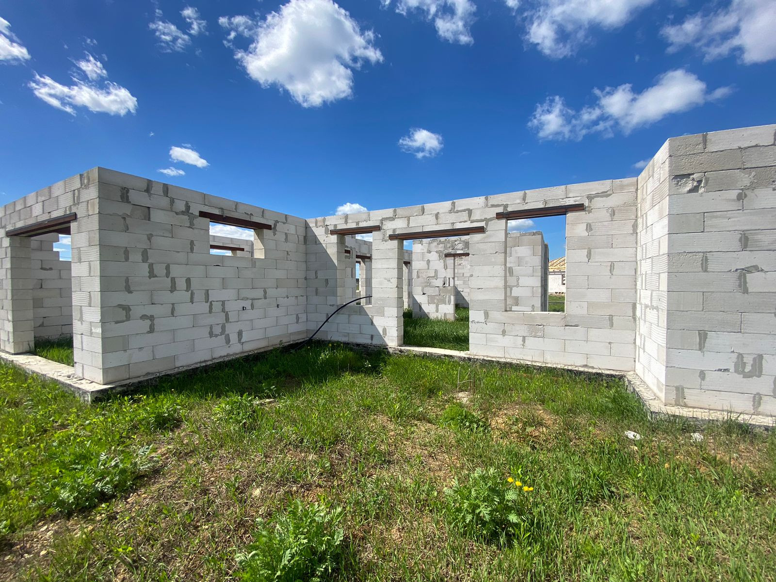 Дом выполнен из качественных пеноблоков, основан на ленточном фундаменте, который рассчитан на два этажа. Возведен под крышу!