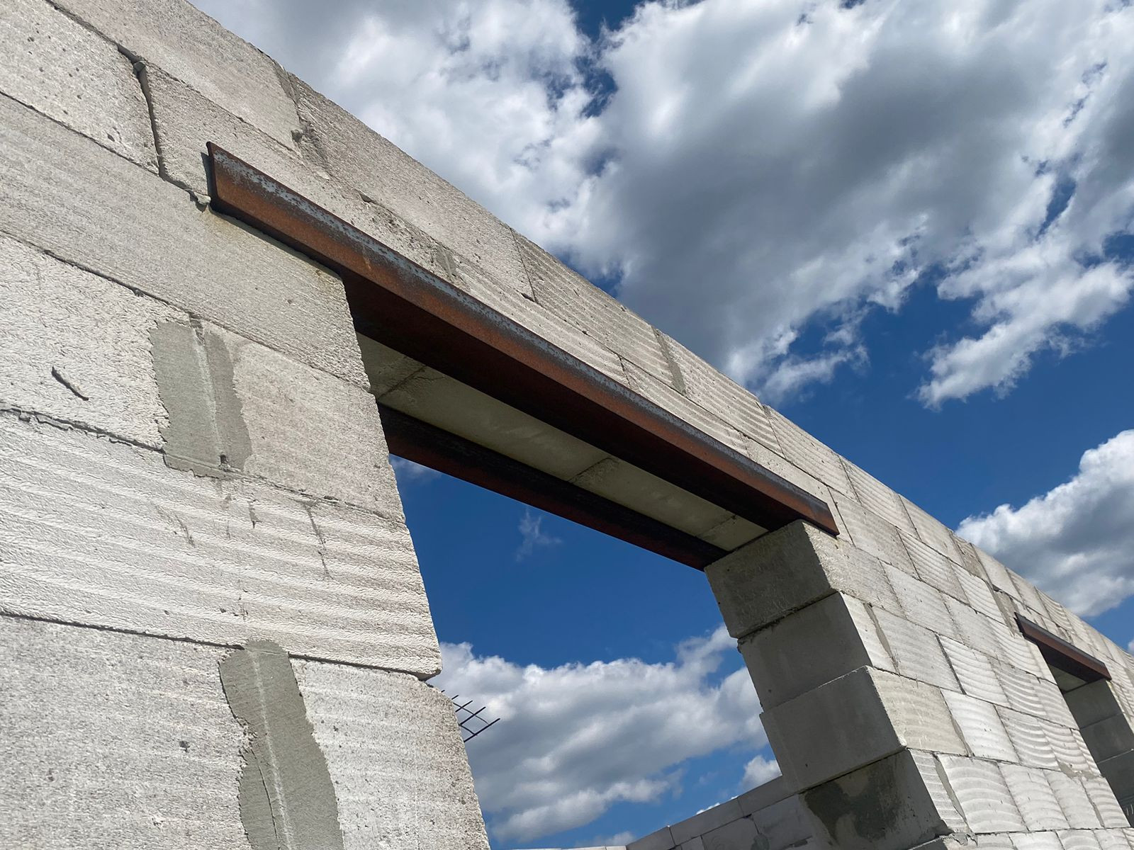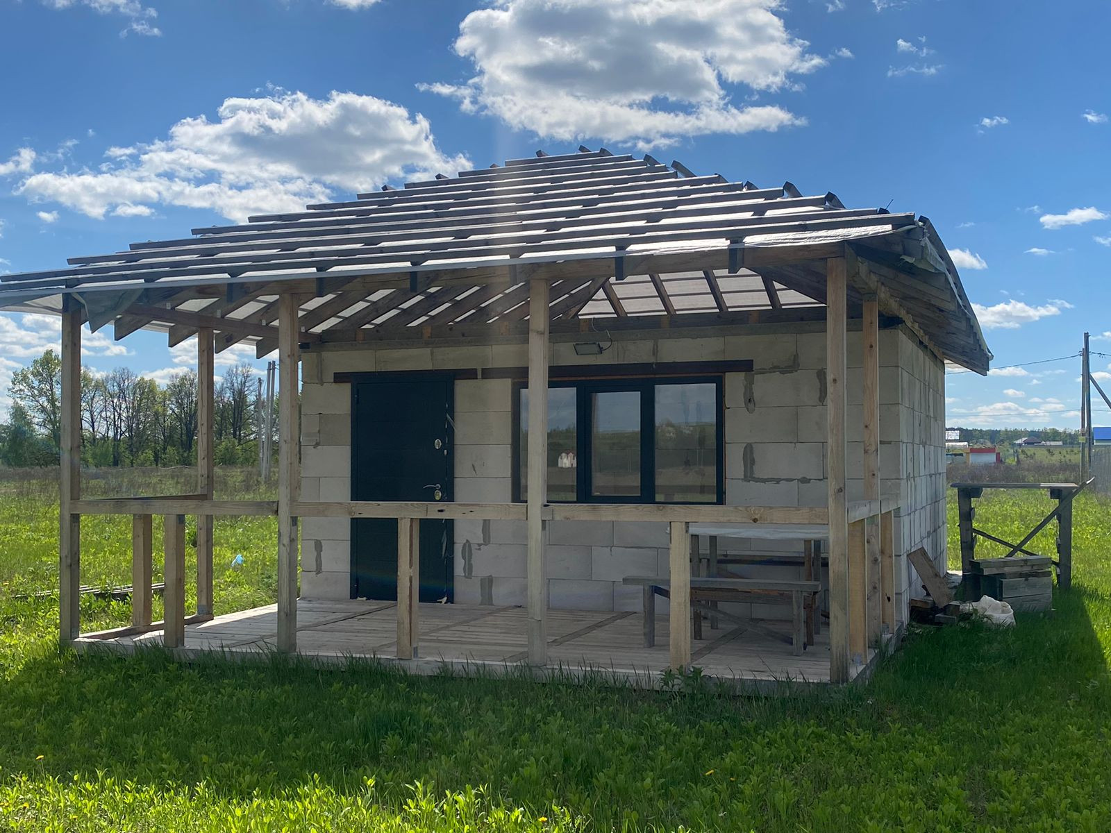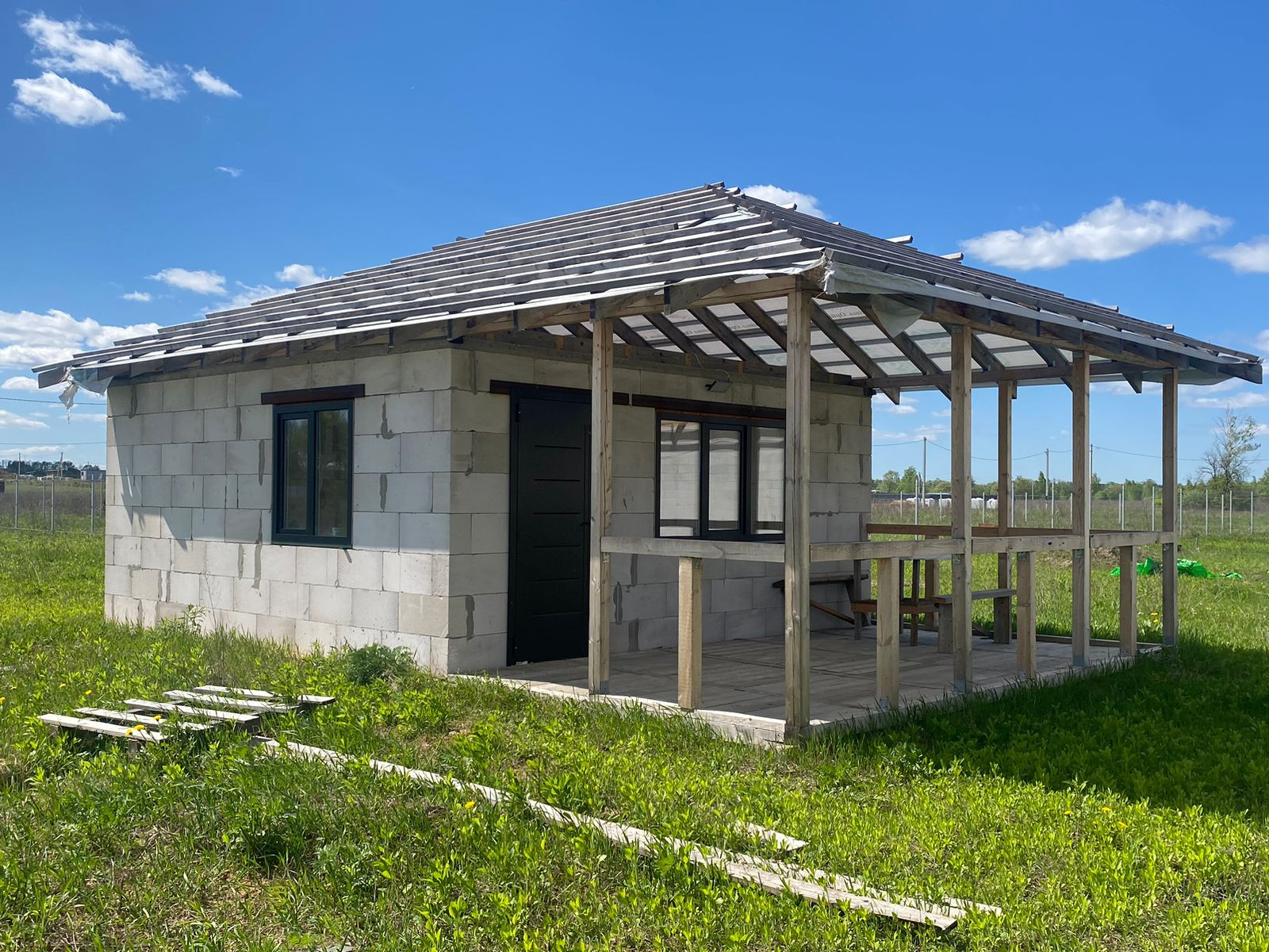 Дом выполнен из качественных пеноблоков, основан на ленточном фундаменте, который рассчитан на два этажа. Возведен под крышу!