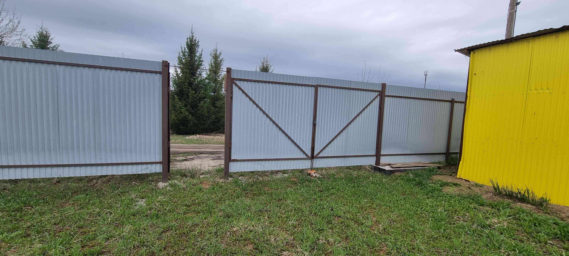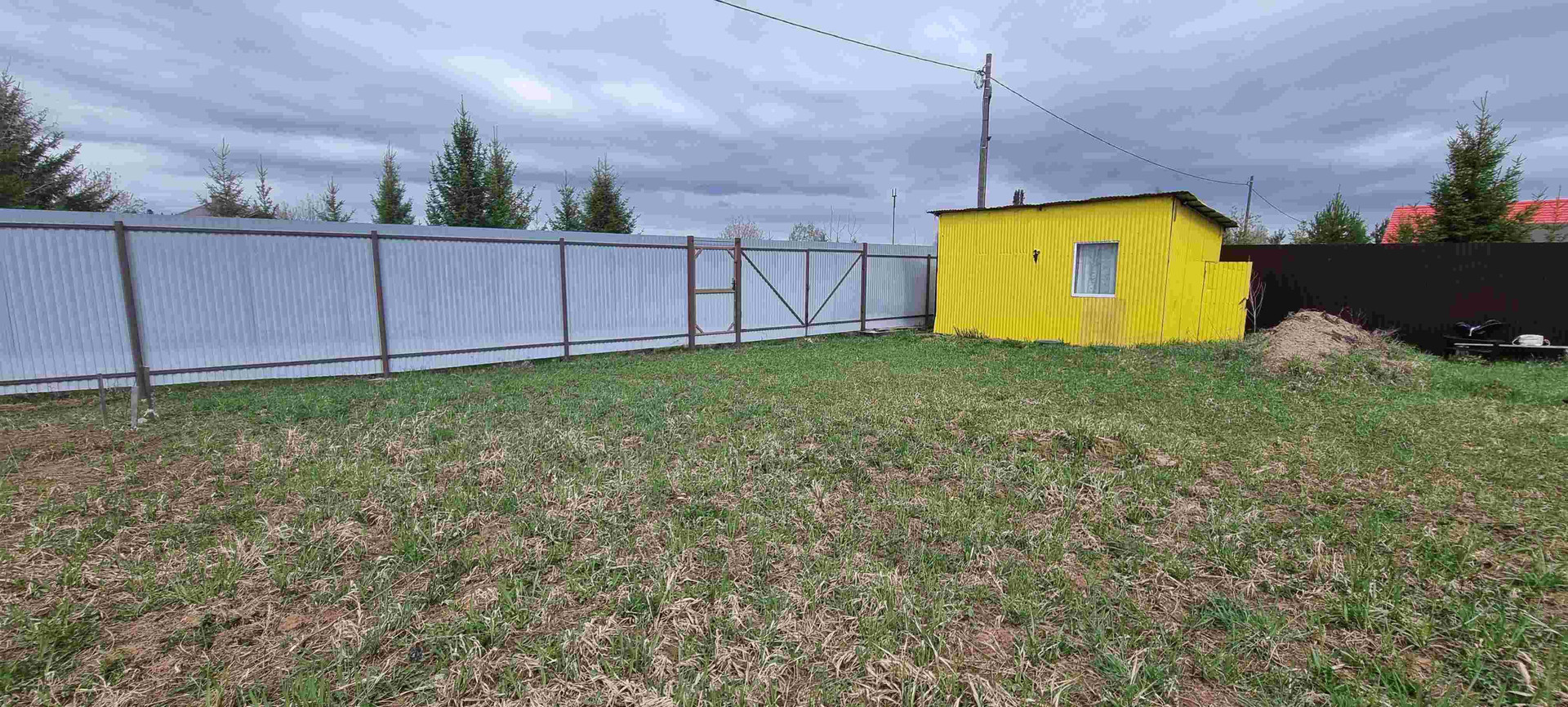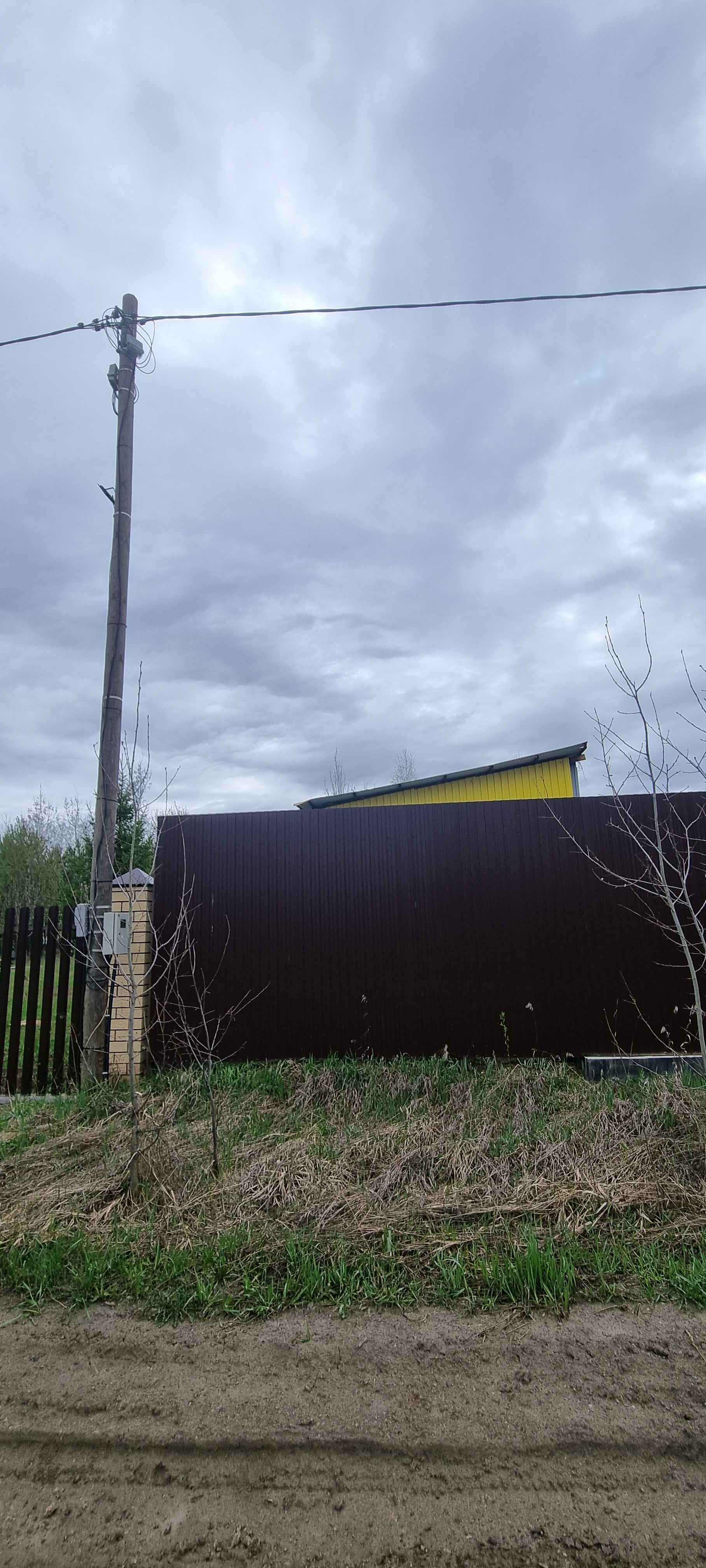 Участок огорожен забором со всех сторон, 1 сторона забора из дерева, 3 стороны из профнастила. Ворота: калитка,распашные для проезда автомобиля и залита тумба для откатных ворот.Так же на участке стоит бытовка 6×3, в ней электричество, свет,  холодильник, диван. Построен дачный туалет.