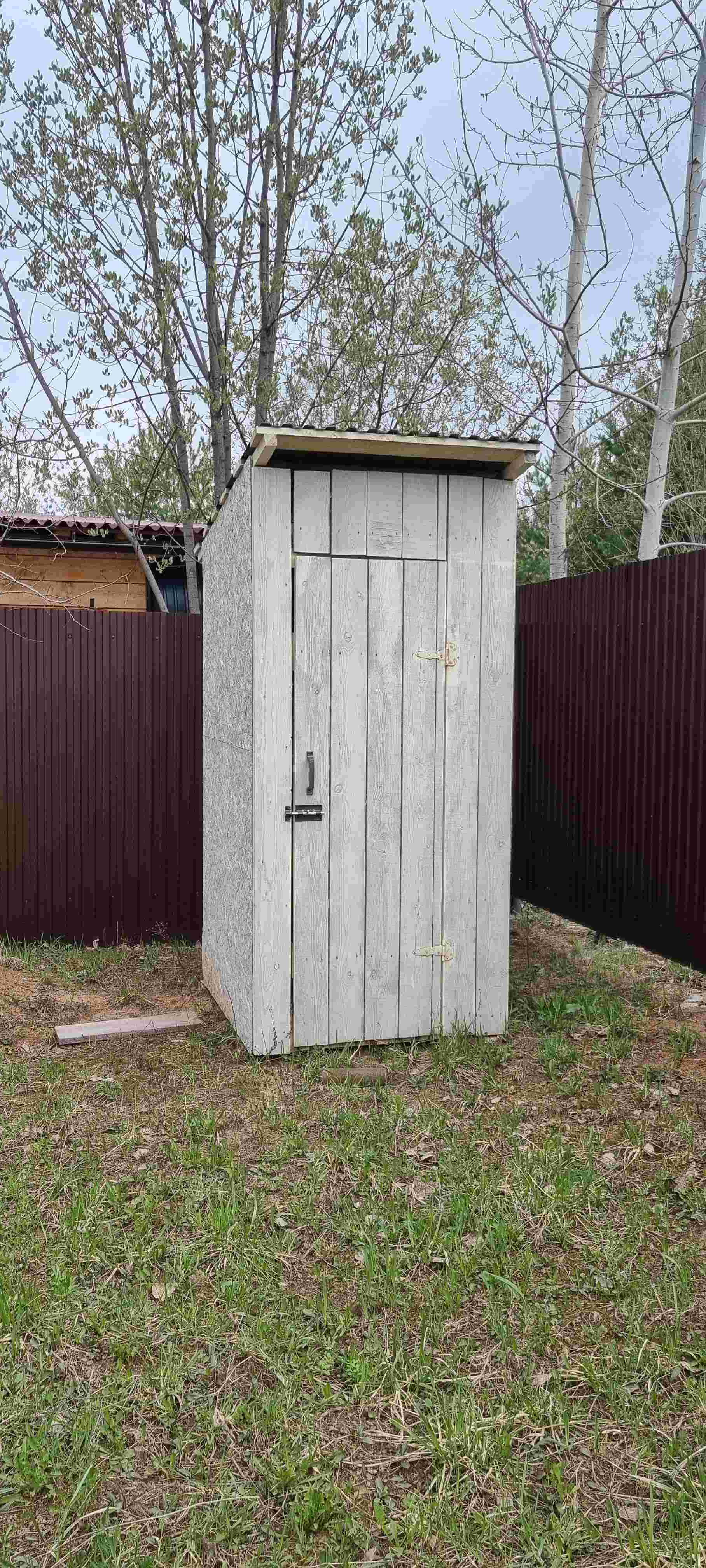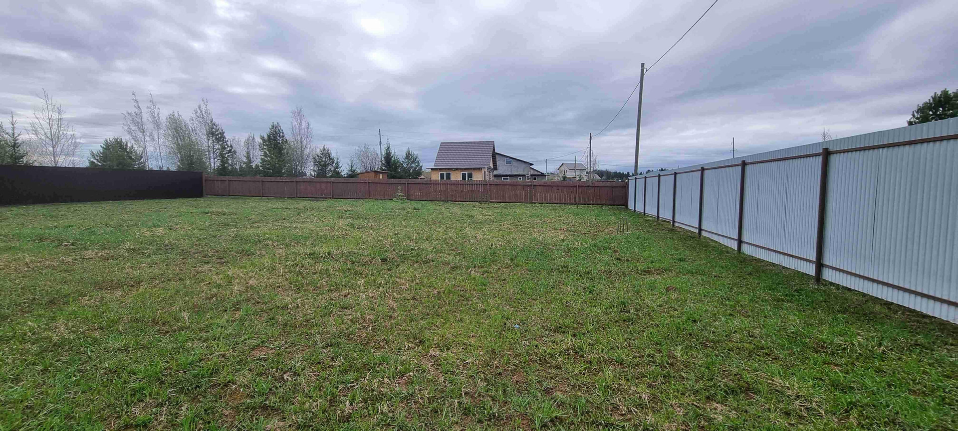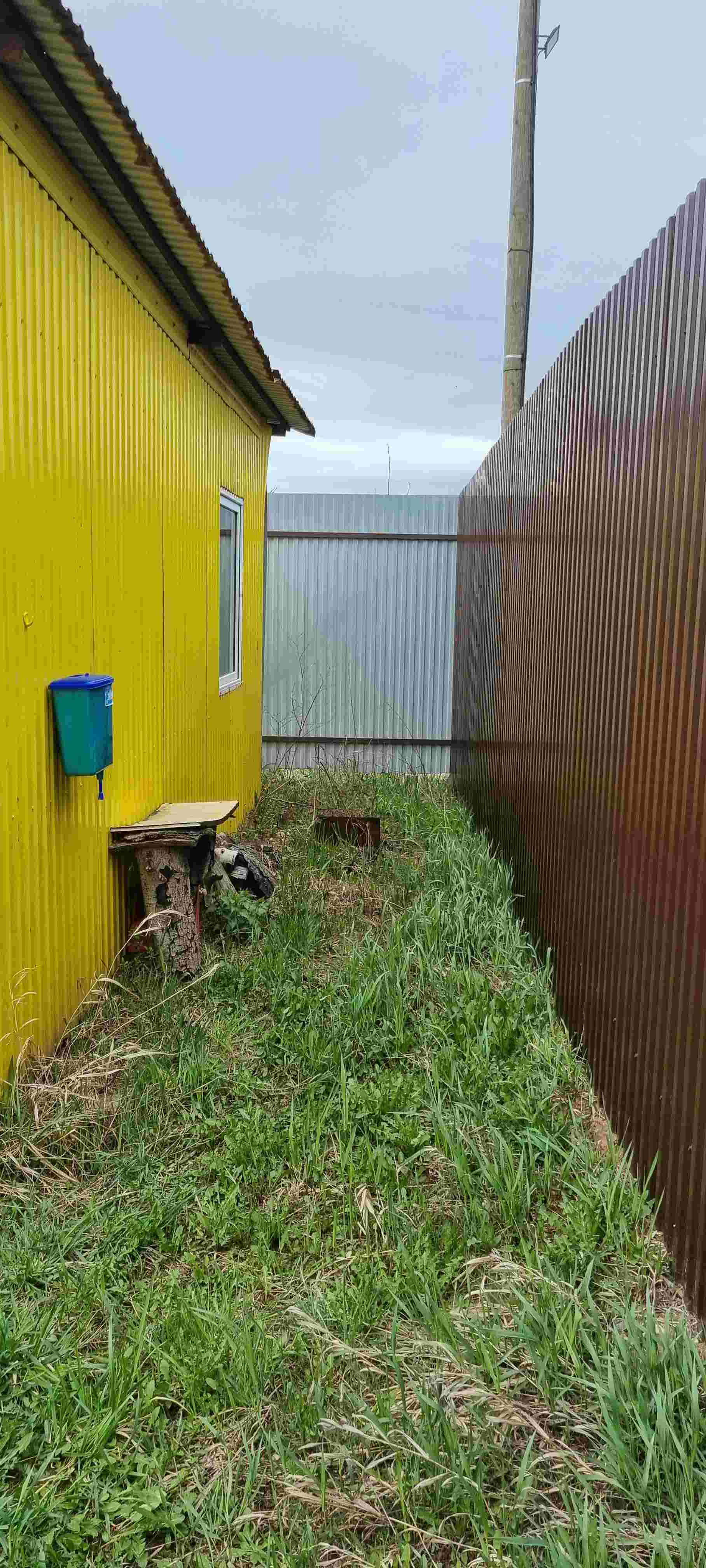 Участок огорожен забором со всех сторон, 1 сторона забора из дерева, 3 стороны из профнастила. Ворота: калитка,распашные для проезда автомобиля и залита тумба для откатных ворот.Так же на участке стоит бытовка 6×3, в ней электричество, свет,  холодильник, диван. Построен дачный туалет.