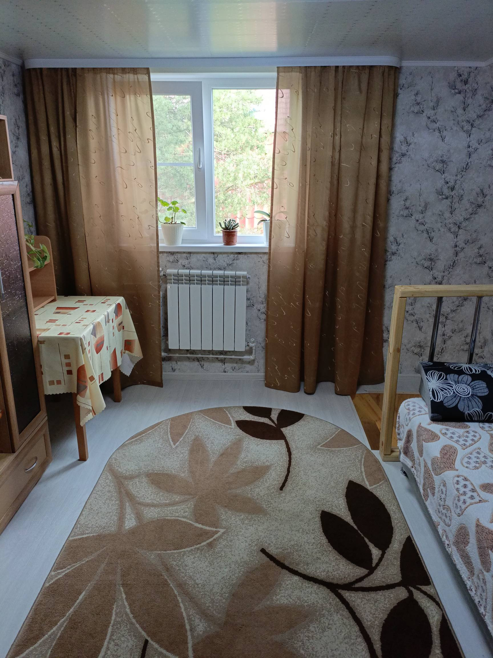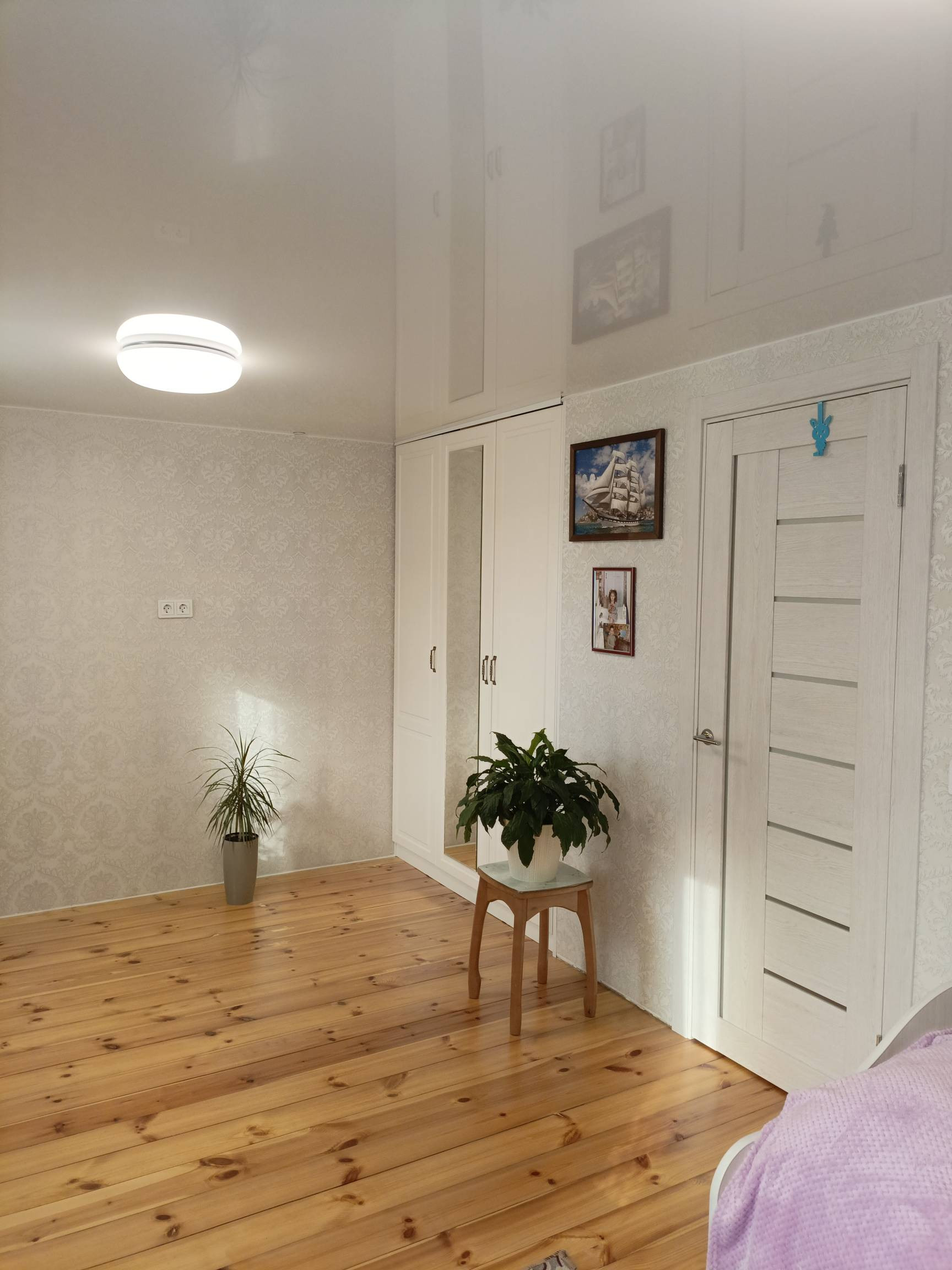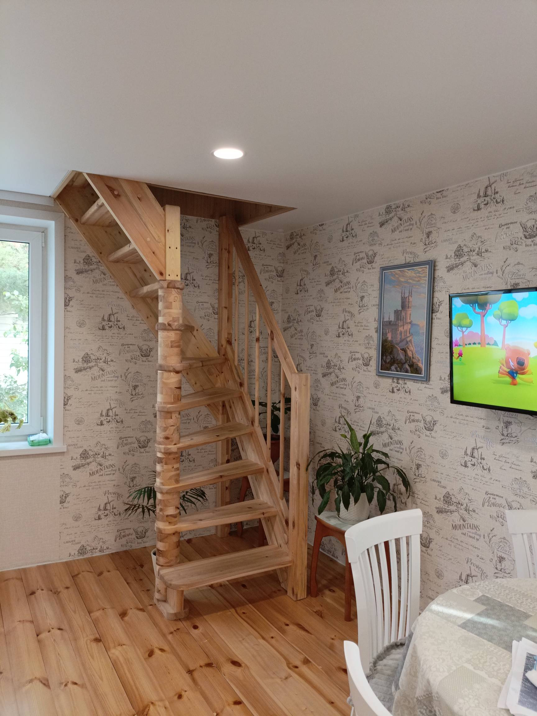 Третий этаж мансардный, тоже сделан свежий косметический ремонт, постелен линолеум, поклеены обои, сделан потолок.В мансарде остается вся мебель.