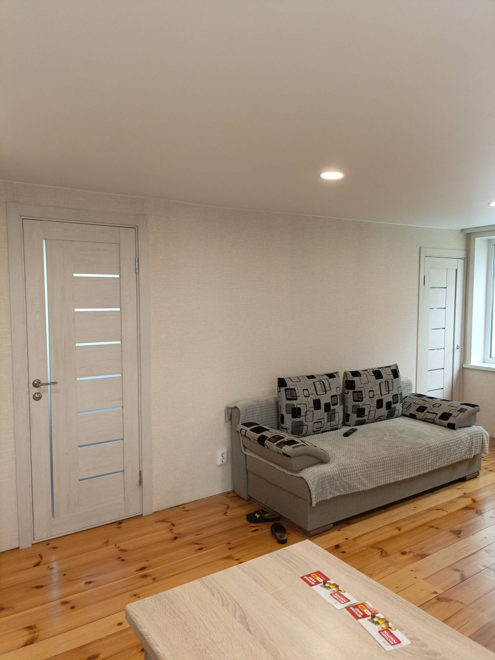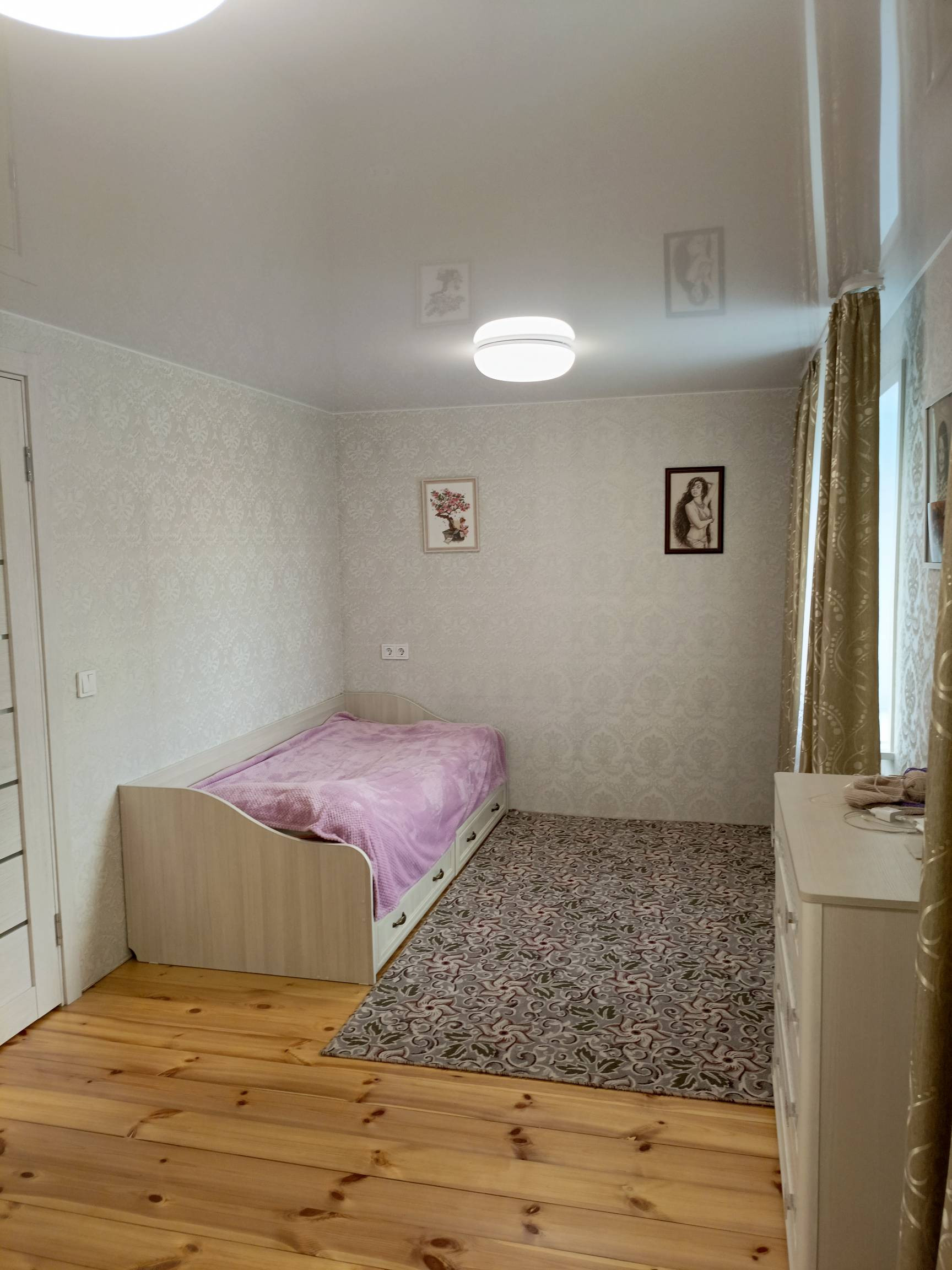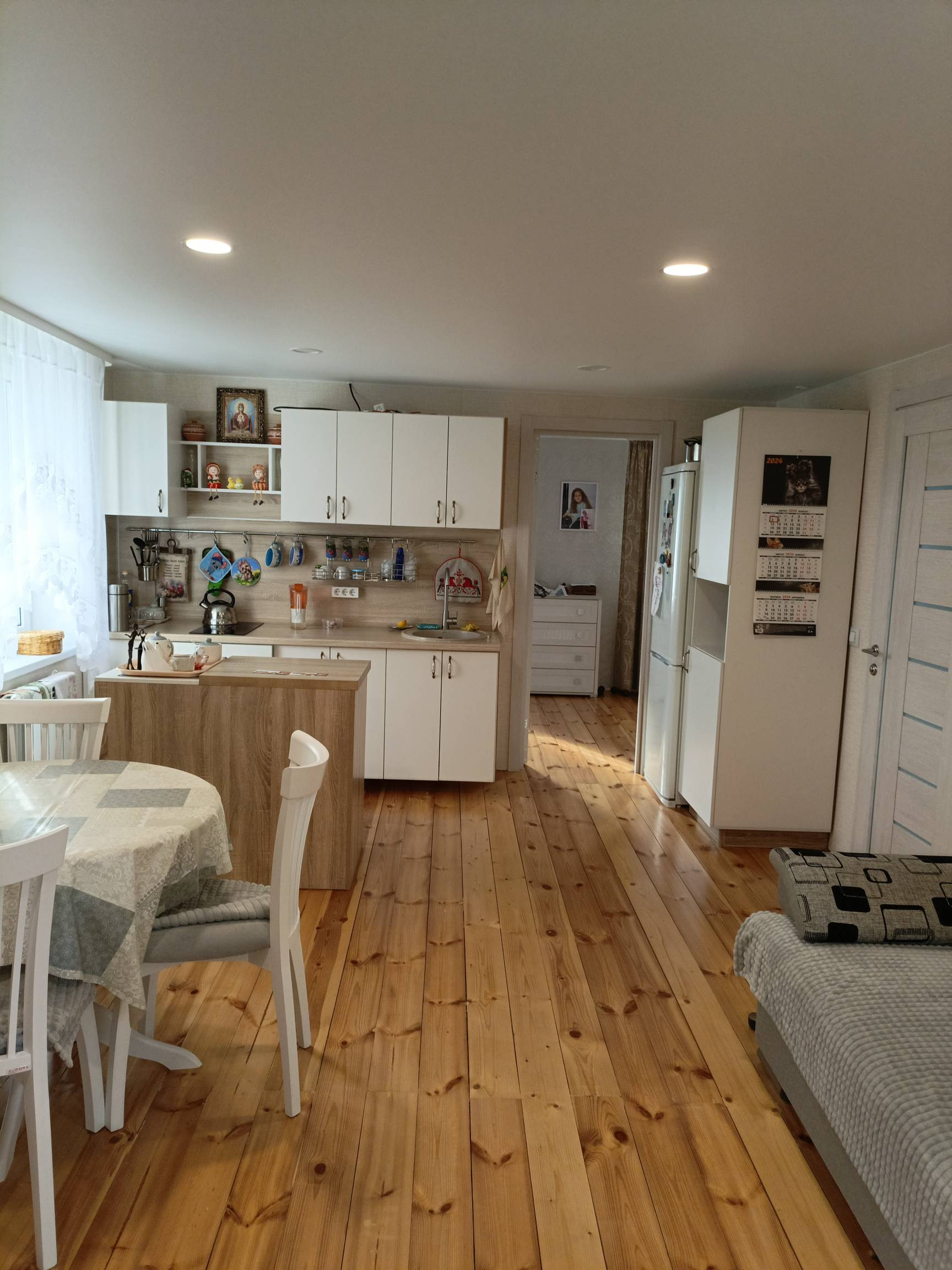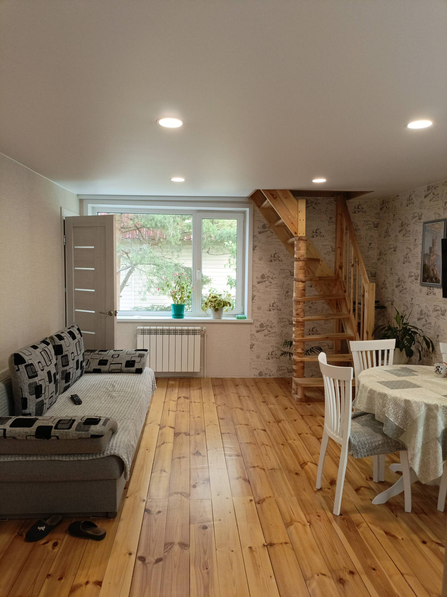 На втором этаже кухня - гостинная, спальня и санузел. Сделан свежий ремонт, новая электрика по дому, новые трубы. Установлены новые стены, обшиты гипсокартоном и поклеены. Полностью заменен пол, сделан из дерева и покрыт лаком. Также заменена лестница 2 этажа. В доме натяжные потолки, поклеены свежие обои. Остается кухонная мебель, душевая кабина, унитаз, раковина.