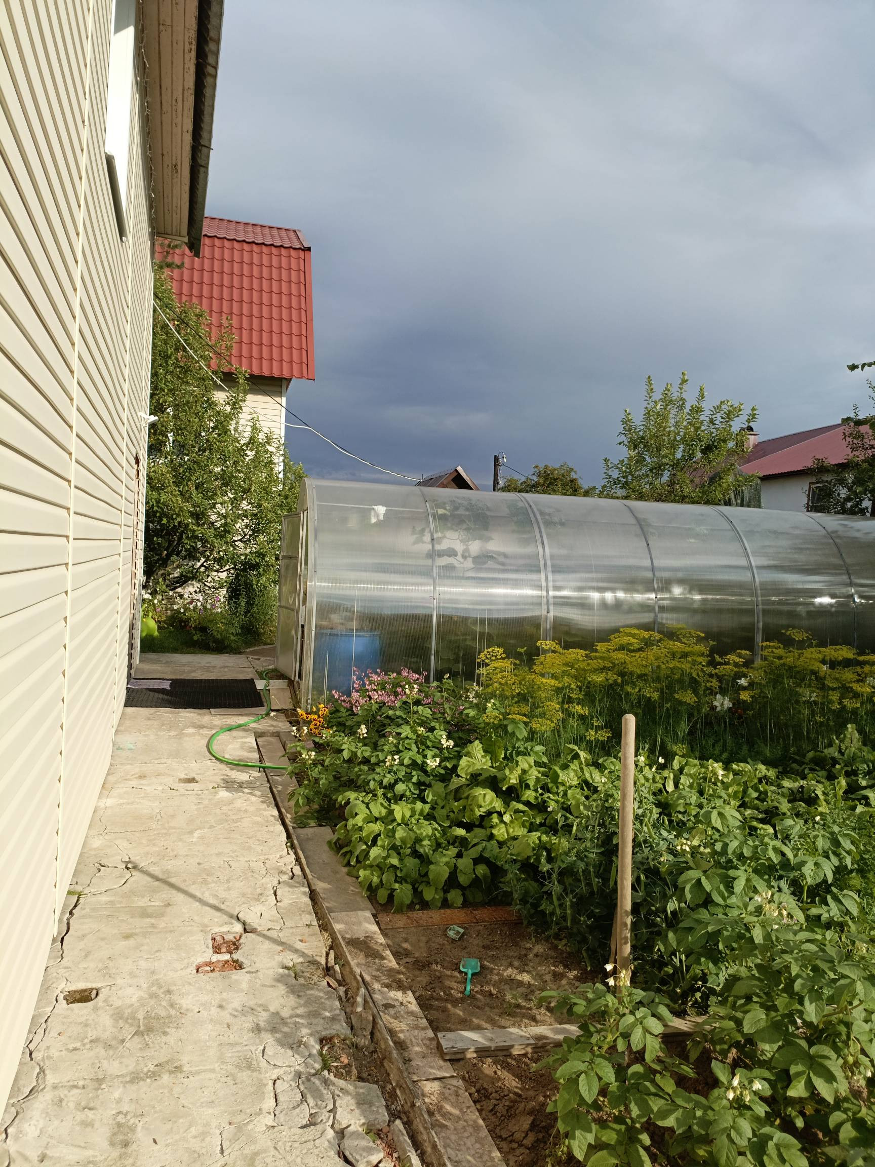 На участке стоит баня, теплица( огурцы, помидоры), различные посадки, кусты и деревья (клубника, малина, смородина красная и черная, вишня, слива, ирга, яблоня, черемуха, облепиха, калина, боярышник).