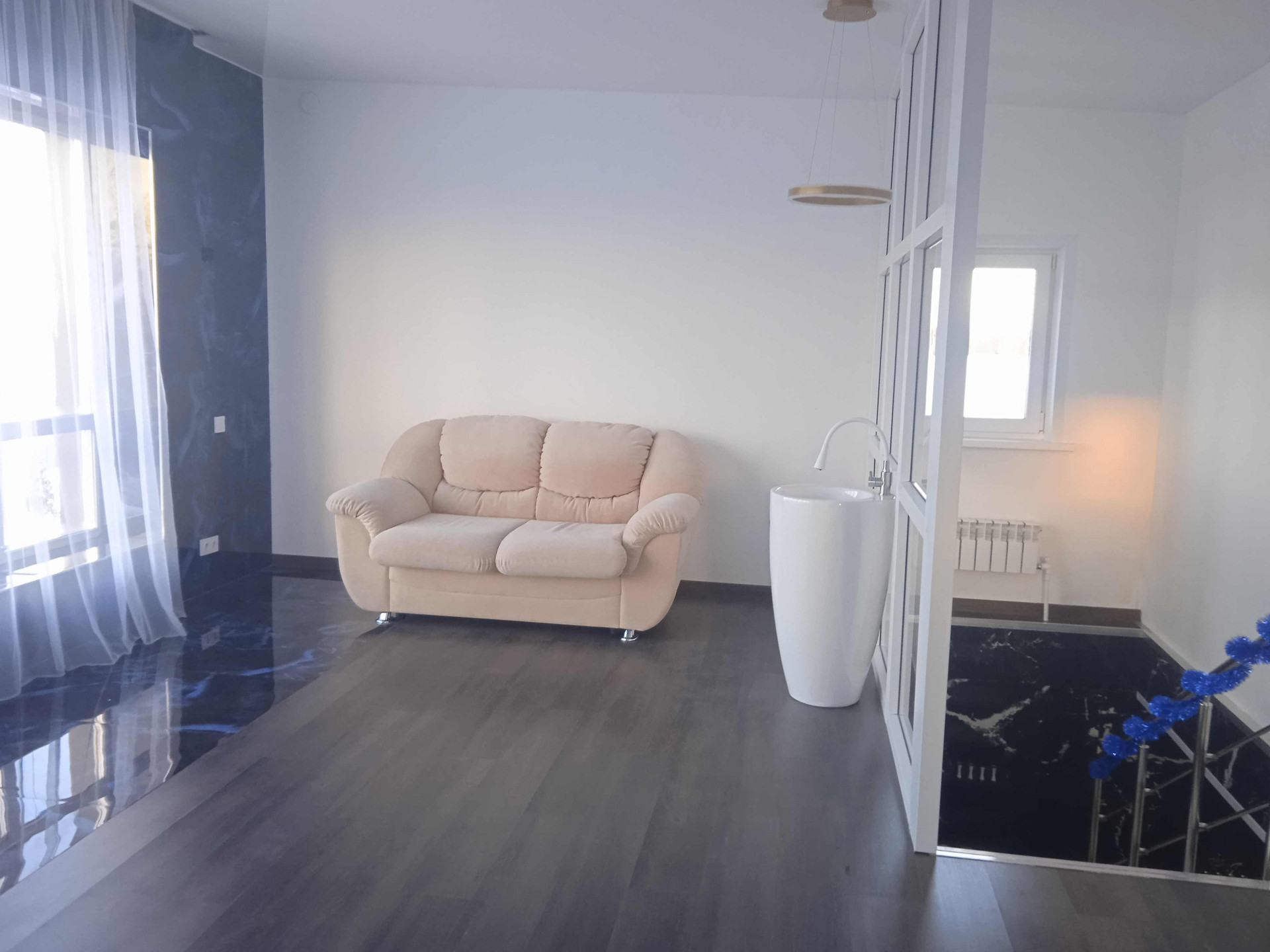 1 эт - гостиная-столовая, санузел, по всей площади теплые полы, лестница