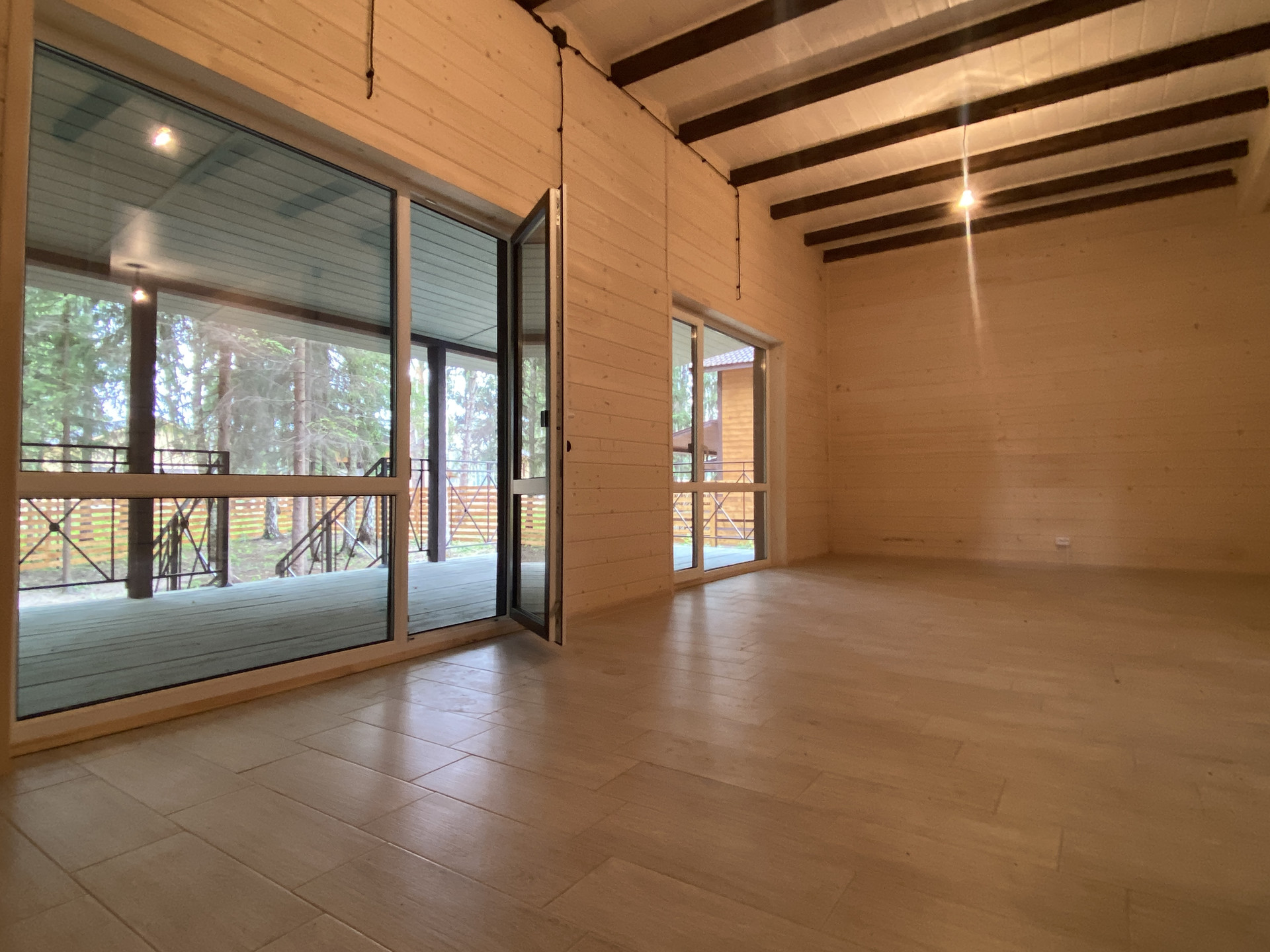 — Смонтирован натяжные потолки на первом этаже;