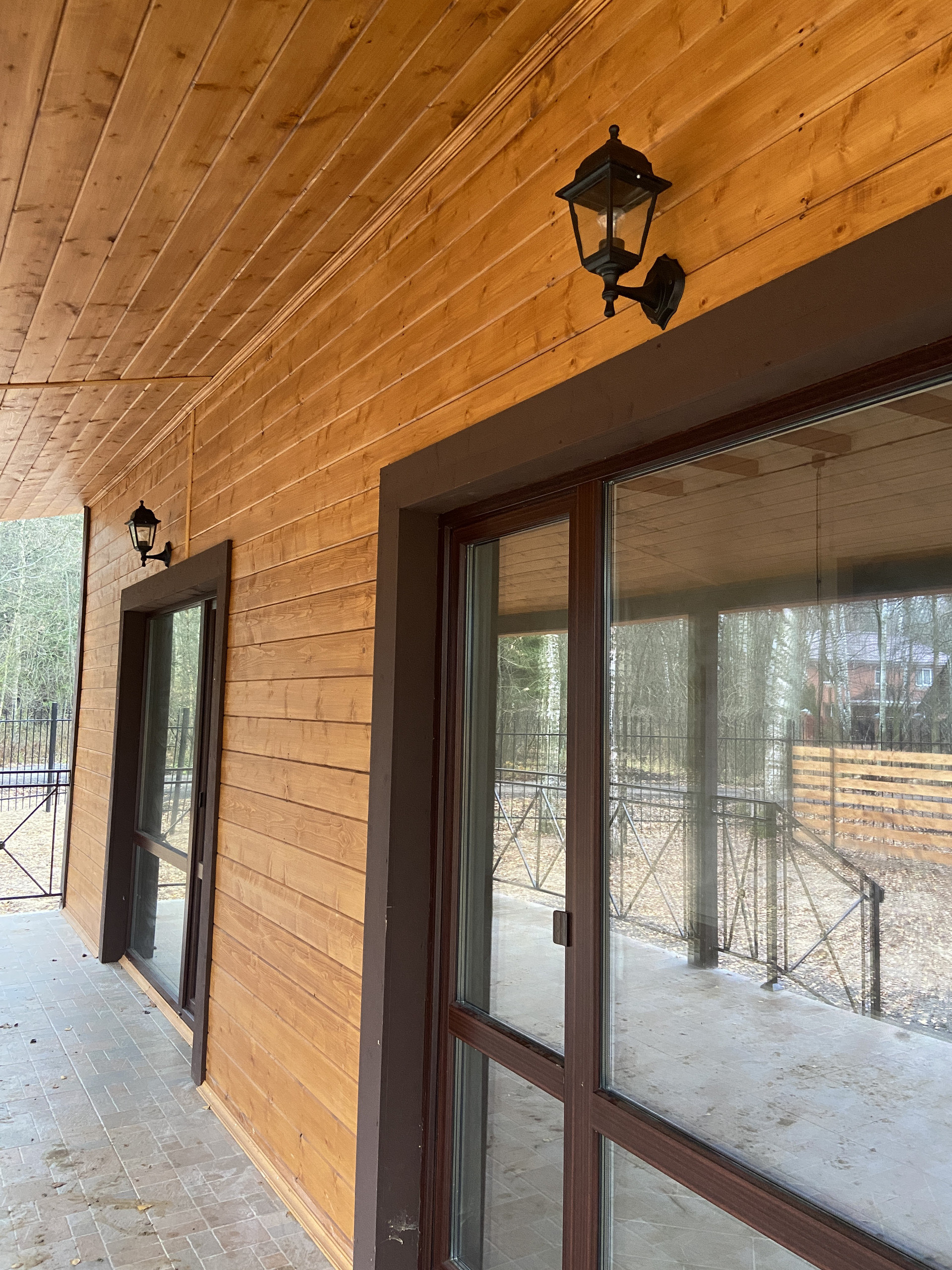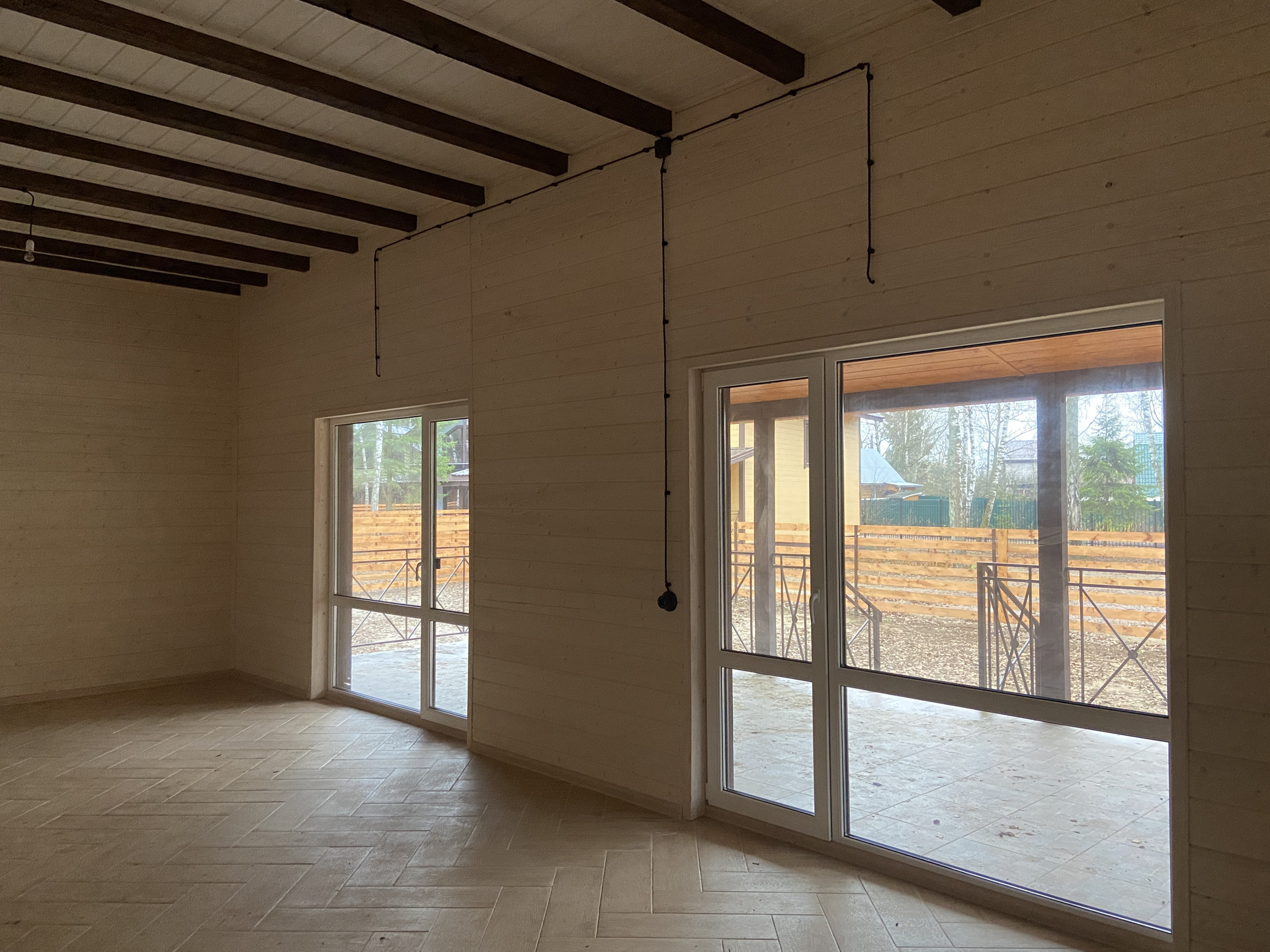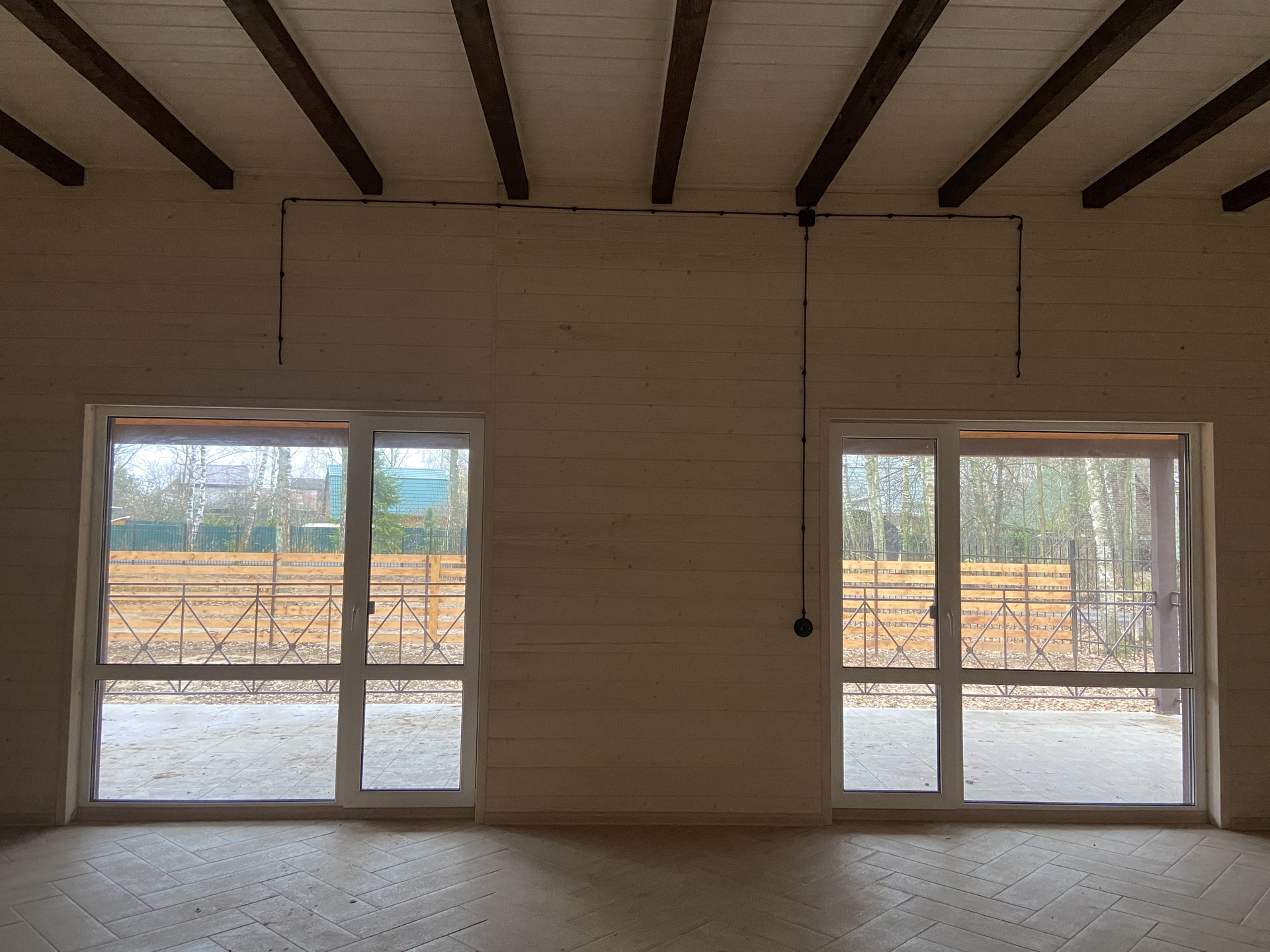 — Смонтирован натяжные потолки на первом этаже;