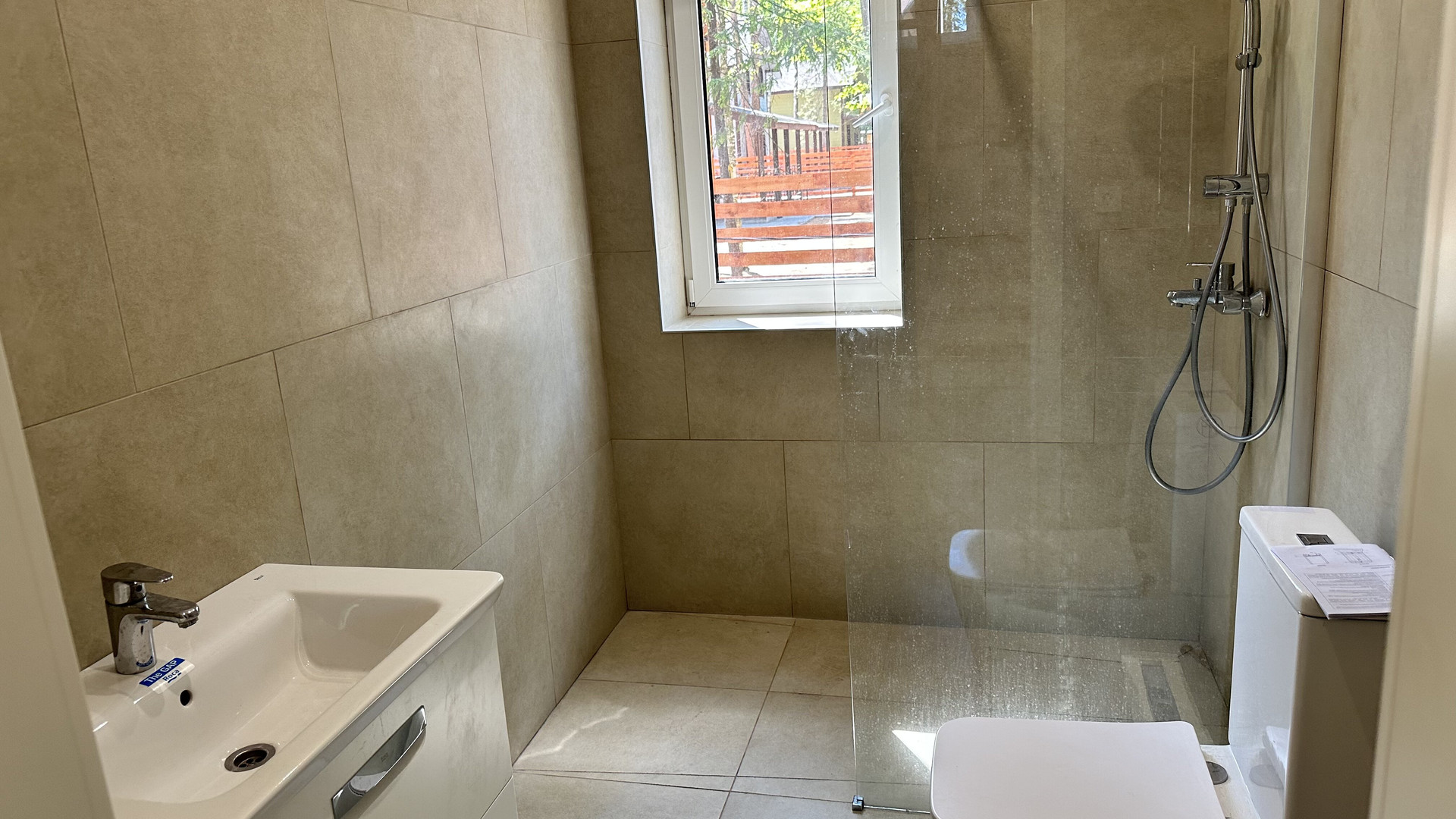 — Уложен керамогранит в санузлах, установлена сантехника на 1-м этаже;