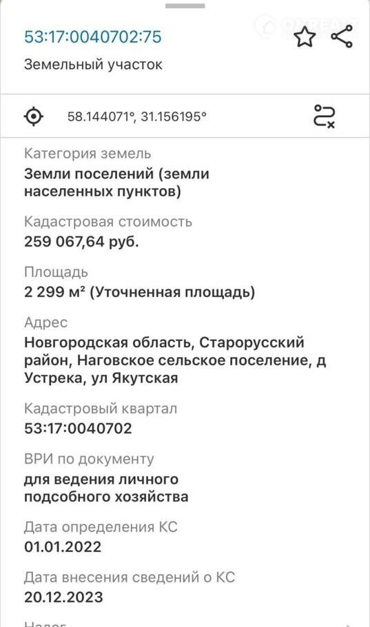 Старорусский р-н, д. Устрека -23 сотки;