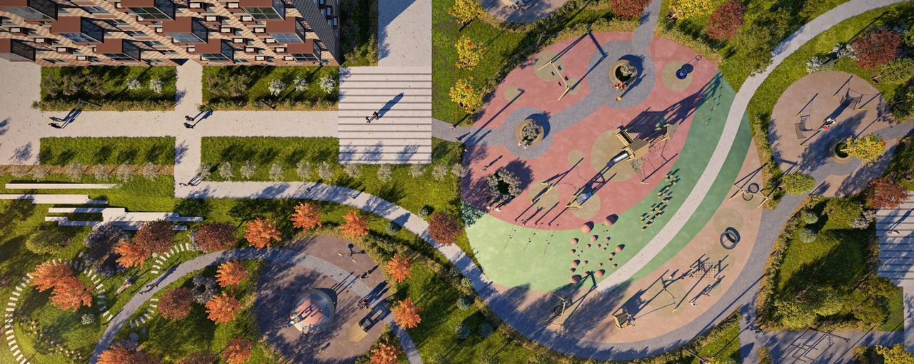 Чтобы жители квартала чувствовали простор и получали больше солнечного света, мы построим дома разной высоты. Во дворах появятся уютные парки с детскими площадками и местами для отдыха — здесь можно поболтать с соседями, почитать в тени или позаниматься йогой. Спортивные площадки мы разместим так, чтобы шум от них не мешал жителям.