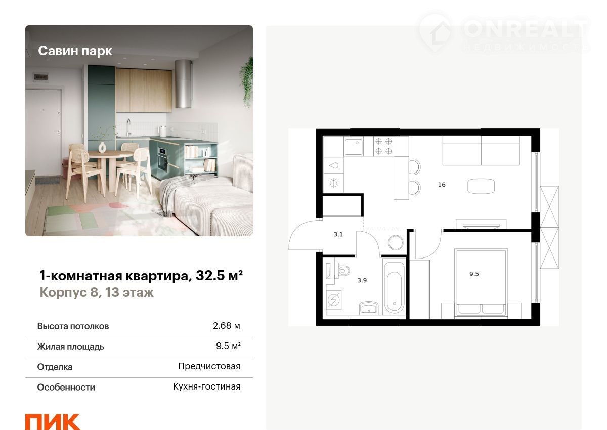 Продаётся 1-комн.квартира площадью 32.50 кв.м на 13 этаже 25 этажного дома (Корпус 8, секция 1) проекта ПИК Савин парк. Светлый просторный подъезд на уровне земли, функциональная планировка, большие окна, с отделкой. Артикул - 985721