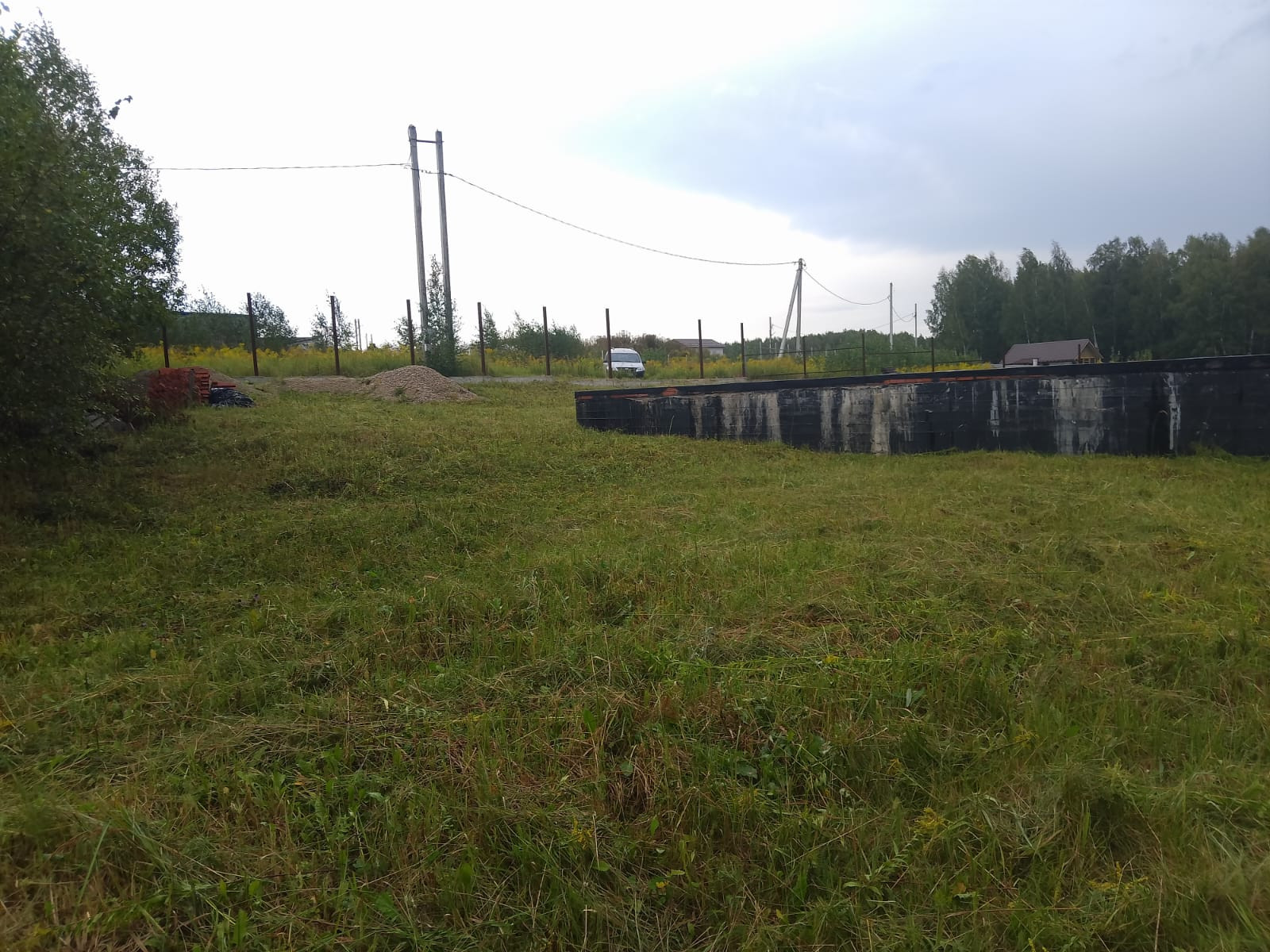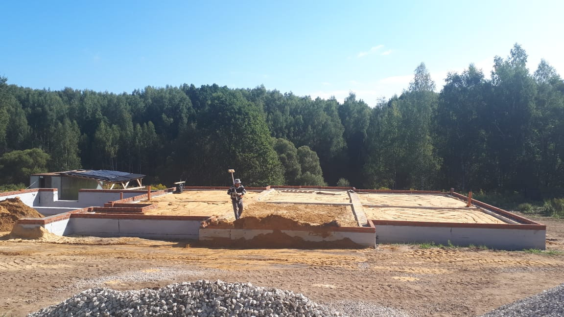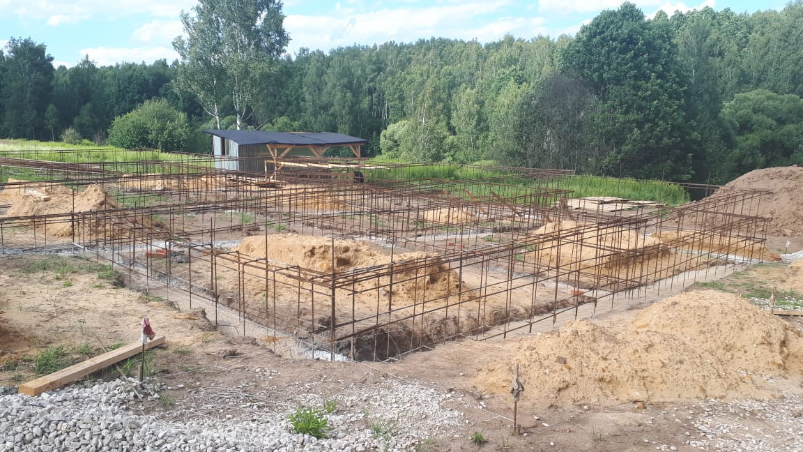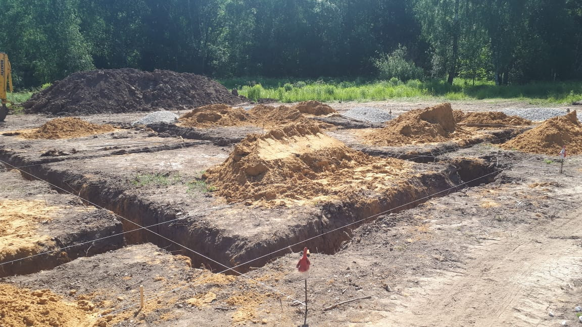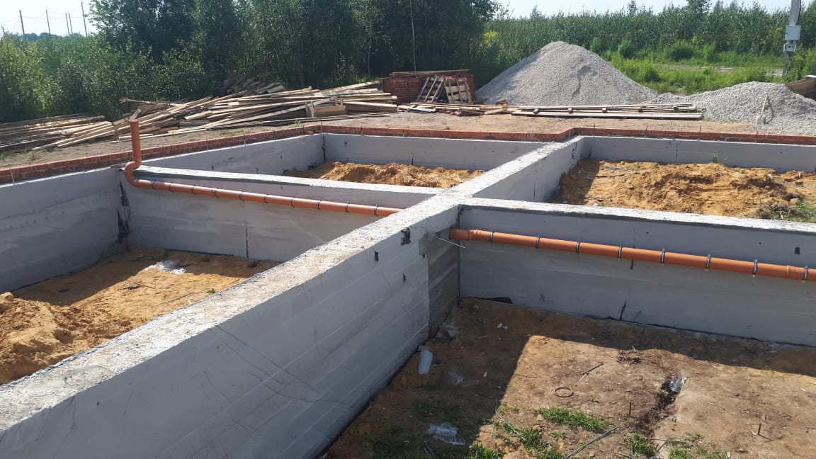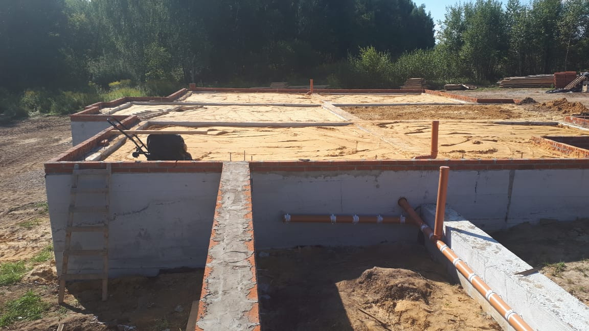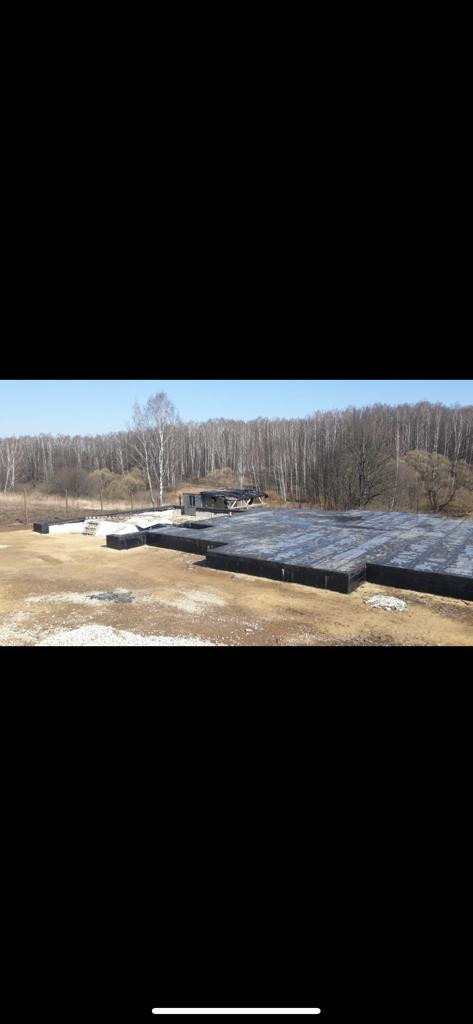 На участке залита бетонное основание под забор и уже имеется залитый ленточный фундамент, плюс плита первого этажа. Монолитный фундамент имеет большую прочность и высокую несущую способность за счет добавления гранитной крошки, защищен от воды гидроизоляцией (2 слоя), выполнена кирпичная кладка для амортизации нагрузки, для поднятия уровня цоколя и защиты от атмосферных осадков,