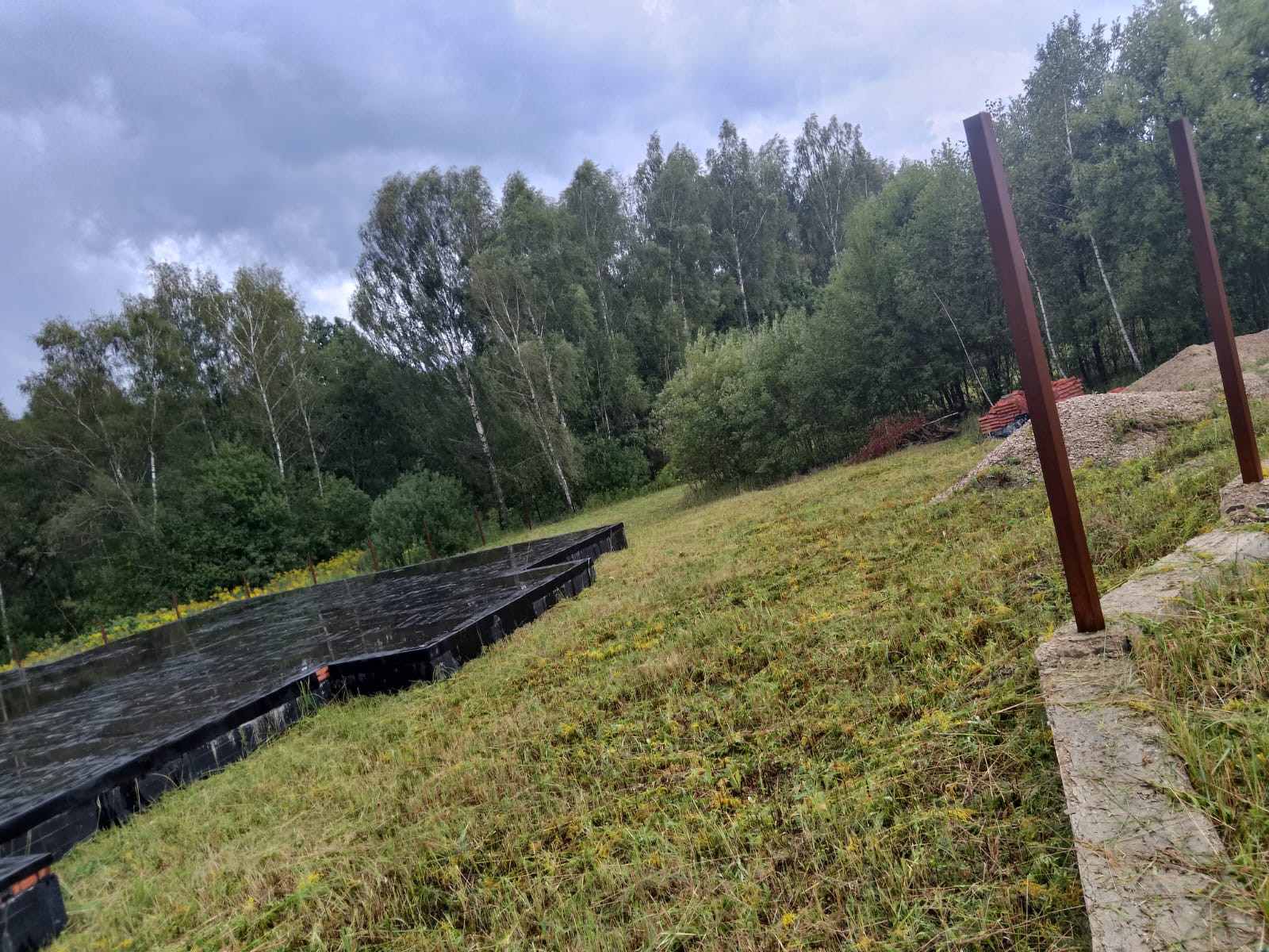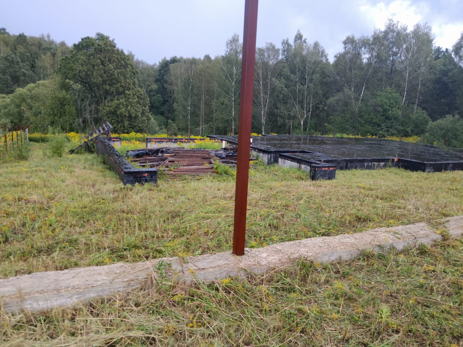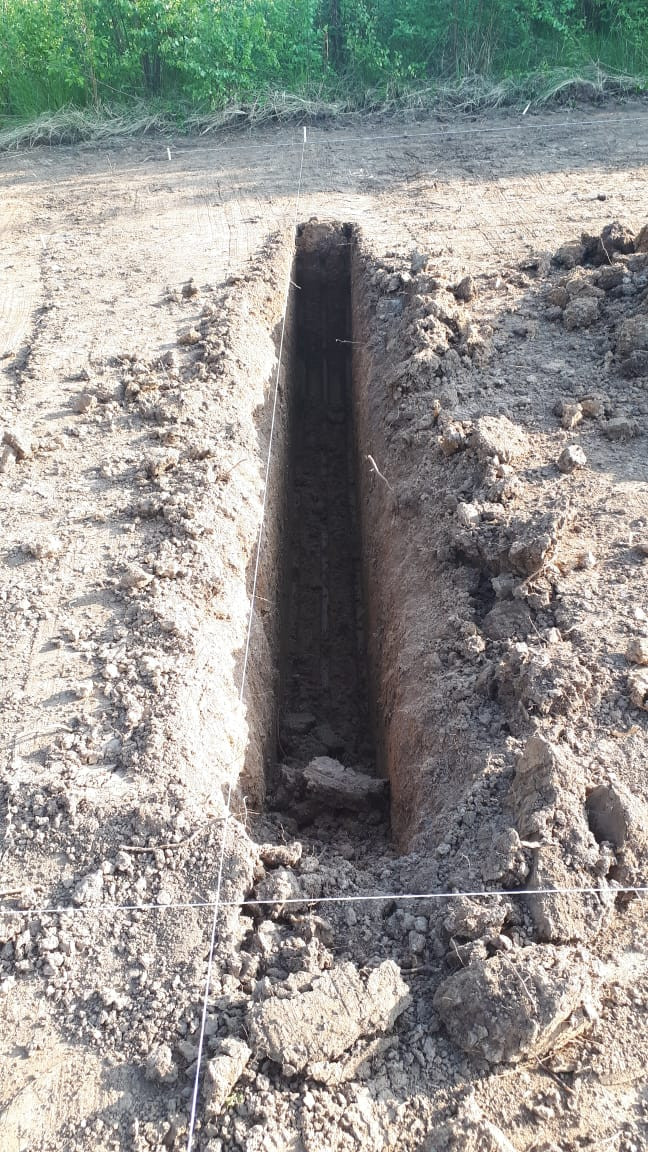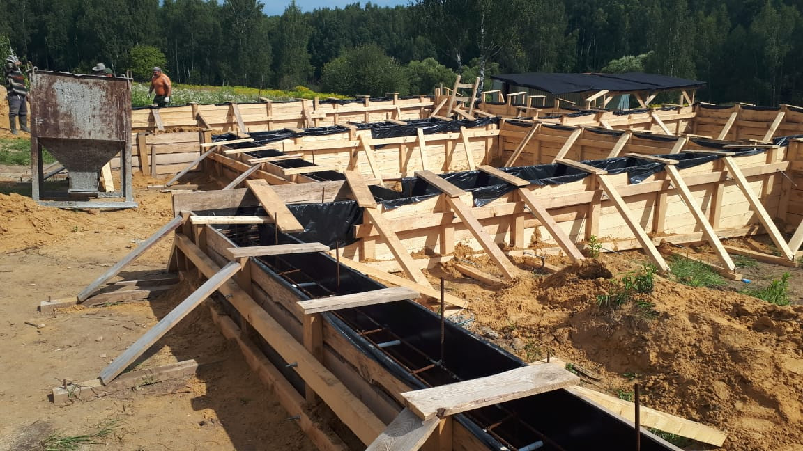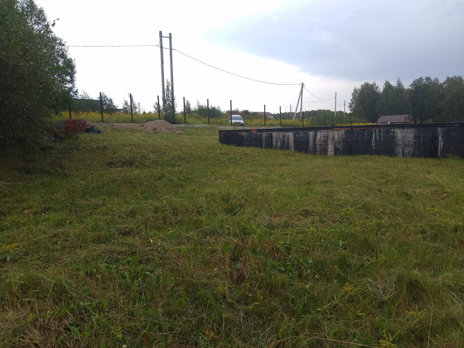 На участке залита бетонное основание под забор и уже имеется залитый ленточный фундамент, плюс плита первого этажа. Монолитный фундамент имеет большую прочность и высокую несущую способность за счет добавления гранитной крошки, защищен от воды гидроизоляцией (2 слоя), выполнена кирпичная кладка для амортизации нагрузки, для поднятия уровня цоколя и защиты от атмосферных осадков,