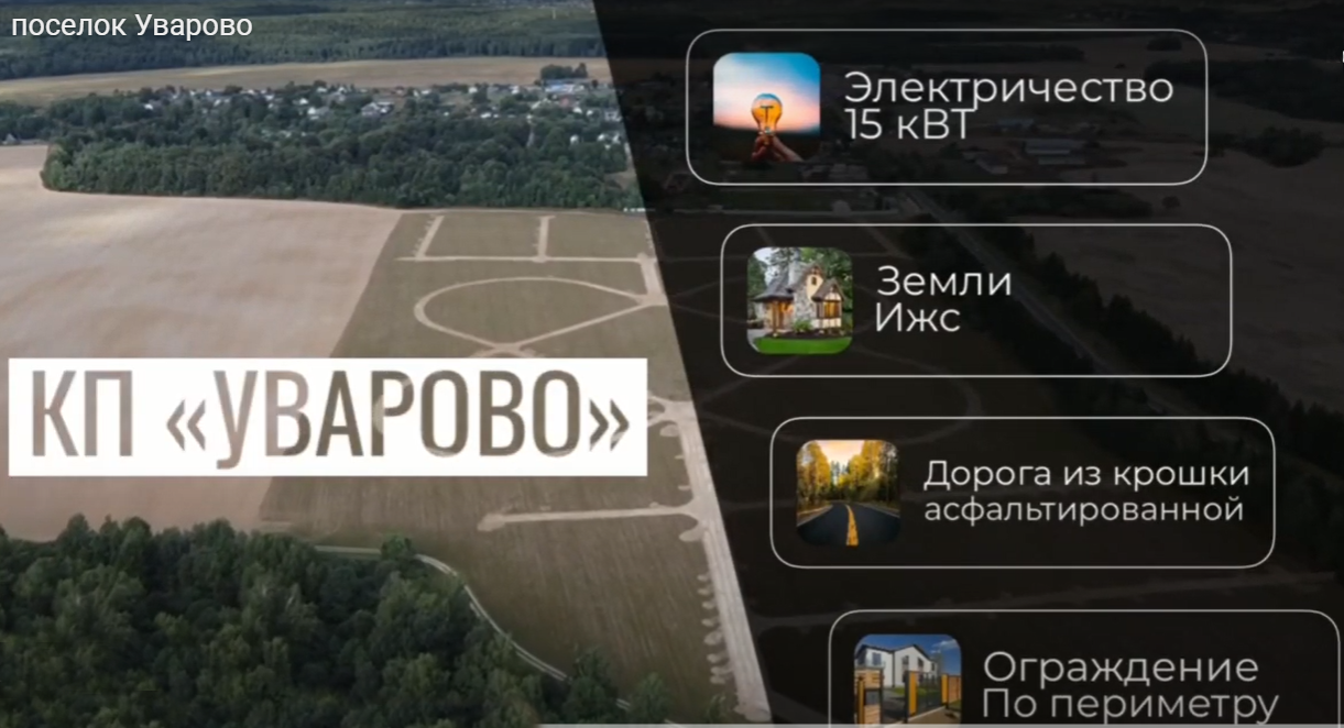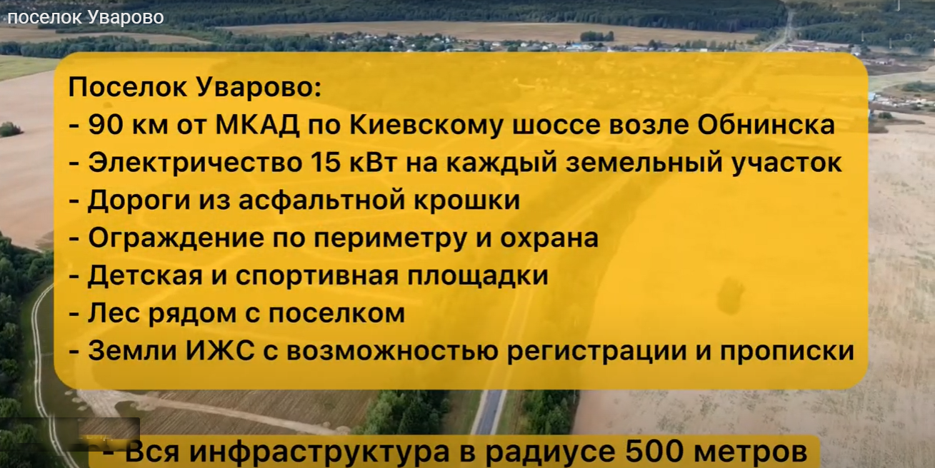 Поселок Уваровское, один из самых перспективных и ожидаемых проектов, обладающий рядом уникальных преимуществ. - это место отдыха на свежем воздухе в близи лесного массива. Вид назначения земли - ИЖС! Это позволяет Вам строительство в данном месте дома, для постоянного проживания. Этому способствует и относительная близость городской инфраструктуры Обнинска (всего 8 км). В поселке запланированы участки от 6 до 15 соток. План развития поселка - строительство дорог с твёрдым покрытием, внешнего ограждения поселка, контрольно-пропускного пункта с гостевой парковкой, детской площадки и спортивного городка, а так же зон общественного пользования. Подключение к электричеству 15 Квт - по Федеральной программе. В 300 метрах от поселка пруд для рыбалки. Начало строительства запланировано на весну 2023 года. Продажа участка возможна в БЕСПРОЦЕНТНУЮ РАССРОЧКУ на 24 месяца с первоначальным взносом  20%. Продуктовый магазин: дойти до магазина можно за 10 минут. Автобусная остановка: дойти до остановки “Уваровское” можно за 15 минут. Школа: Находится в ближайшей доступности в Боровске. Доехать до школы на личном транспорте можно за 7 минут. Детский сад: Доехать до детского сада на личном транспорте можно за 7 минут. Больница: Находится в ближайшей доступности в Боровске. Доехать до больницы на личном транспорте можно за 7 минут.