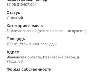 Кадастровый номер: 37:05:010407:21. Земельный участок 1141 кв.м., сухой. Разрешенное использование: ЛПХ. По границе электричество. Рядом колодец. |