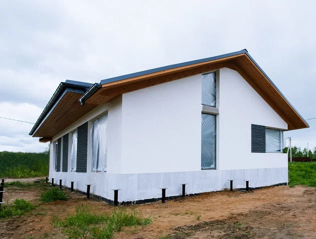 декоративная штукатурка с деревянными вставками и минераловатным утеплением 100 мм