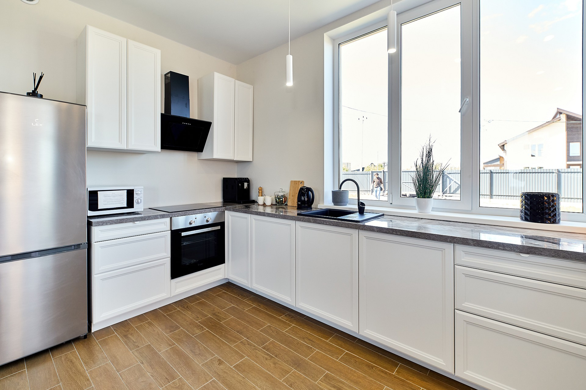 Наполнение: Кухонный гарнитур, вытяжка, варочная панель, духовой шкаф, сантехника