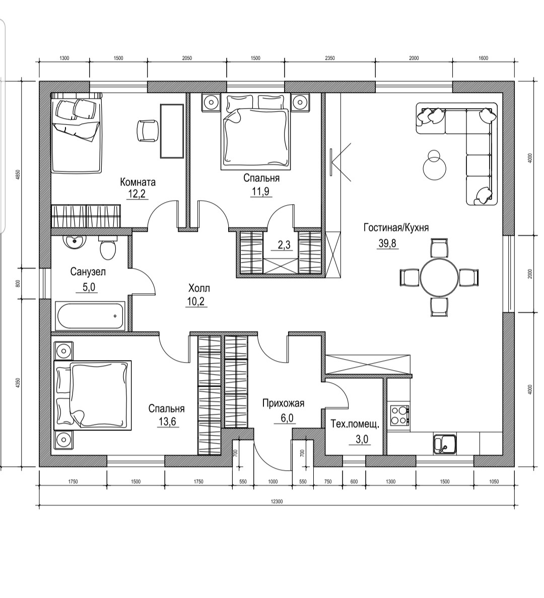 Продуманная планировка:Светлая кухня-гостиная 40 кв.м,3 спальни-12,12 и 14кв.м,Холл,Сан.узел,Бойлерная.Водяные теплые полы(система отопления)с регулировкой температурного режима.