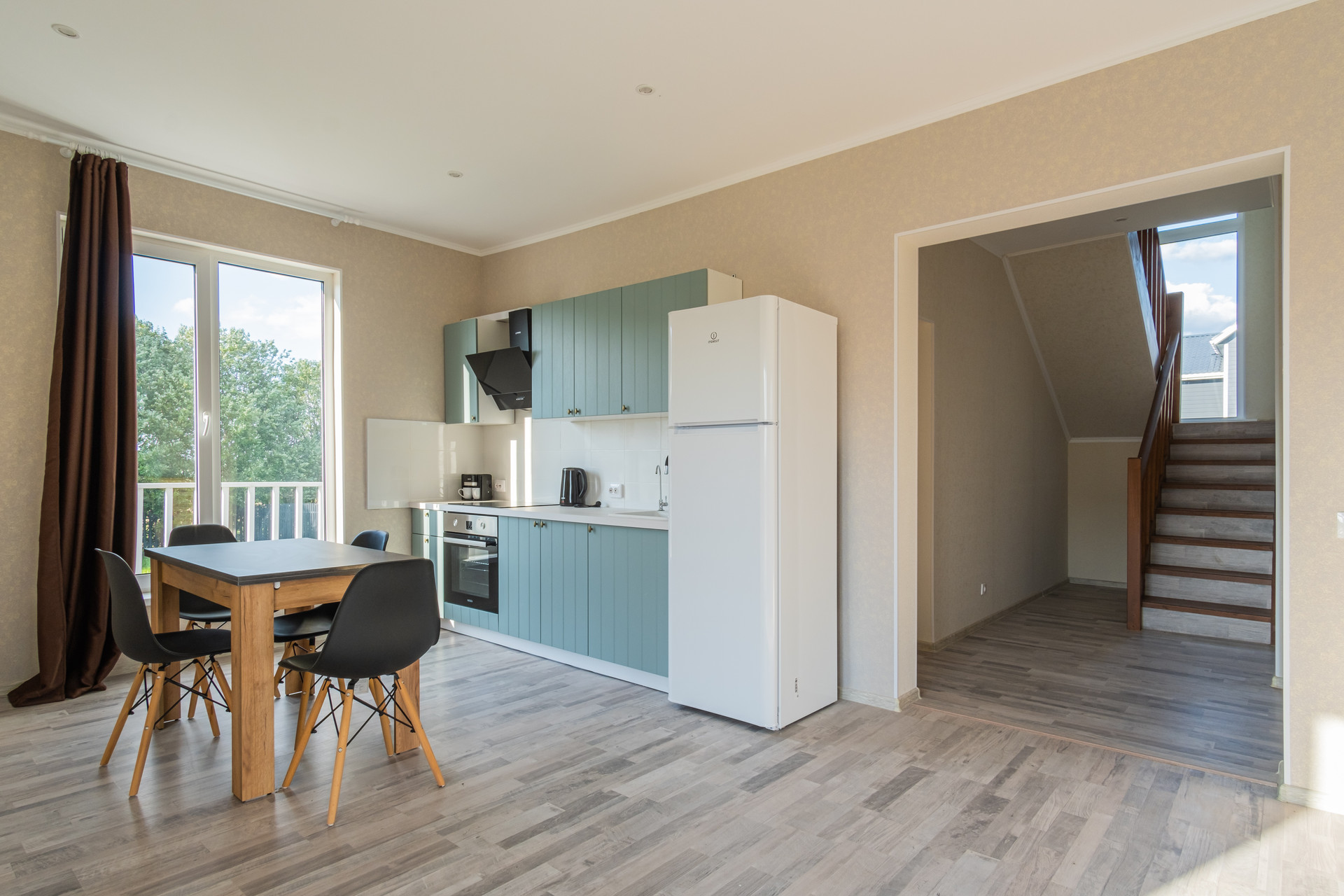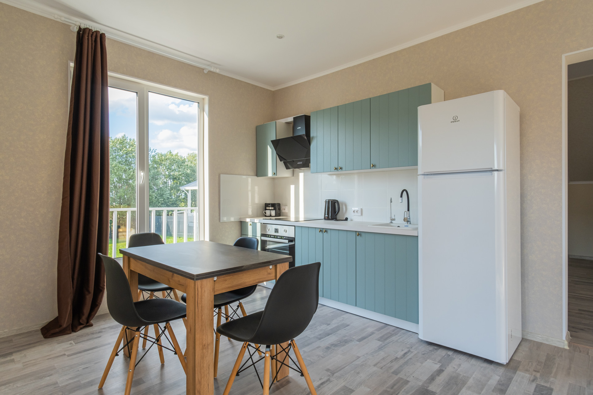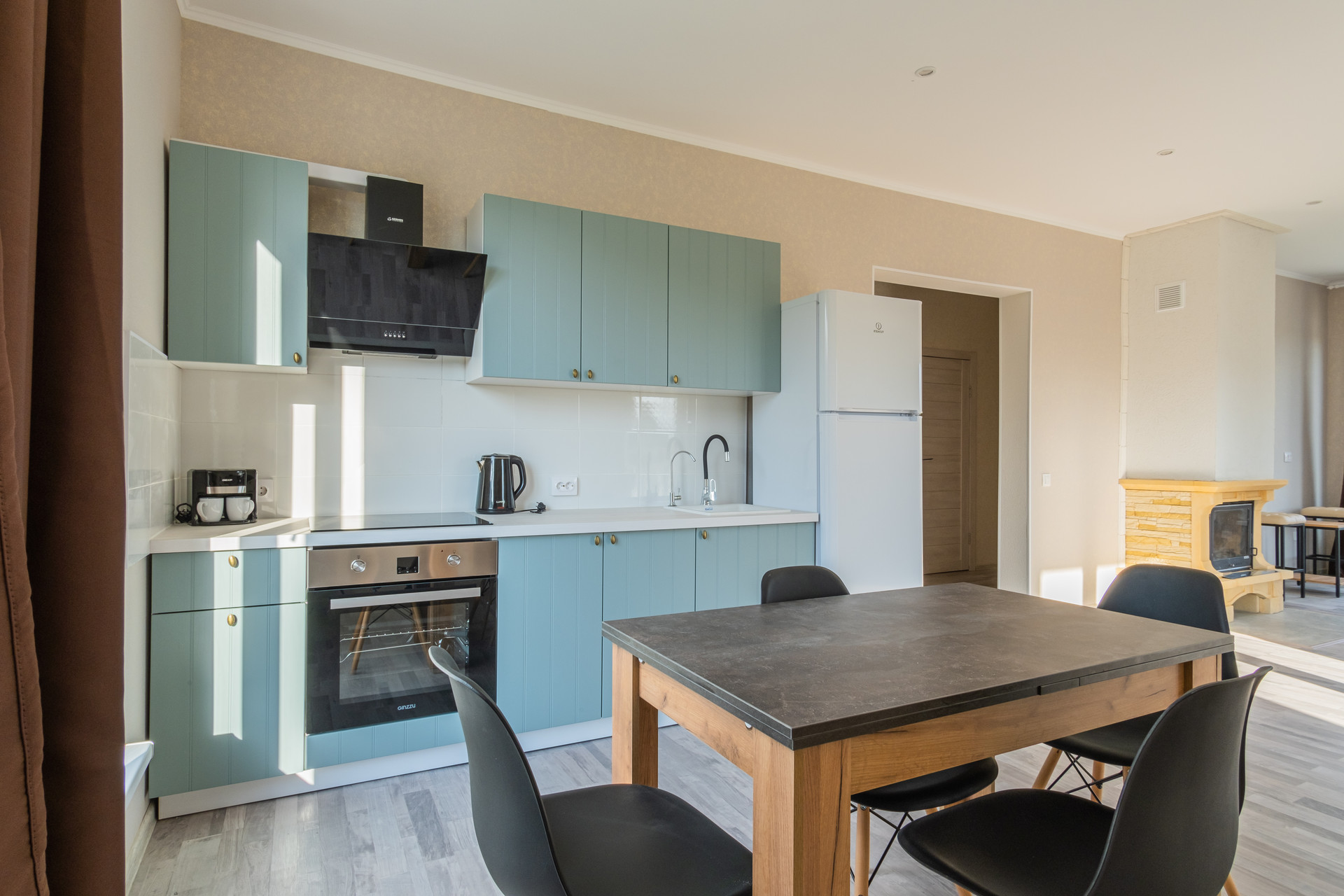 • полностью оборудованная кухня с встроенной варочной панелью и встроенным духовым шкафом;